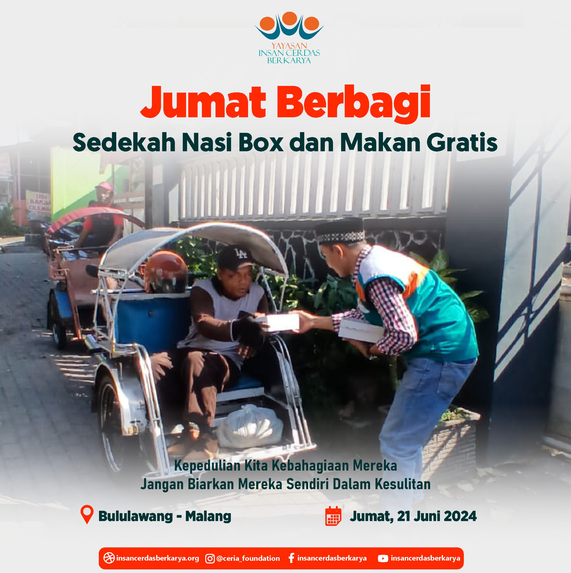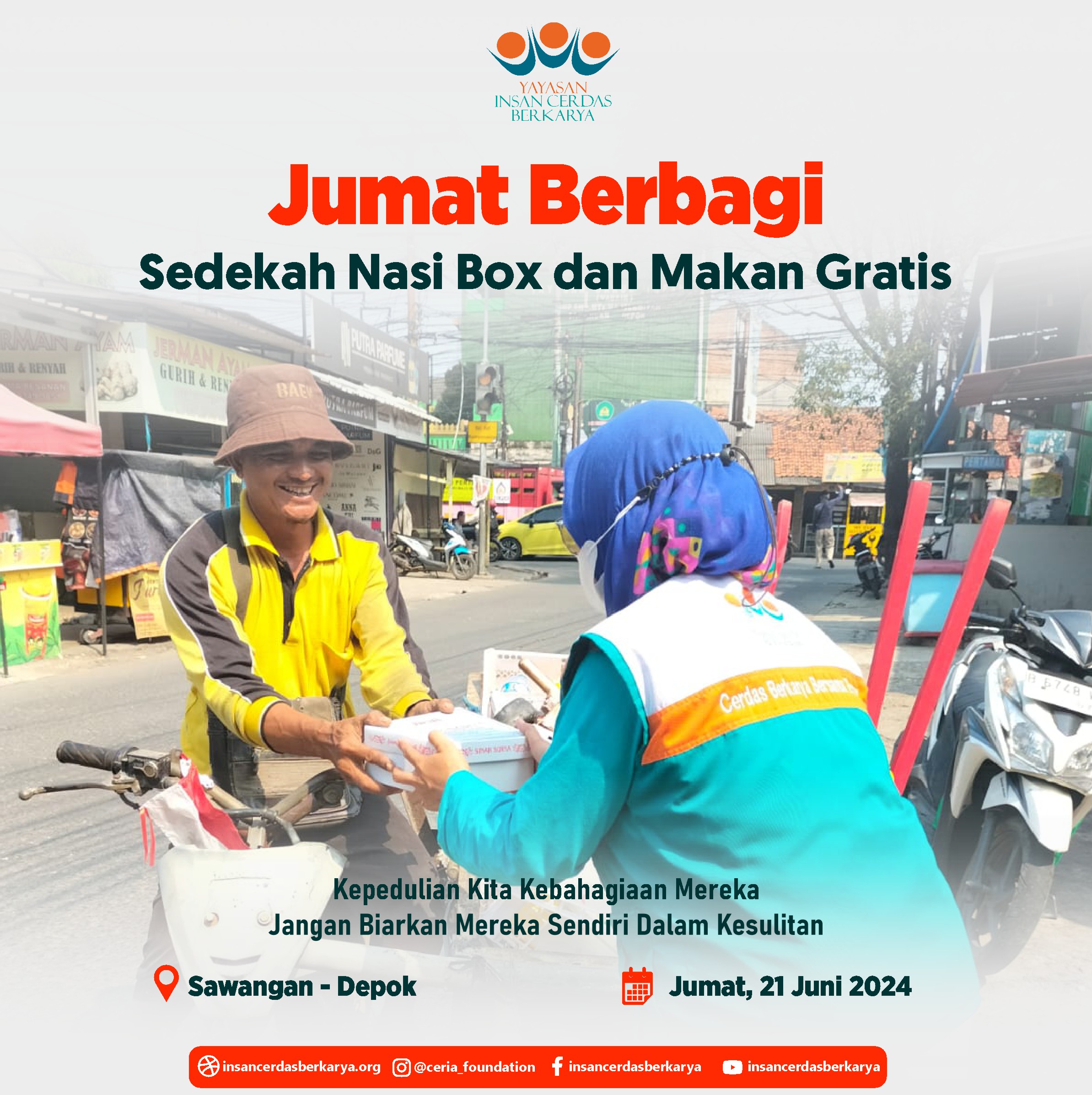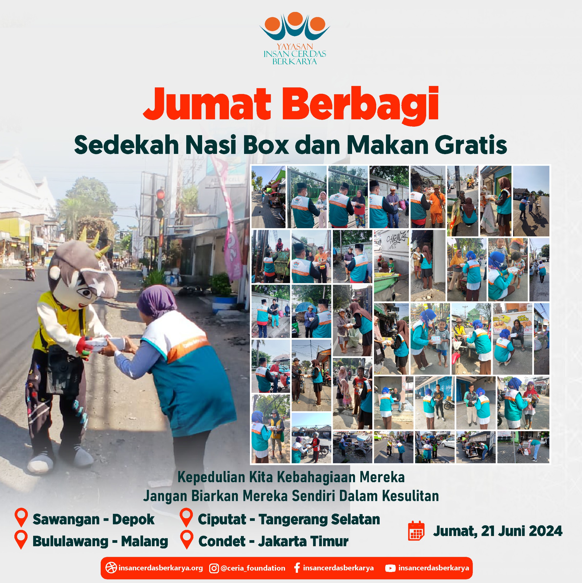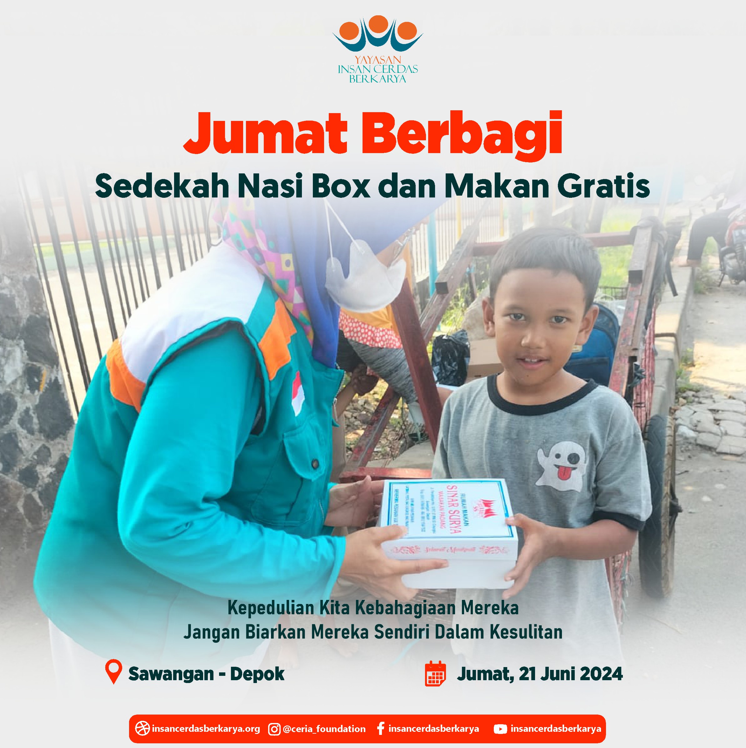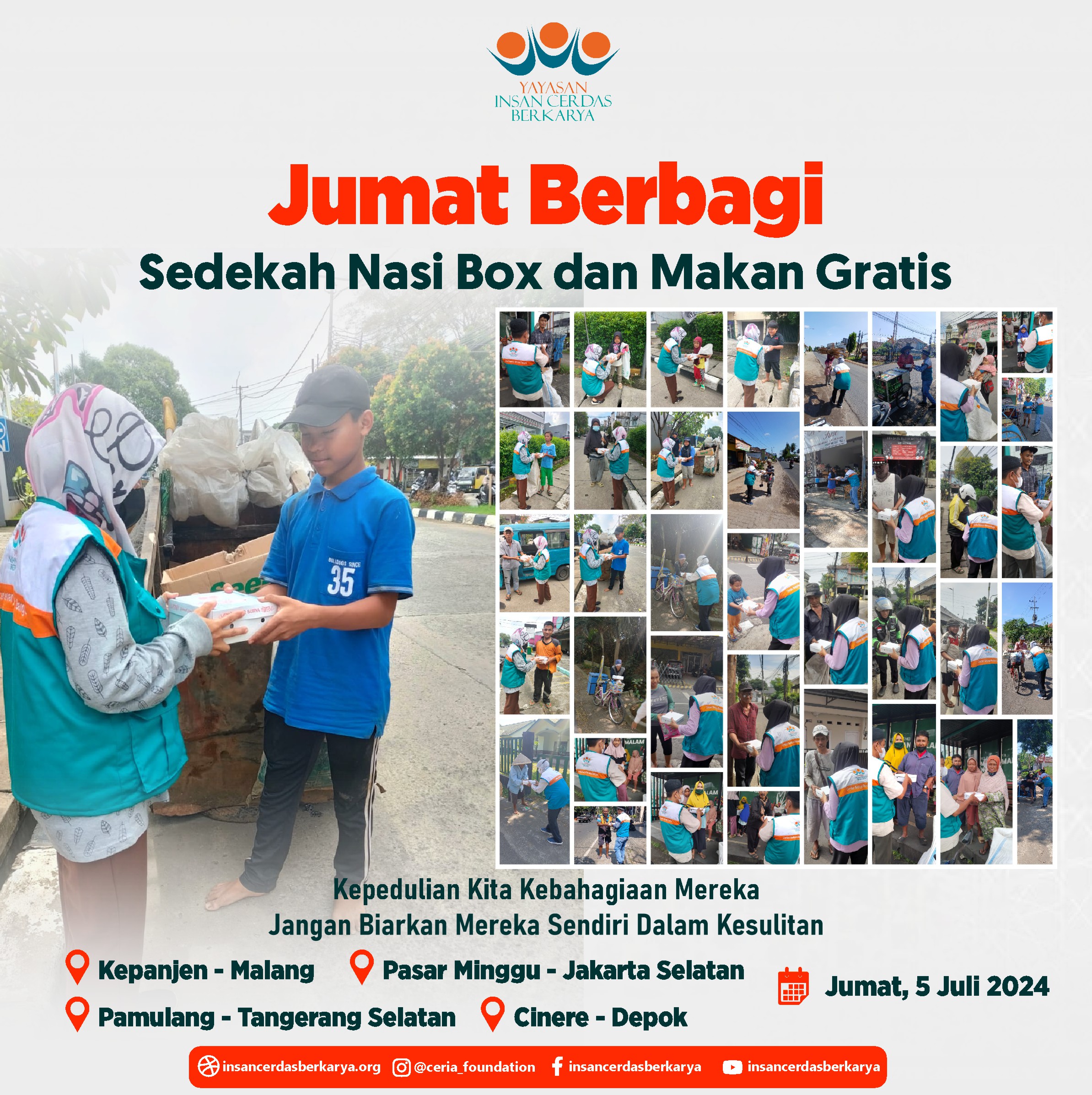 Alhamdulillahirrabbi’alamiin mengucap syukur atas terlaksananya program Rutin Jum’at Berbagi Nasi Box bantu UMKM pada tanggal 28 Juni 2024 kembali membagikan 400 nasi box kepada anak-anak yatim binaan di Cinangka Sawangan Depok dan kepada pemulung, pengamen juga pekerja jalanan di 4 titik yaitu : Kepanjen – Malang Jawa Timur, Pasar Minggu – Jakarta Selatan, Pamulang – Tangerang Selatan dan Cinere – Depok.