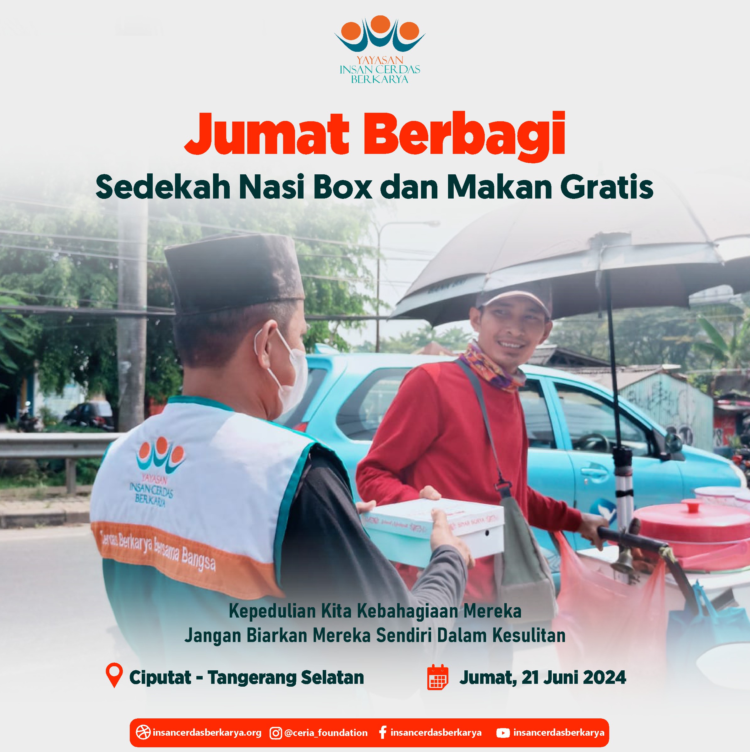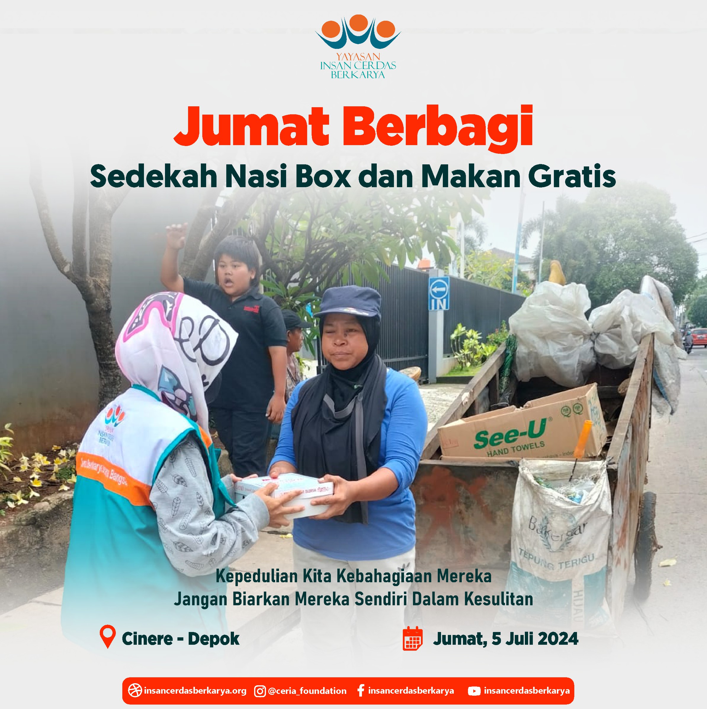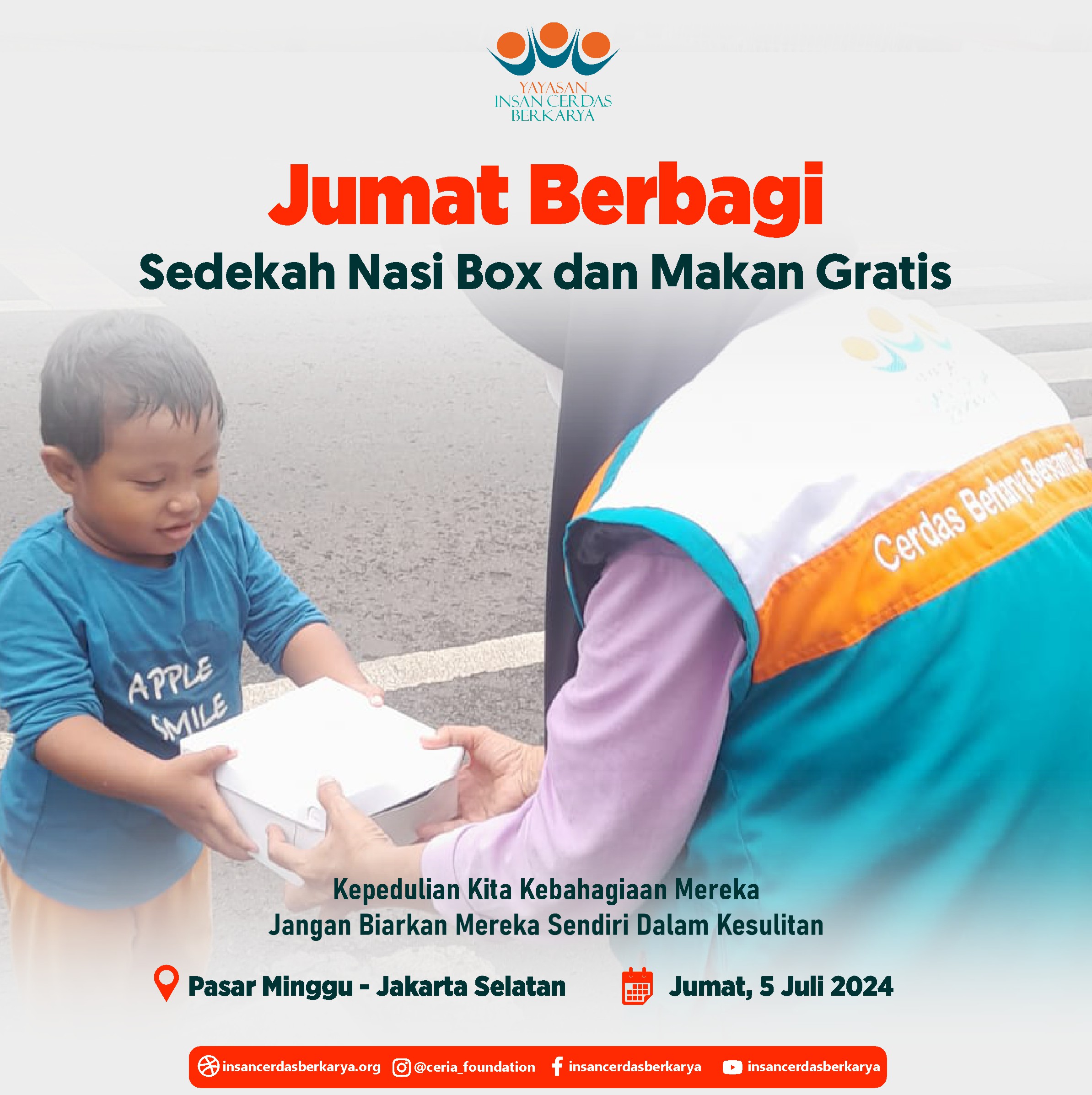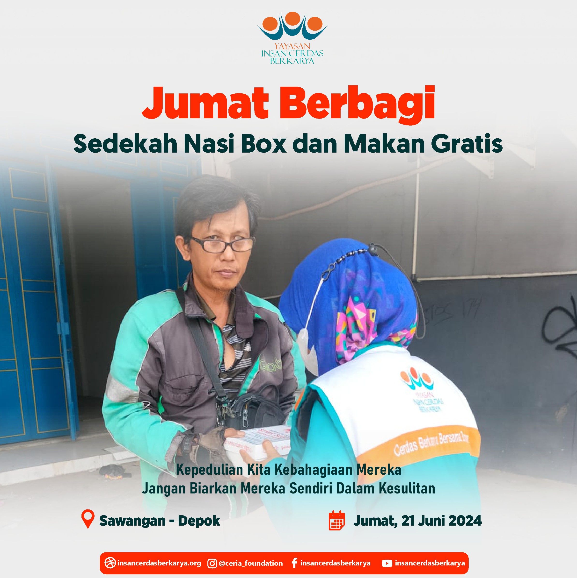 Alhamdulillahirrabbi’alamiin mengucap syukur atas terlaksananya program Rutin Jum’at Berbagi Nasi Box bantu UMKM pada tanggal 28 Juni 2024 kembali membagikan 400 nasi box kepada anak-anak yatim binaan di Cinangka Sawangan Depok dan kepada pemulung, pengamen juga pekerja jalanan di 4 titik yaitu : Kepanjen – Malang Jawa Timur, Pasar Minggu – Jakarta Selatan, Pamulang – Tangerang Selatan dan Cinere – Depok.