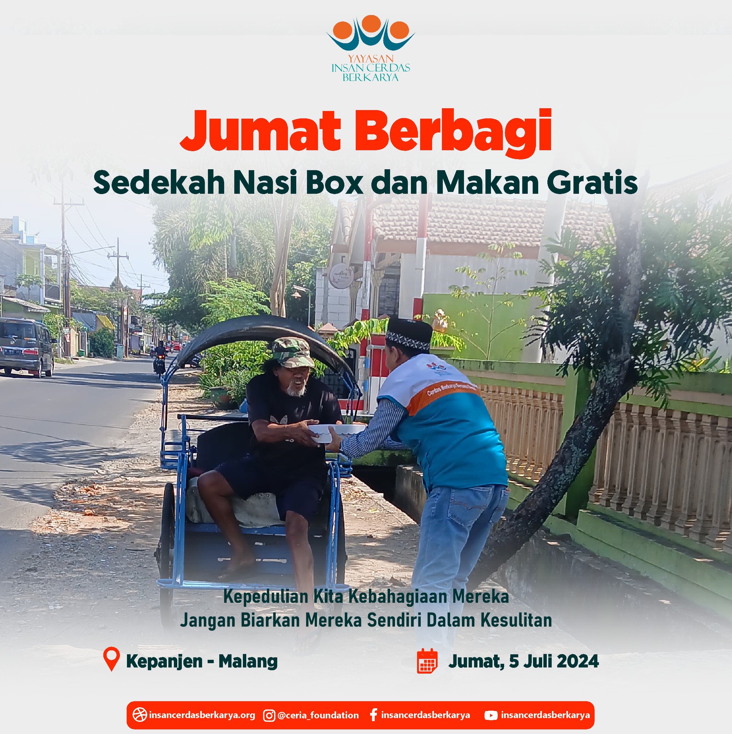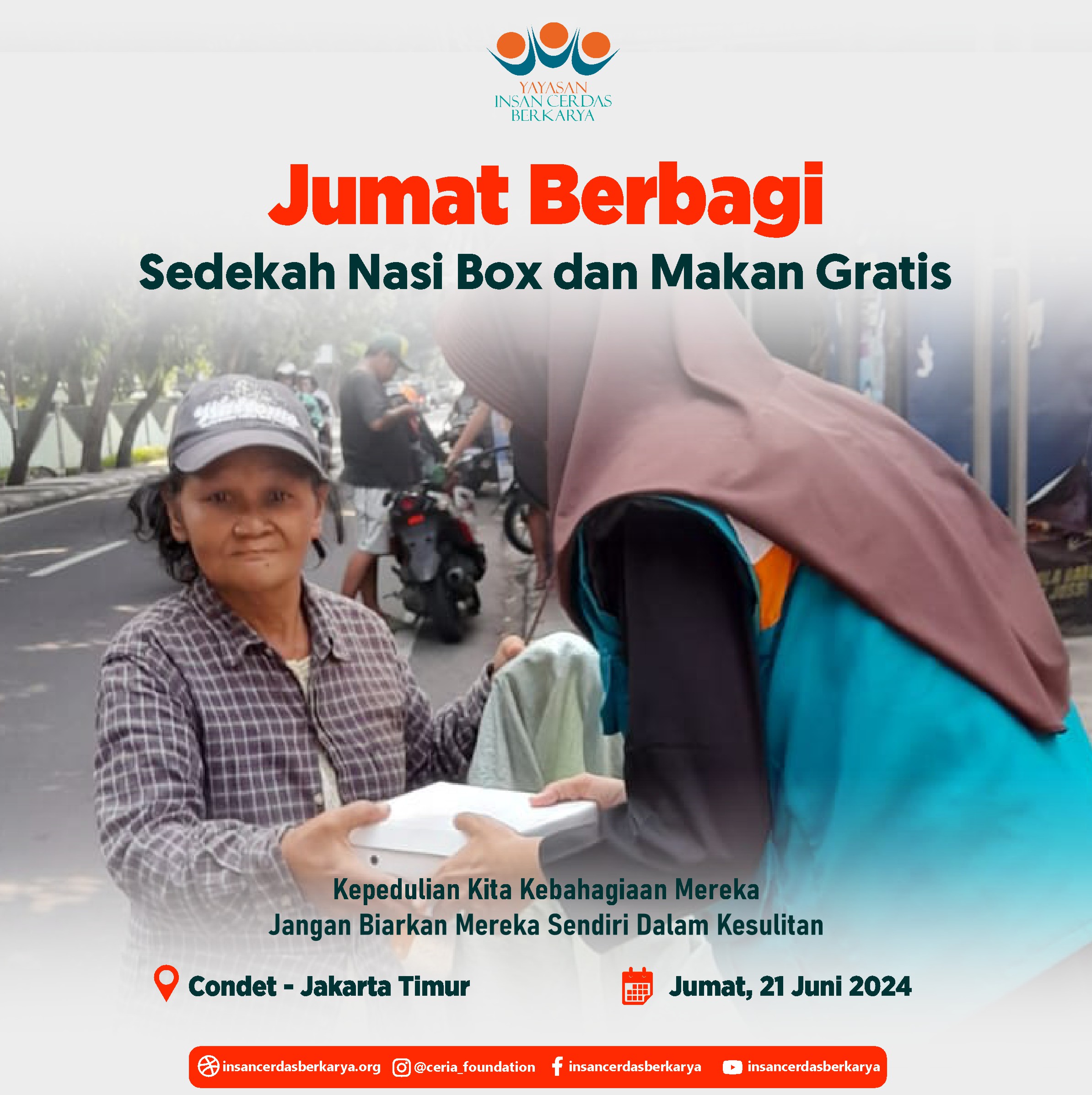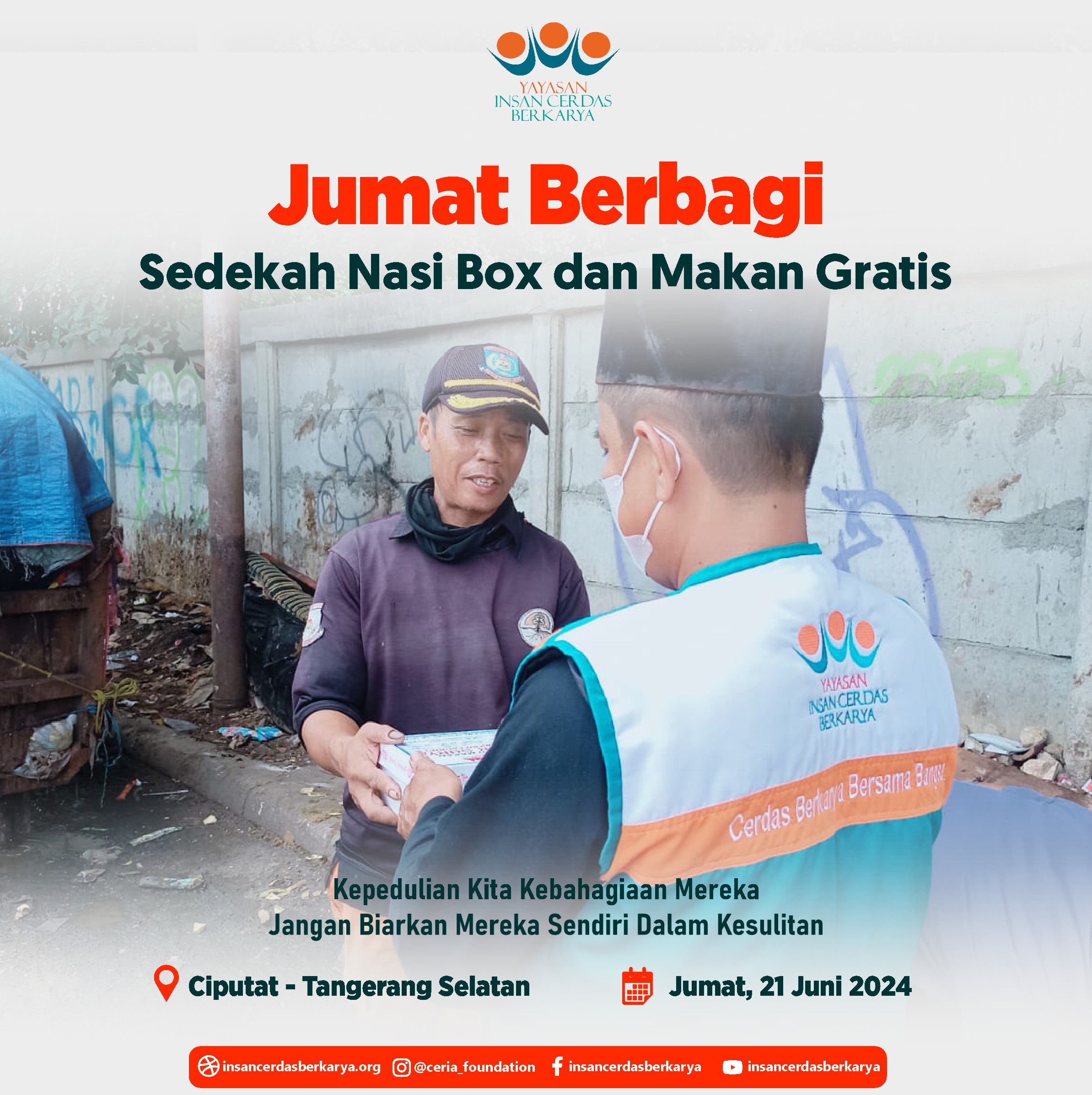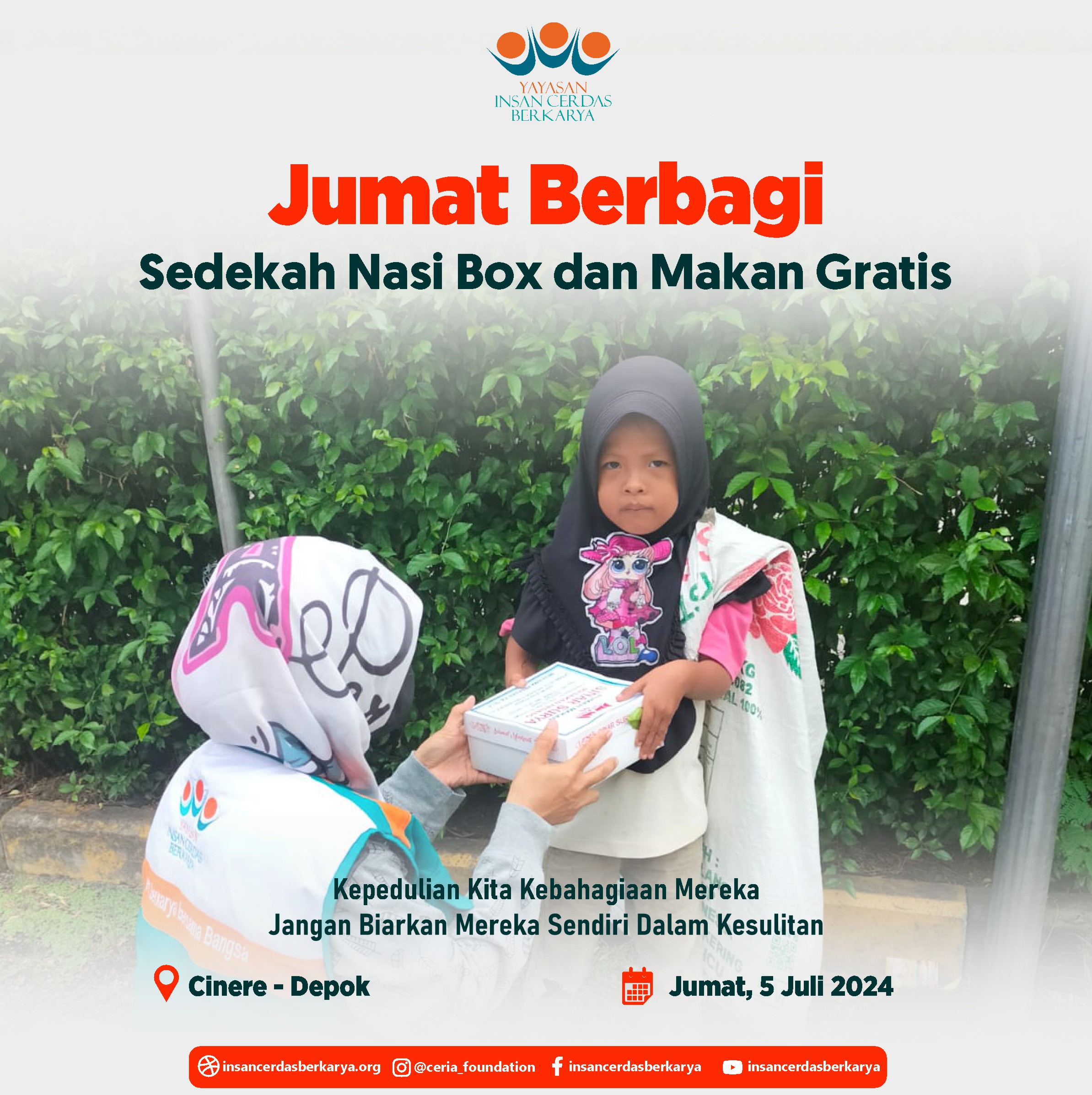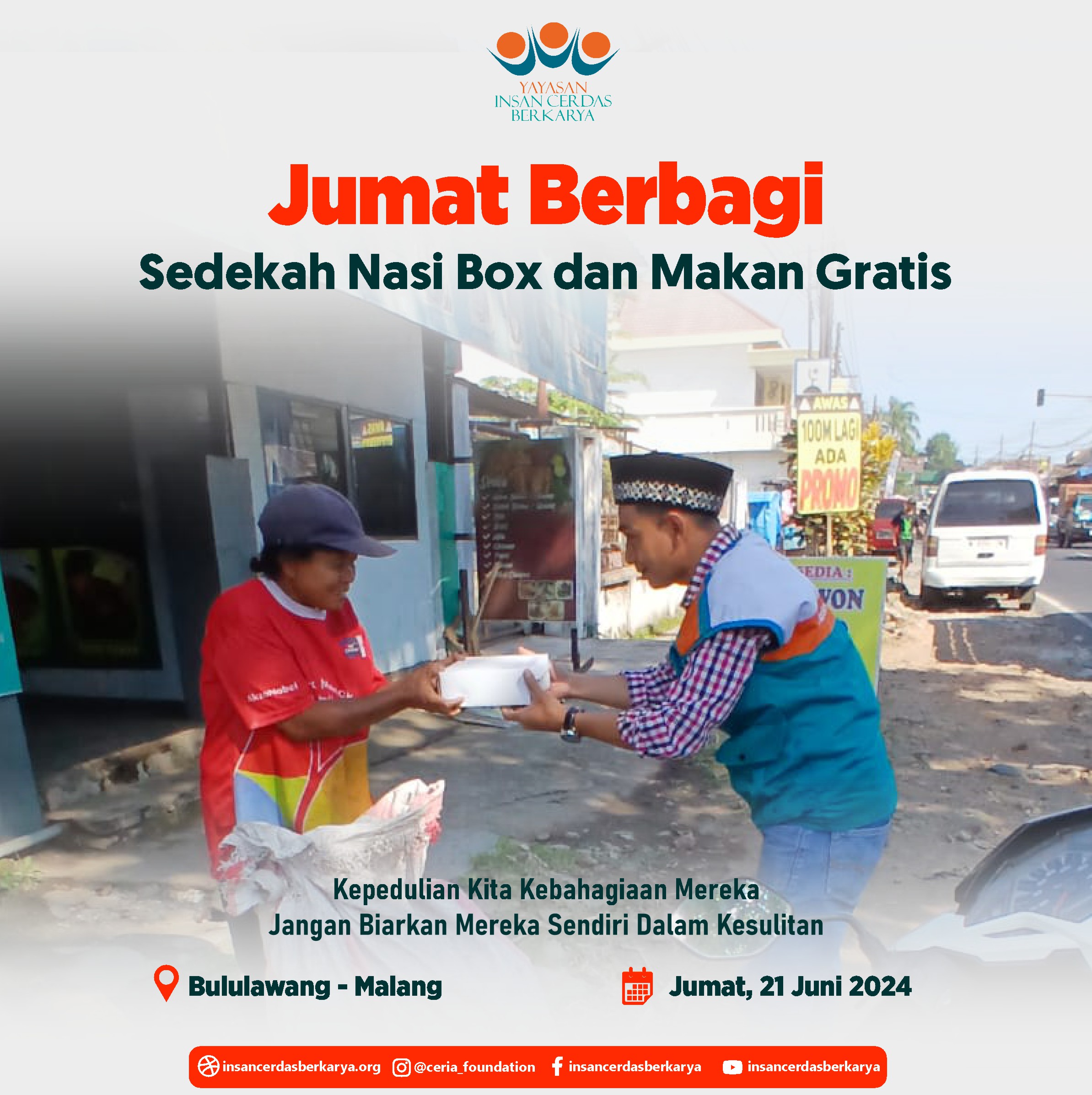 Alhamdulillahirrabbi’alamiin mengucap syukur atas terlaksananya program Rutin Jum’at Berbagi Nasi Box bantu UMKM pada tanggal 28 Juni 2024 kembali membagikan 400 nasi box kepada anak-anak yatim binaan di Cinangka Sawangan Depok dan kepada pemulung, pengamen juga pekerja jalanan di 4 titik yaitu : Kepanjen – Malang Jawa Timur, Pasar Minggu – Jakarta Selatan, Pamulang – Tangerang Selatan dan Cinere – Depok.