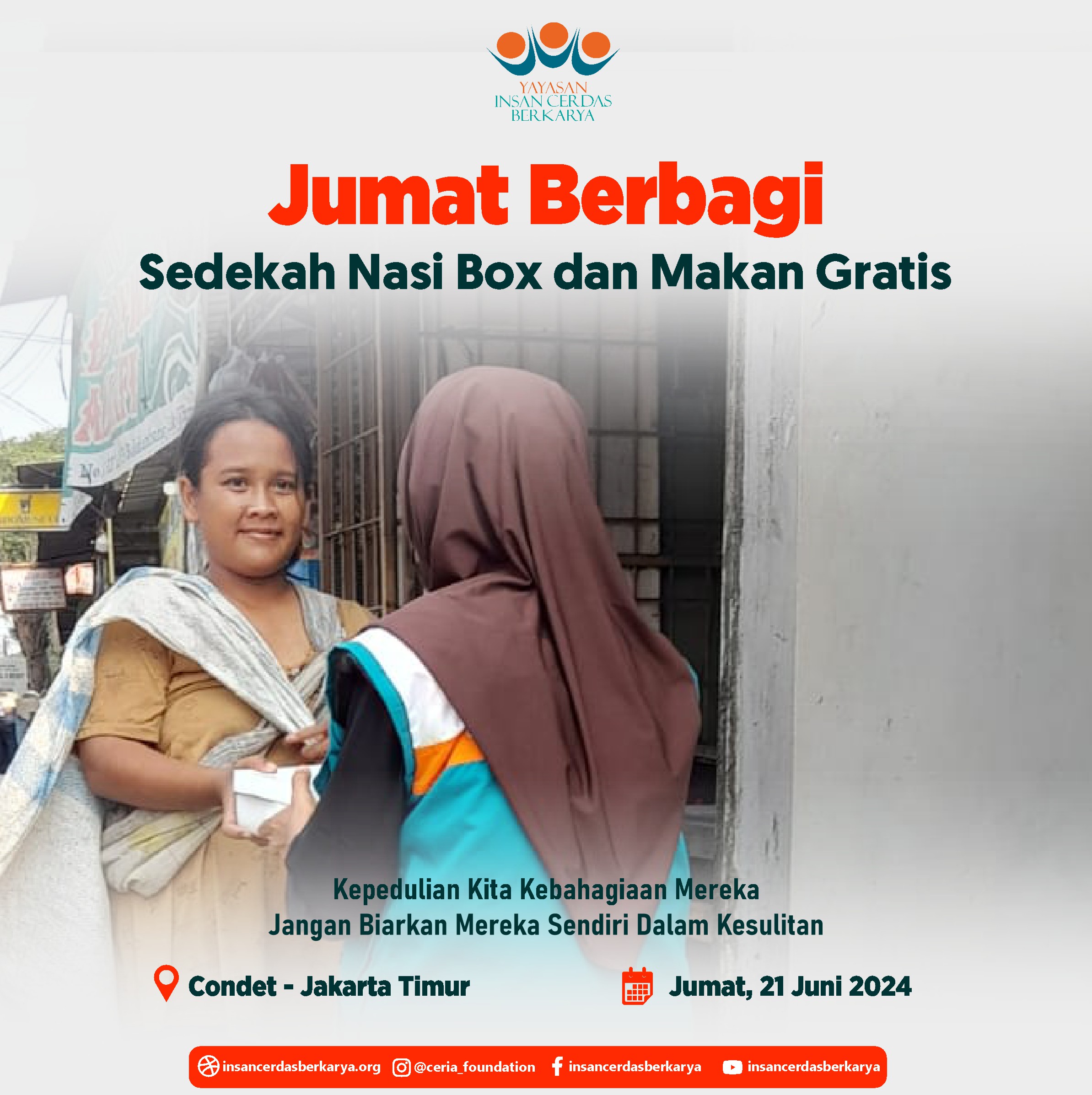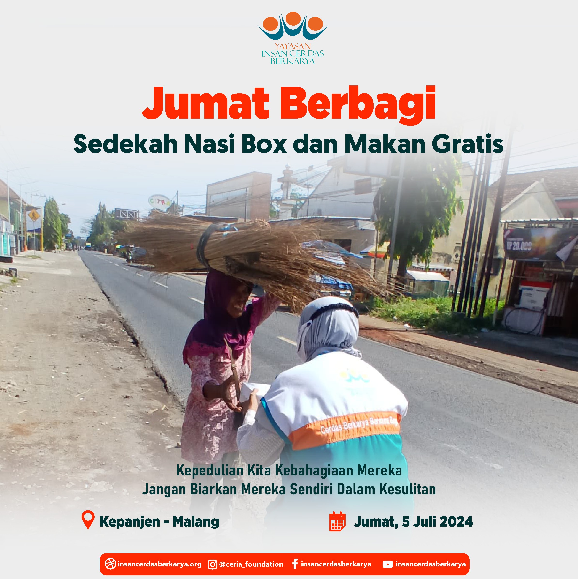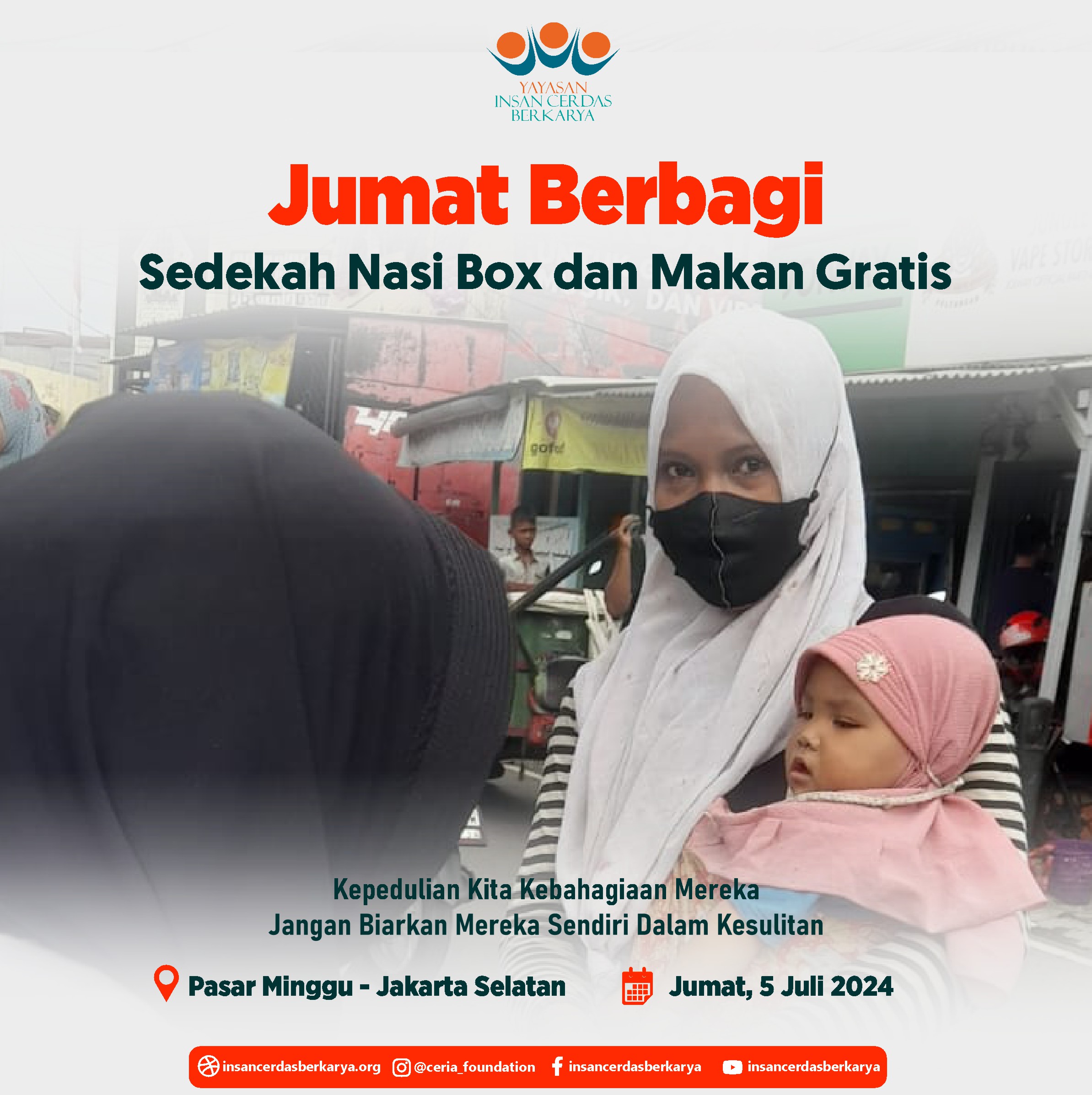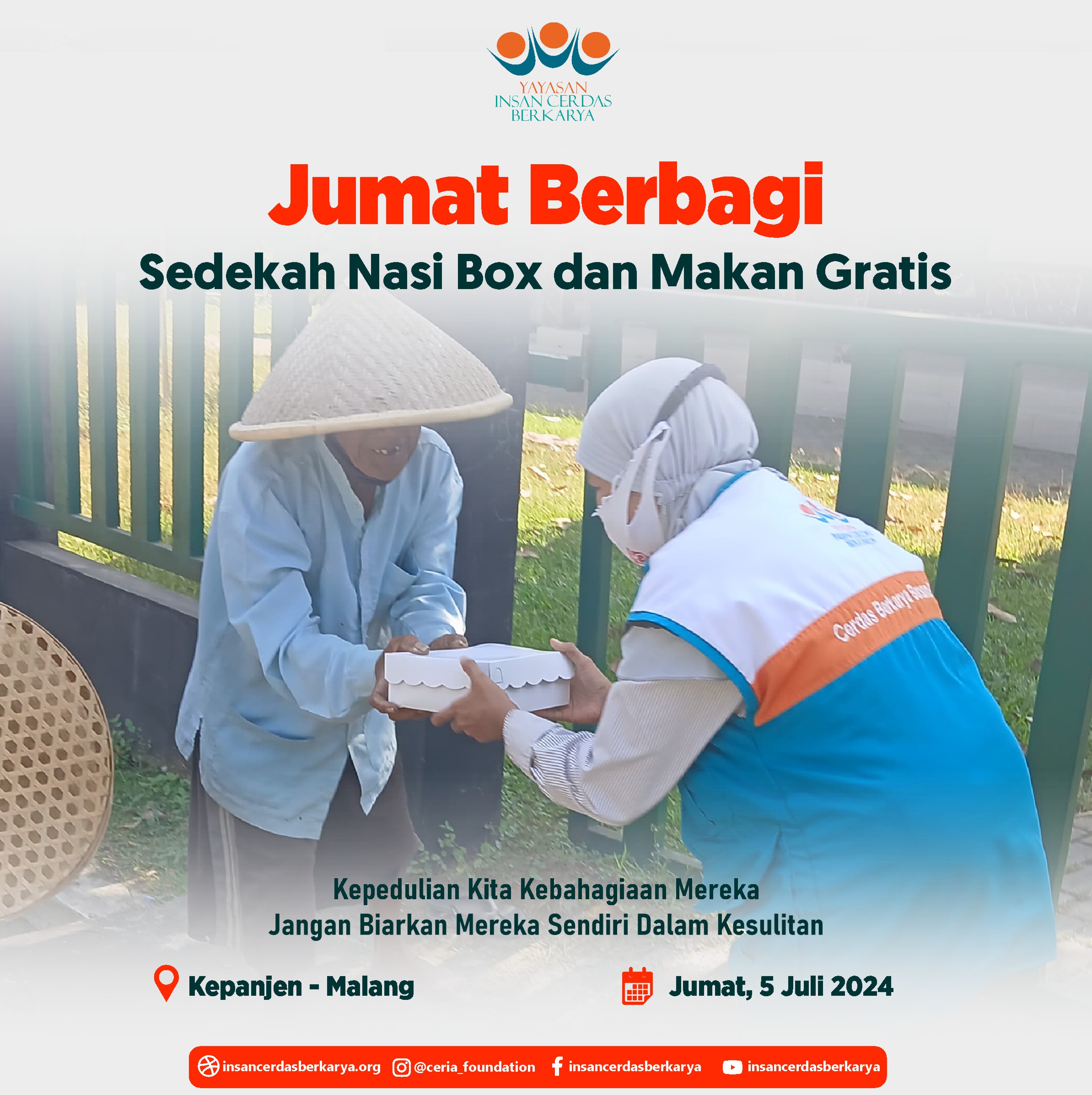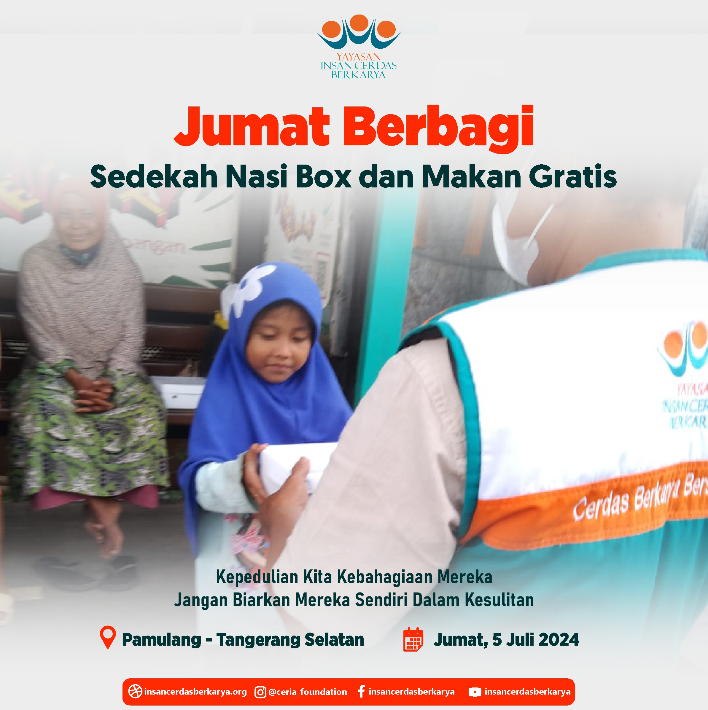 Alhamdulillahirrabbi’alamiin mengucap syukur atas terlaksananya program Rutin Jum’at Berbagi Nasi Box bantu UMKM pada tanggal 28 Juni 2024 kembali membagikan 400 nasi box kepada anak-anak yatim binaan di Cinangka Sawangan Depok dan kepada pemulung, pengamen juga pekerja jalanan di 4 titik yaitu : Kepanjen – Malang Jawa Timur, Pasar Minggu – Jakarta Selatan, Pamulang – Tangerang Selatan dan Cinere – Depok.