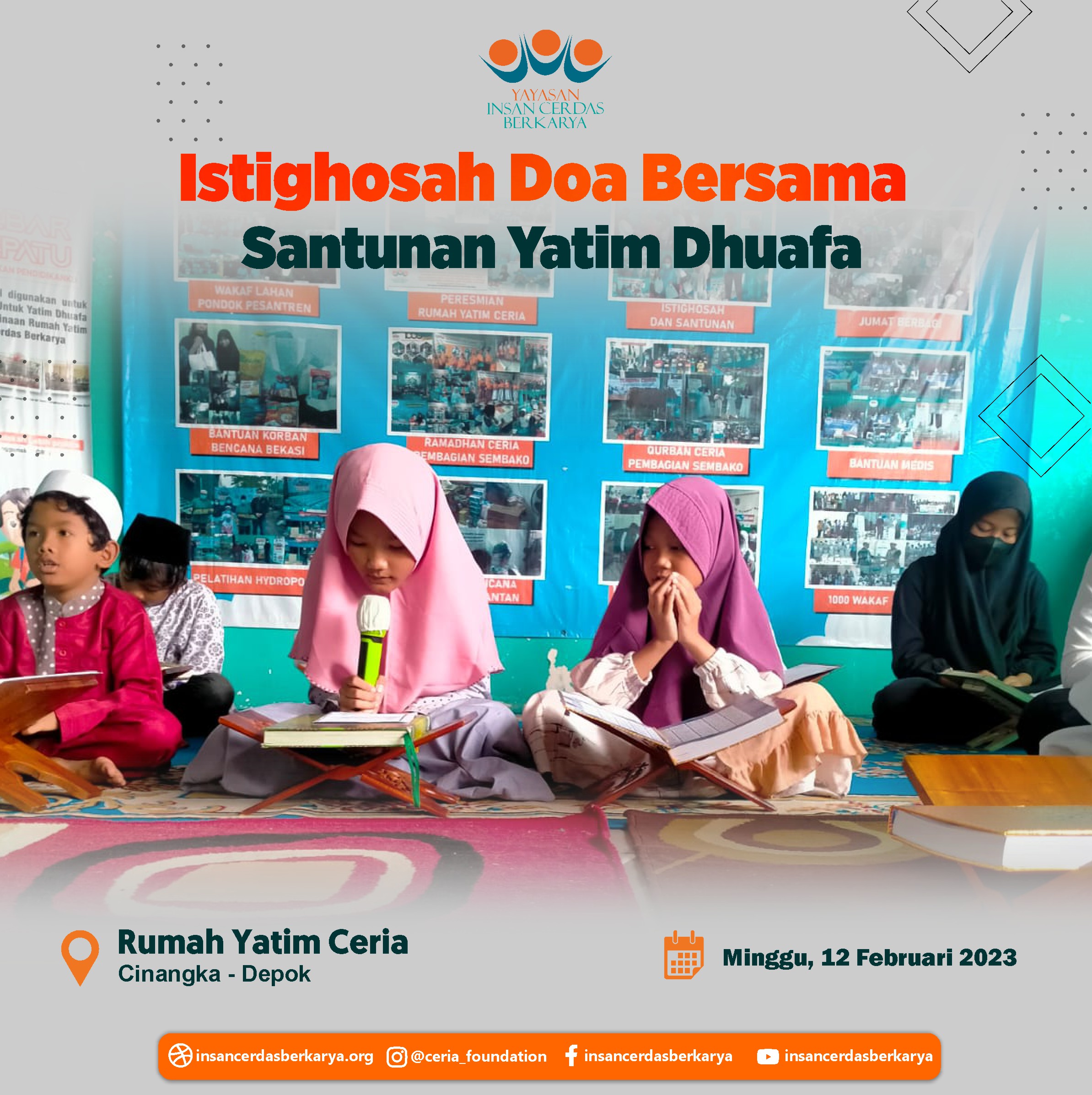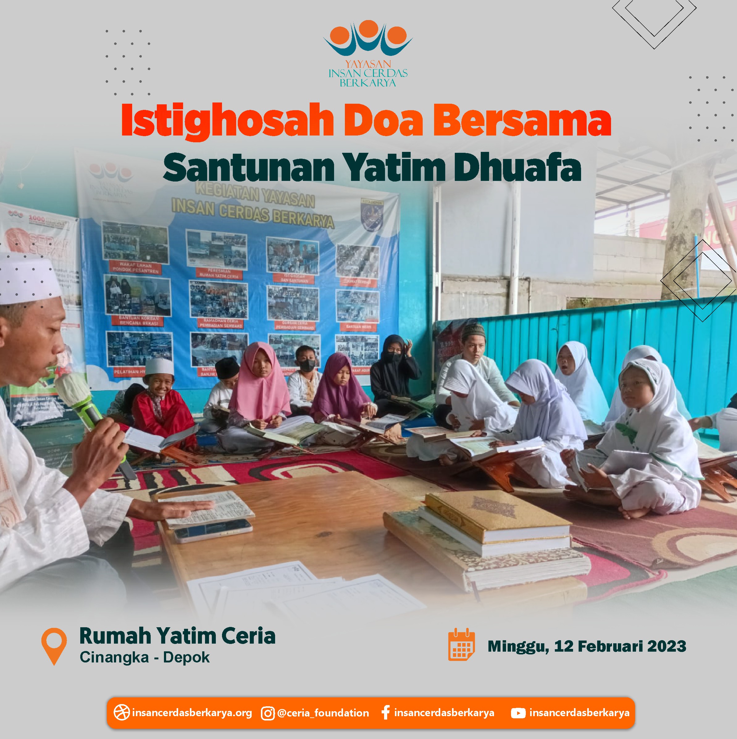 Alhamdulillah Ahad tanggal 19 Februari 2023 telah terlaksana do’a bersama dan Santunan Pekanan dengan lancar & khidmat ๐. Titipan do’a dan hajat telah dibacakan serta di aamiin-kan bersama anak-anak Rumah Yatim Ceria Yayasan Insan Cerdas Berkarya., Bismillah Doa yang kita panjatkan bersama putra putri yatim Allah ijabah, Aamiin.. ๐คฒ๐ป