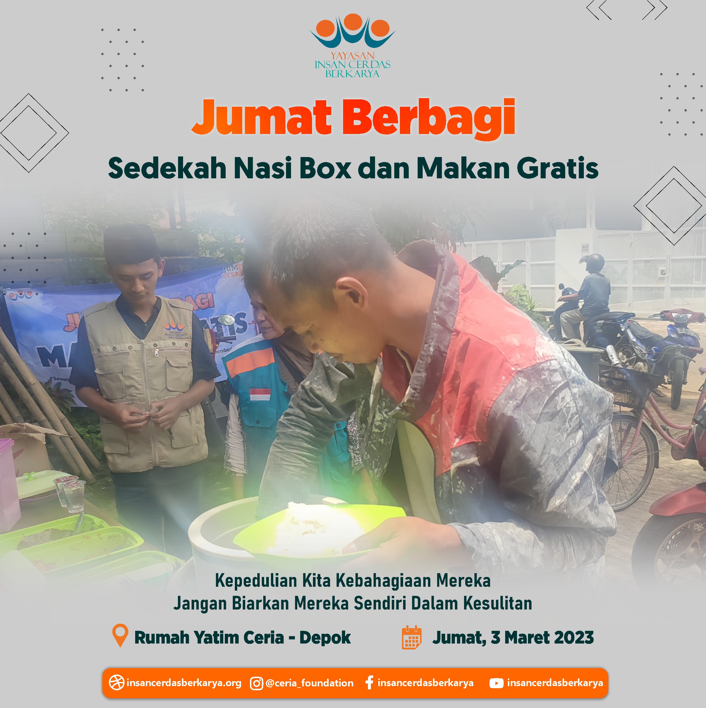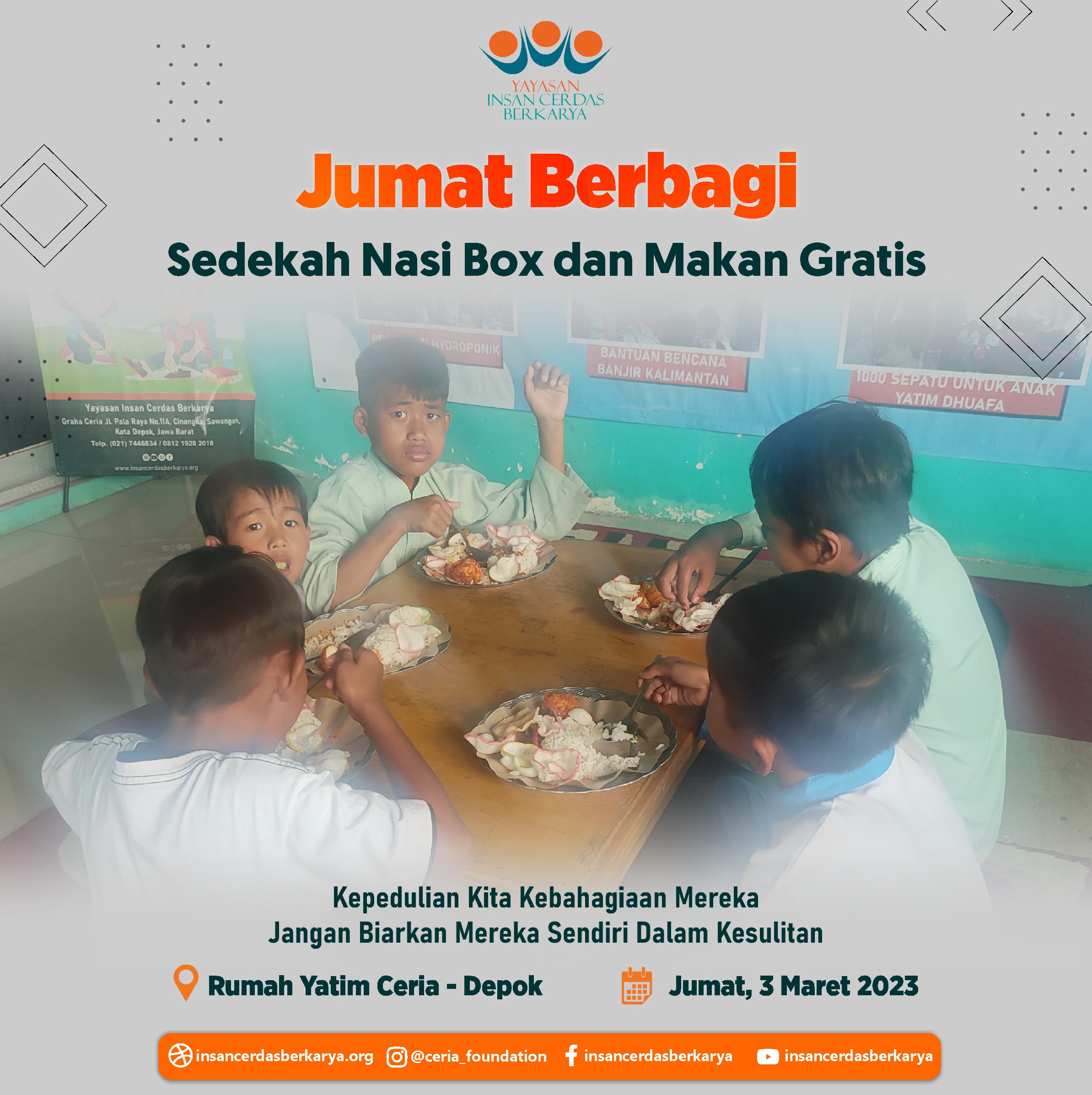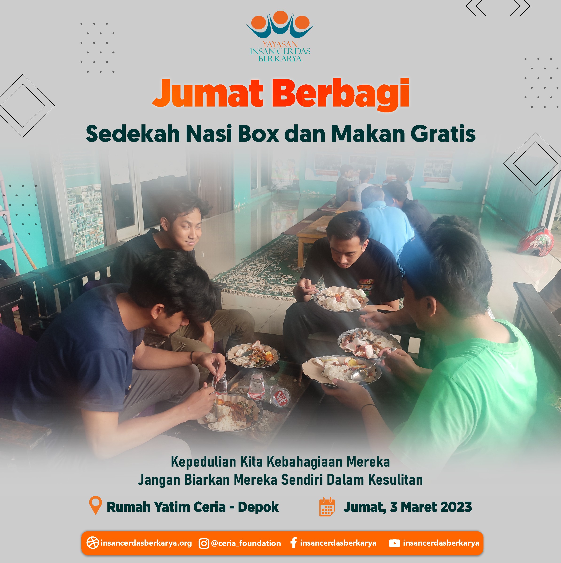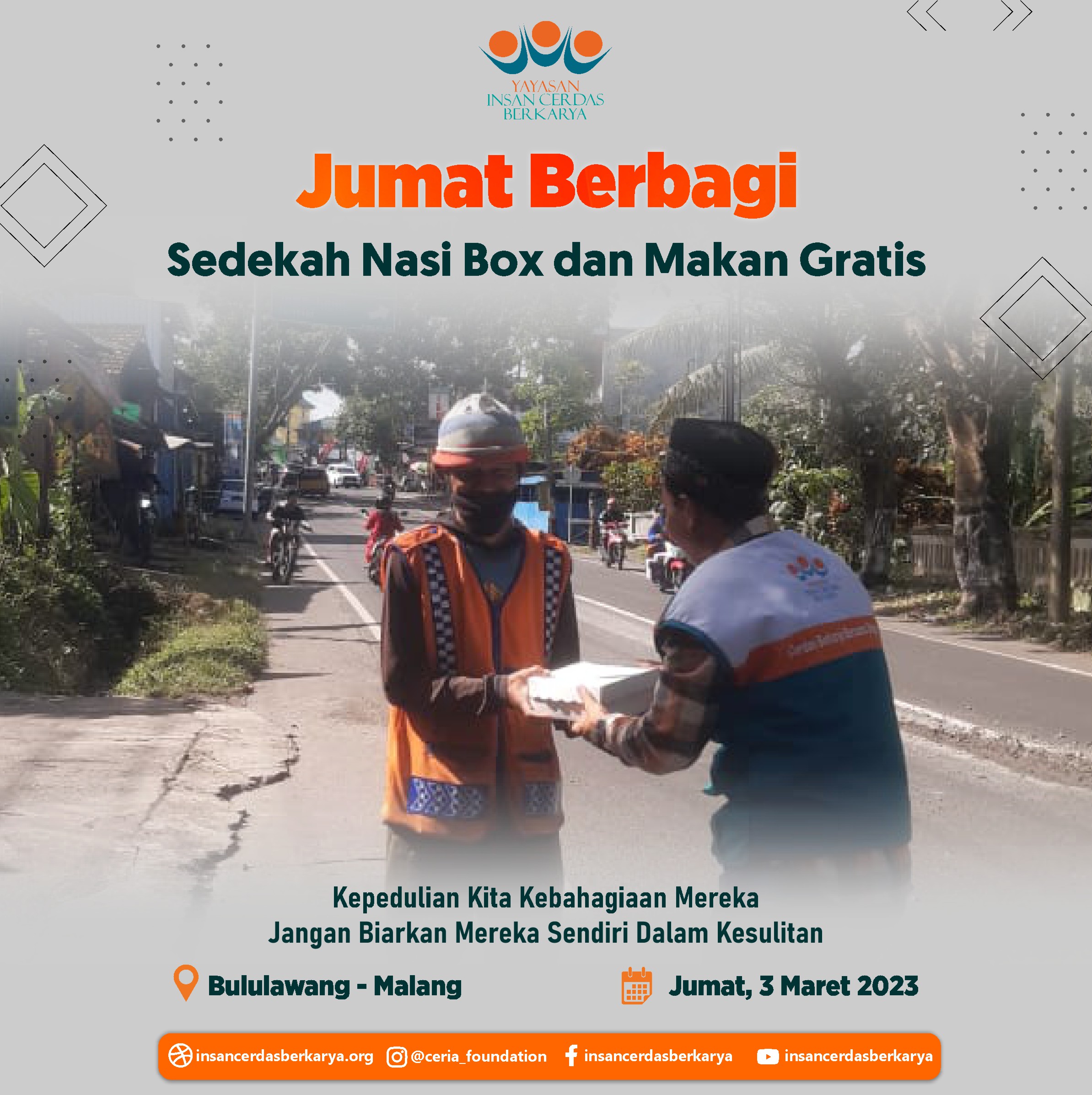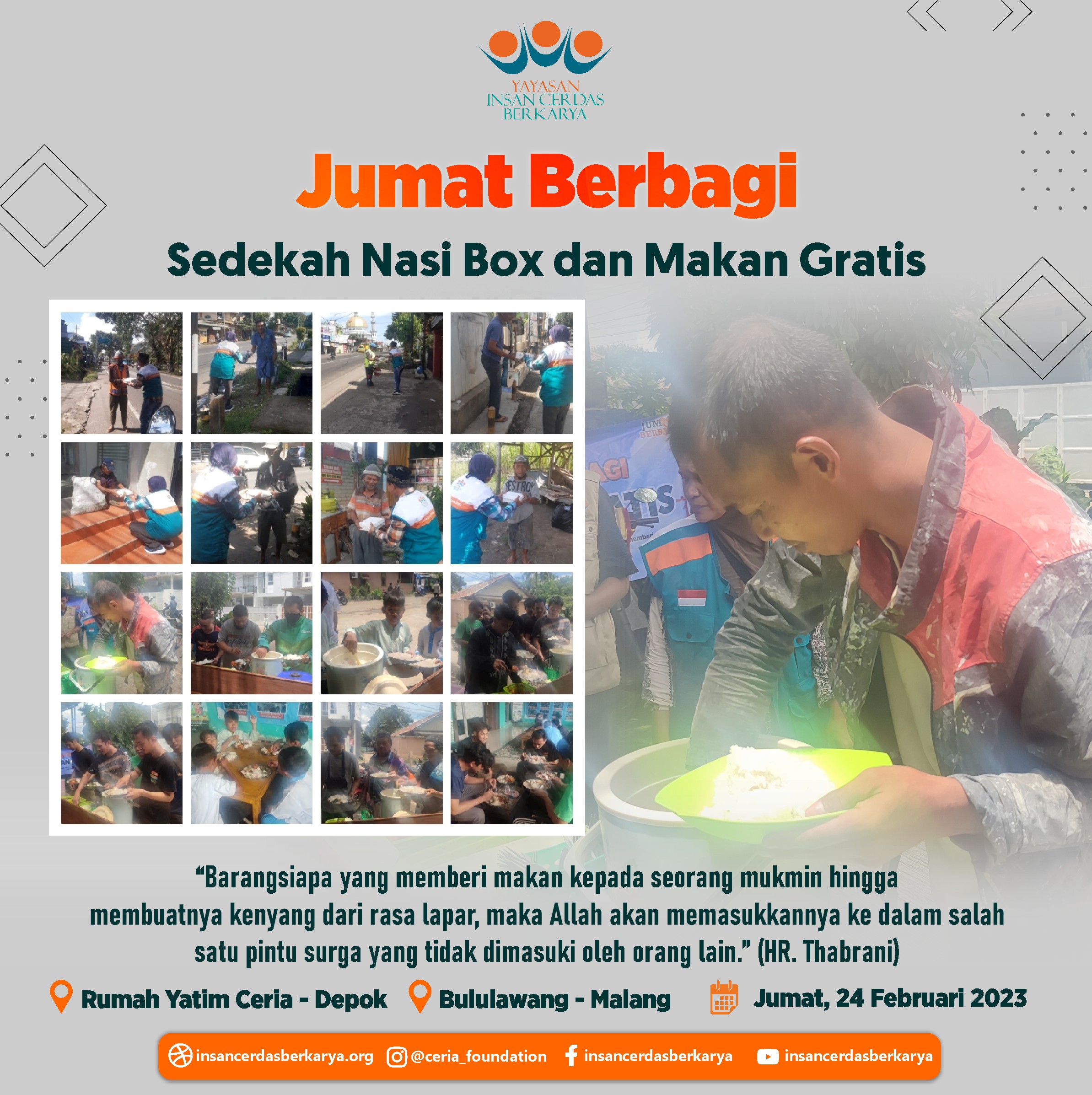 Alhamdulillah bersyukur atas karunia-Nya dan dukungan Sahabat Dermawan pada Jumat, 17 Februari 2023, adik-adik serta pengendara ojek online dapat kembali menikmati santap siang dari program makan gratis Jumat Berbagi YICB serta penyaluran nasi box kepada tukang becak, pemulung dan pekerja jalanan lainnya di Kec. Kepanjen Kab. Malang, Jawa Timur.