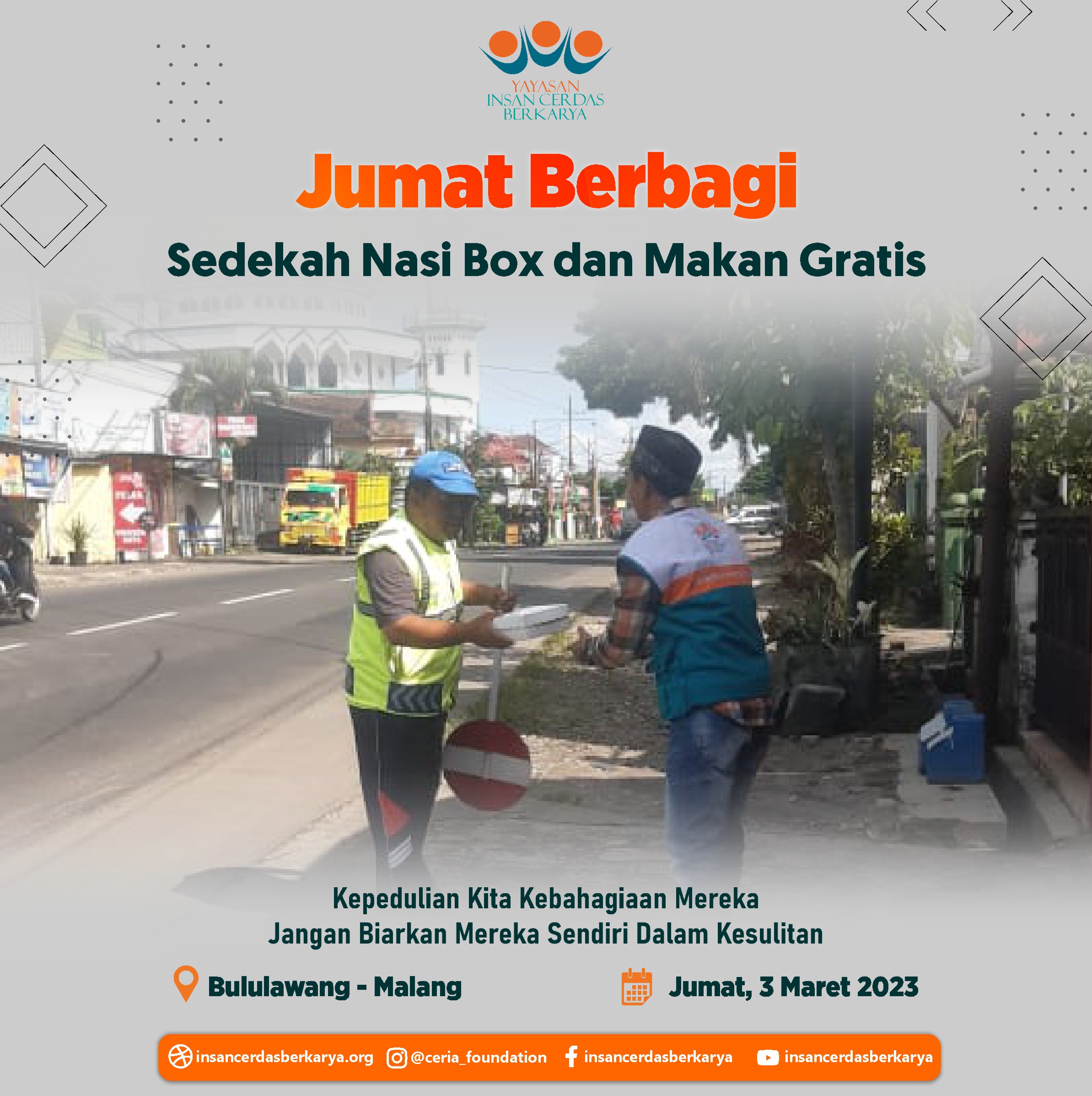 Bersyukur atas ridhoNya dan berkat uluran tangan Sahabat Dermawan sehingga terlaksana dengan lancar program makan gratis Jumat Berbagi YICB pada Jumat, 03 Maret 2023 serta penyaluran nasi box kepada tukang becak, pemulung dan pekerja jalanan lainnya di Kec. Bululawang Malang Jawa Timur.