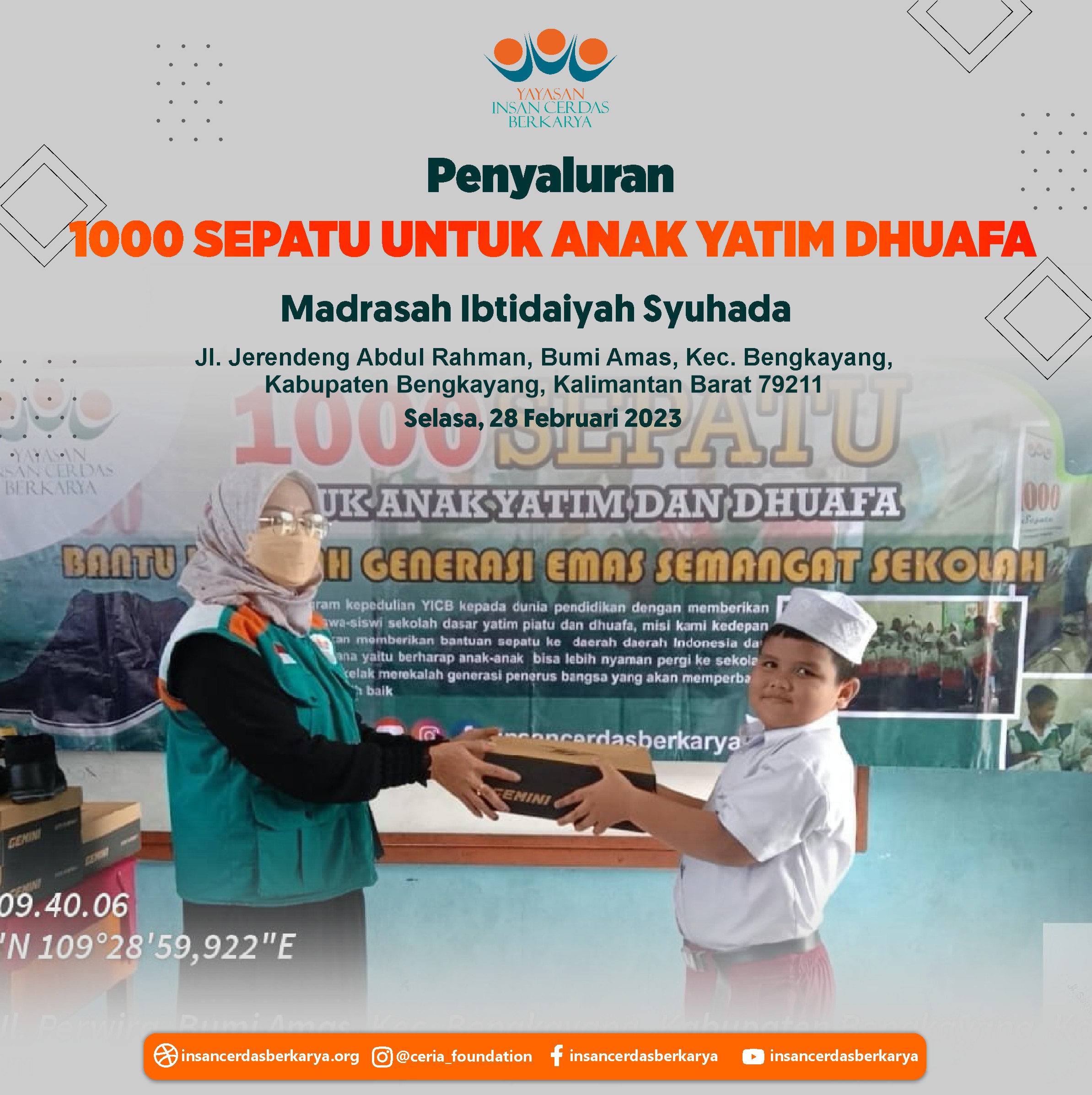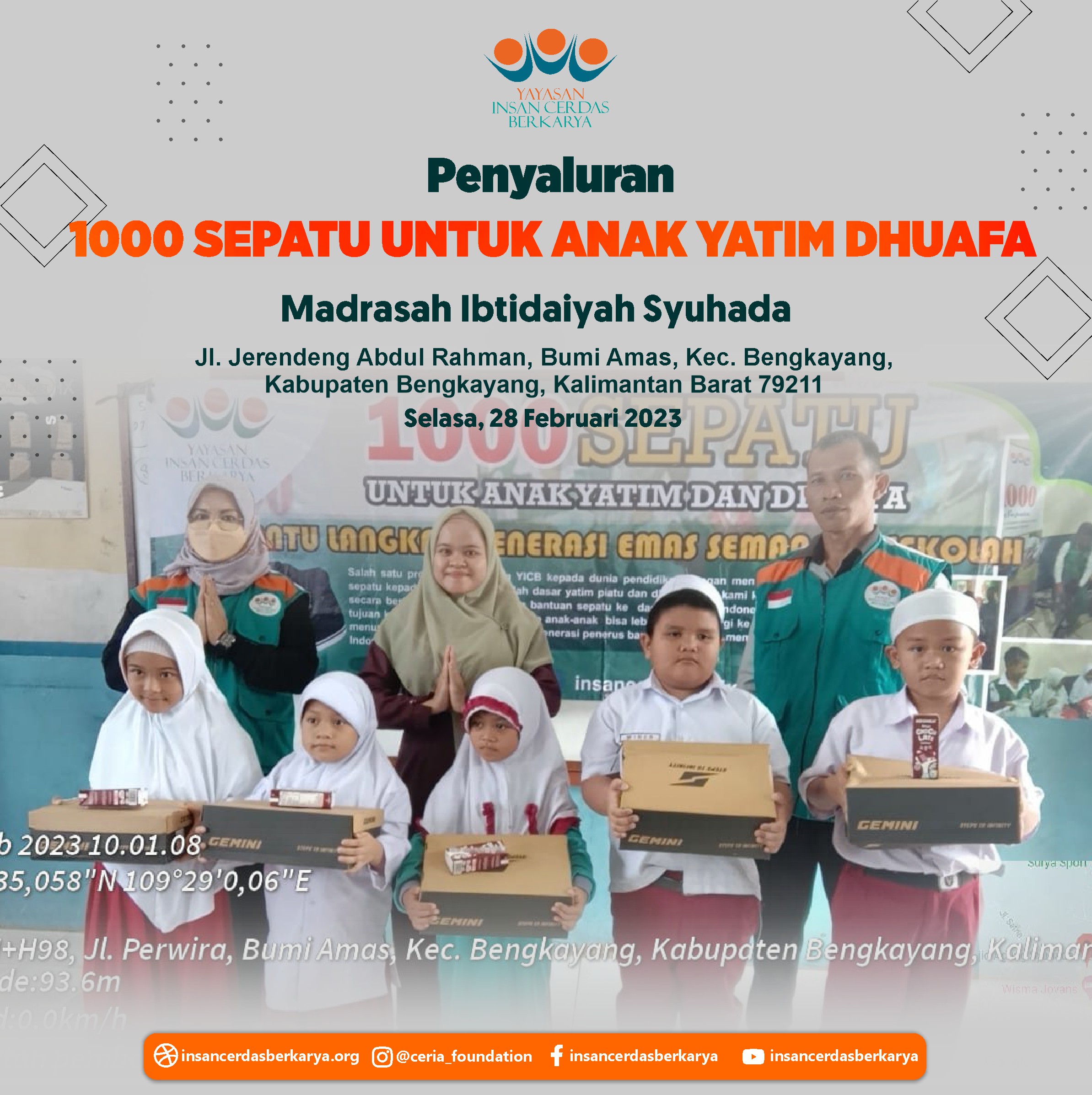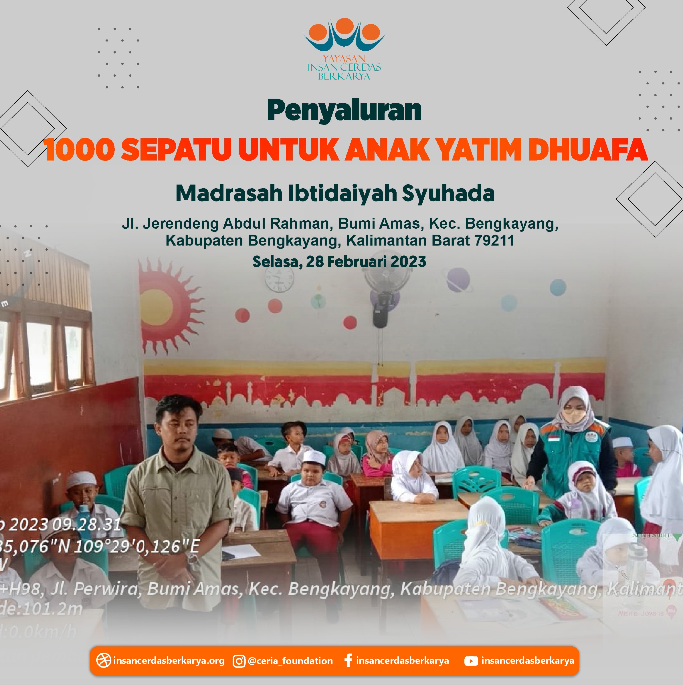 Alhamdulillahhirobbila’laamiin, keceriaan dan ucapan terima kasih terlisan tulus dari anak-anak saat menerima dan mencoba sepatu baru dari program 1000 sepatu untuk anak yatim dhuafa tahap 12 pada Selasa, 28 Februari 2023 di Madrasah Ibtidaiyah Syuhada jln. Jerendeng Abdul Rahman, Bumi Amas Kec. Bengkayang kab. Bengkayang Kalimantan Barat.