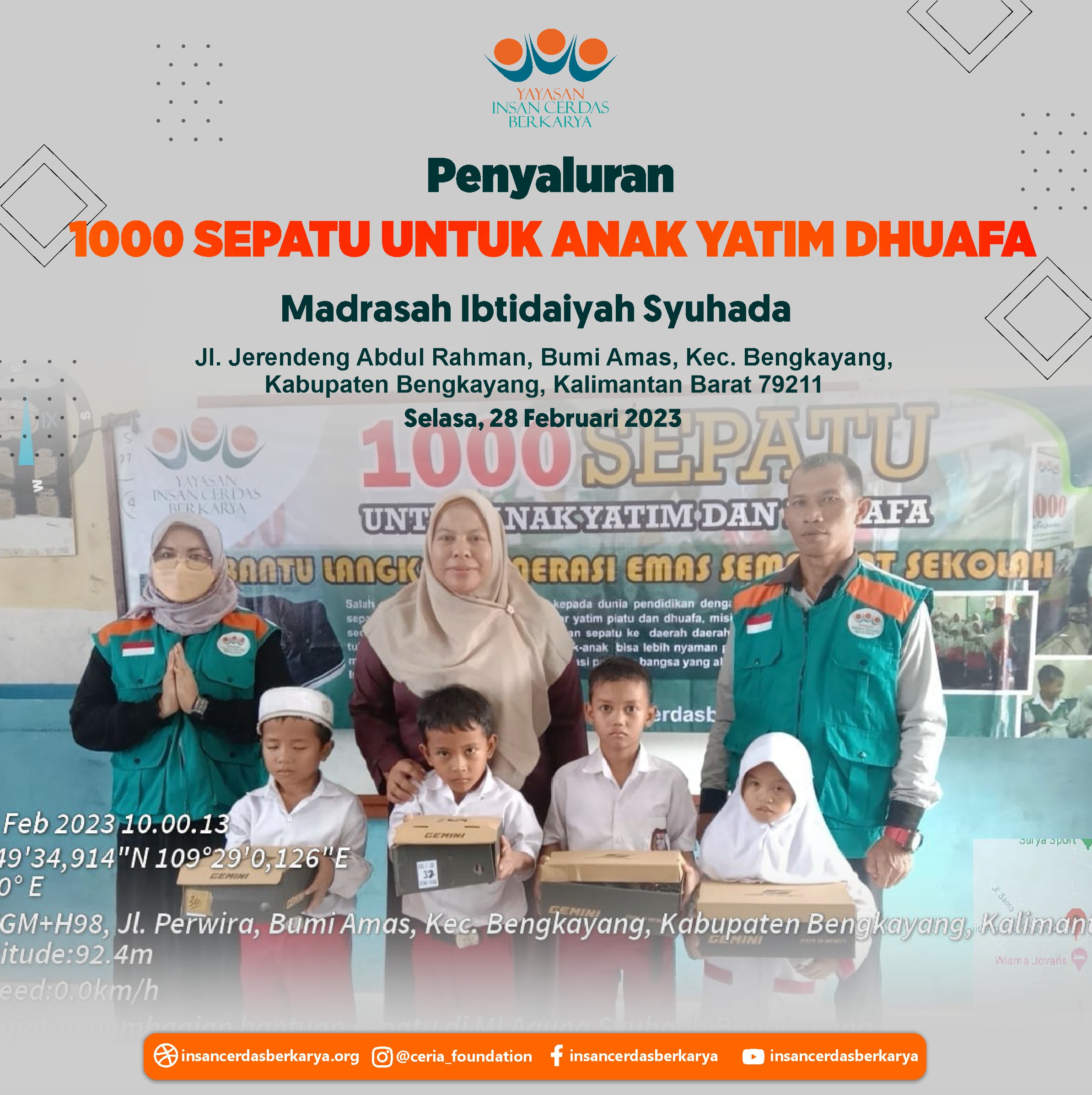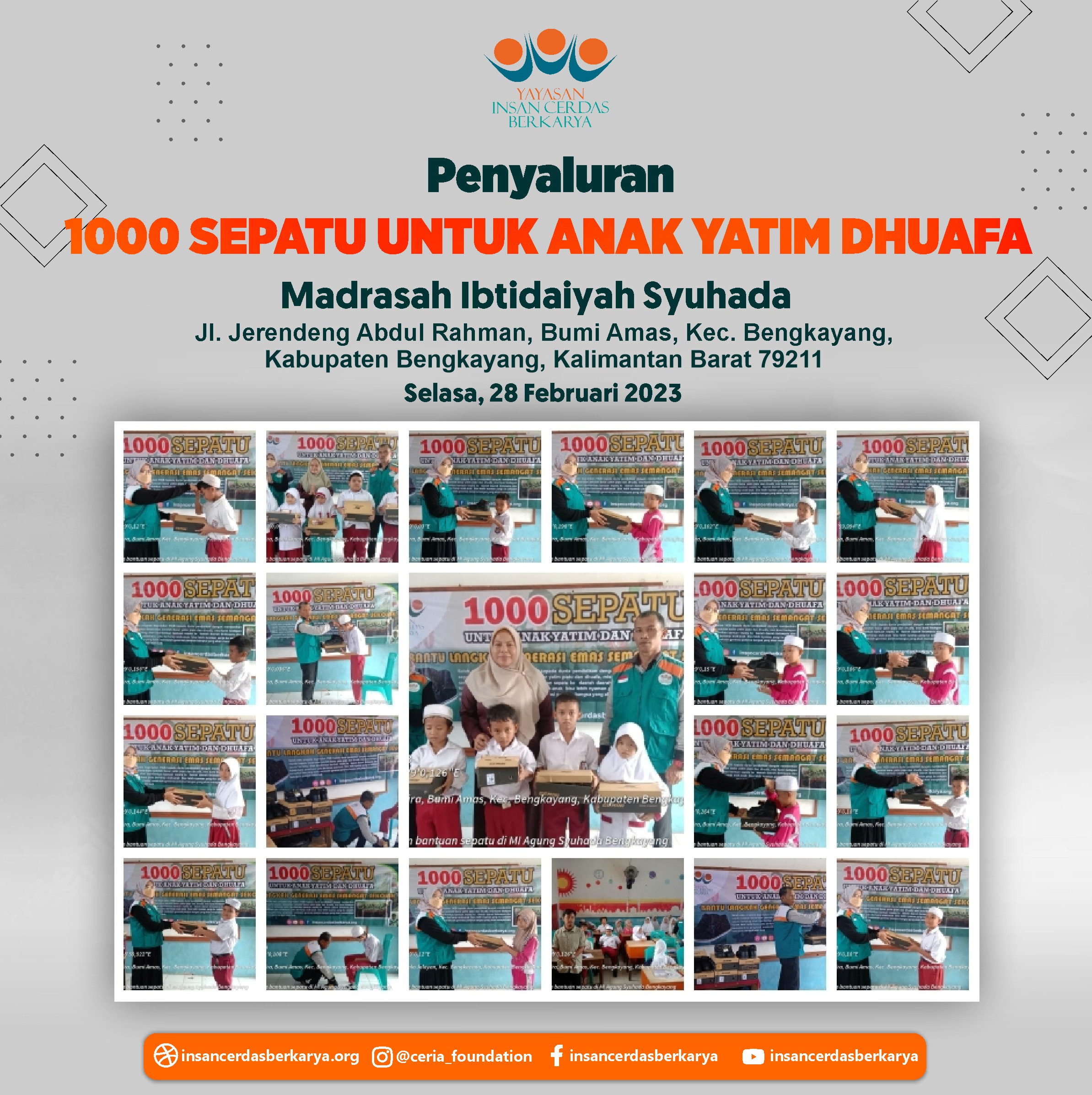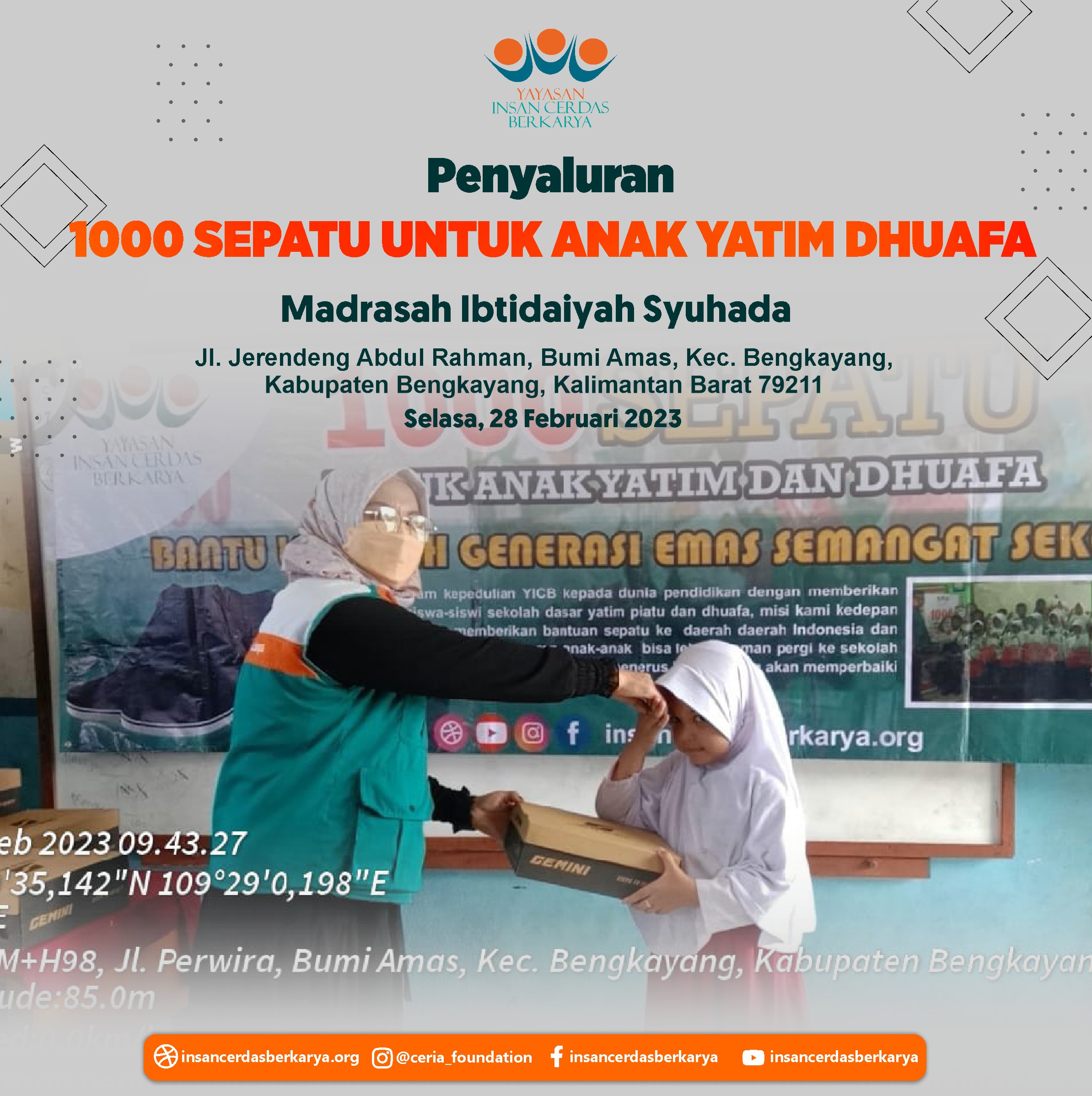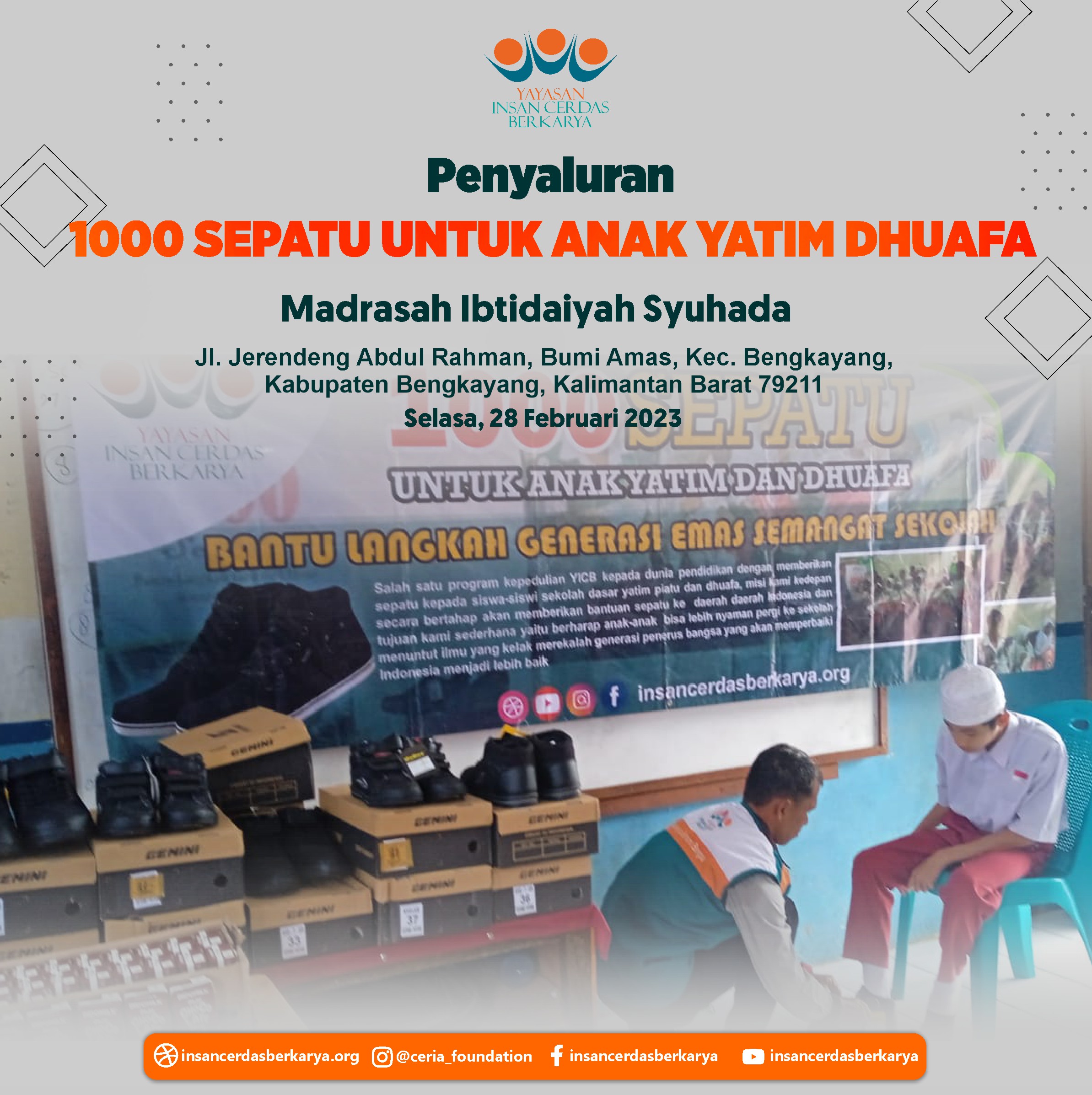 Alhamdulillahhirobbila’laamiin, keceriaan dan ucapan terima kasih terlisan tulus dari anak-anak saat menerima dan mencoba sepatu baru dari program 1000 sepatu untuk anak yatim dhuafa tahap 12 pada Selasa, 28 Februari 2023 di Madrasah Ibtidaiyah Syuhada jln. Jerendeng Abdul Rahman, Bumi Amas Kec. Bengkayang kab. Bengkayang Kalimantan Barat.