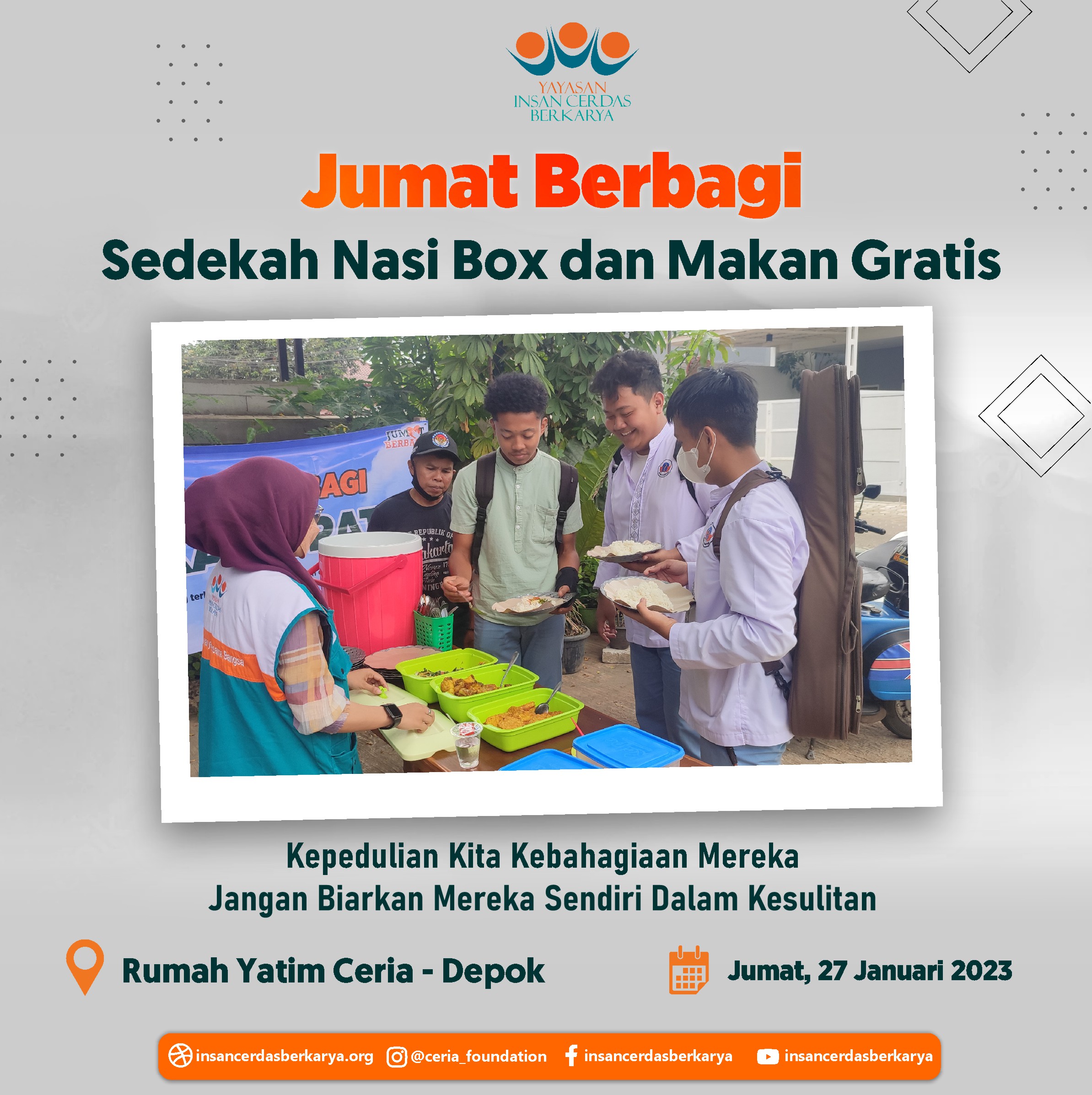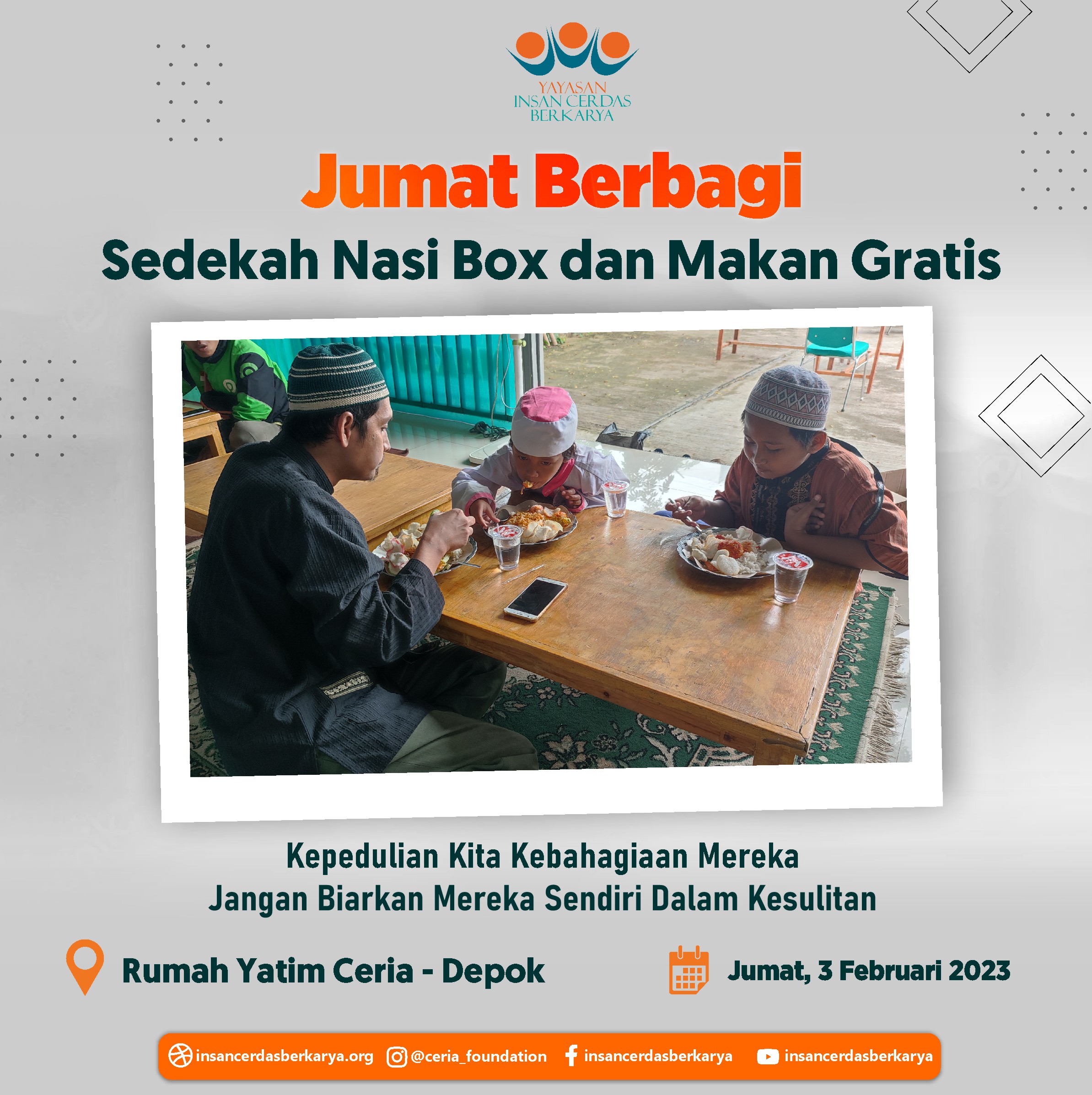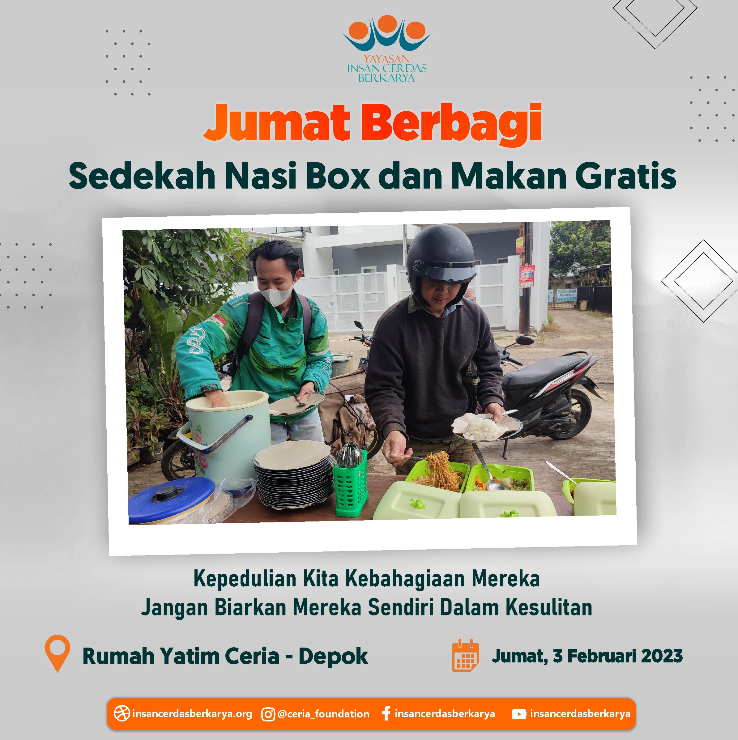 “Biasanya beli makan siang, Alhamdulillah kali ini ikut makan gratis Jum’at Berbagi di yayasan.. terimakasih para donatur dan relawan, dengan ini saya bisa menghemat pengeluaran”_, ujar salah seorang bapak pengemudi ojol.