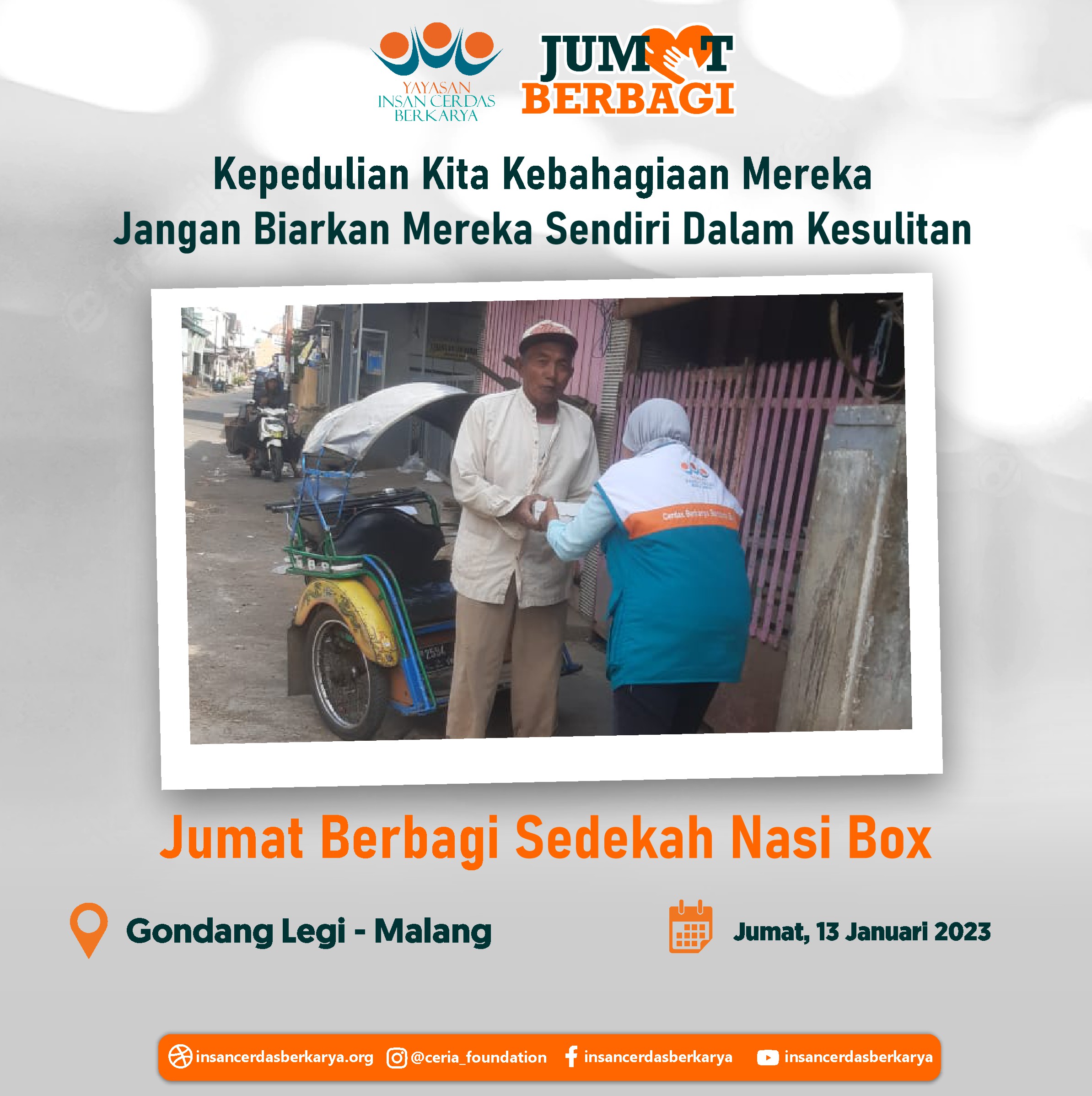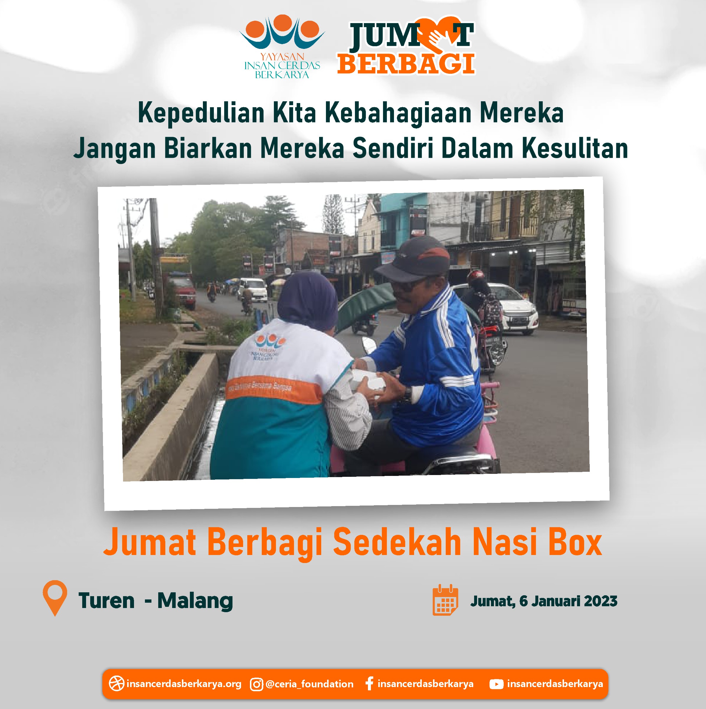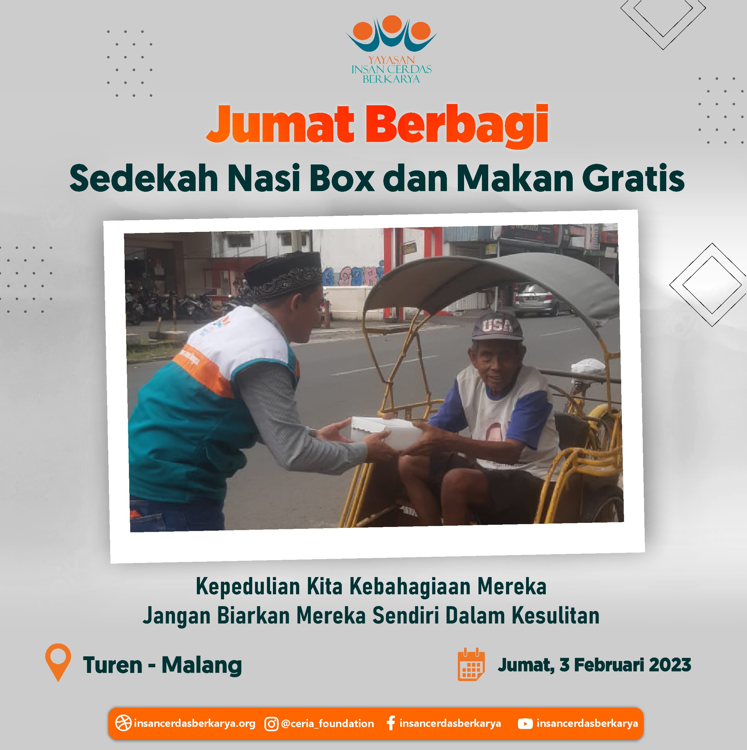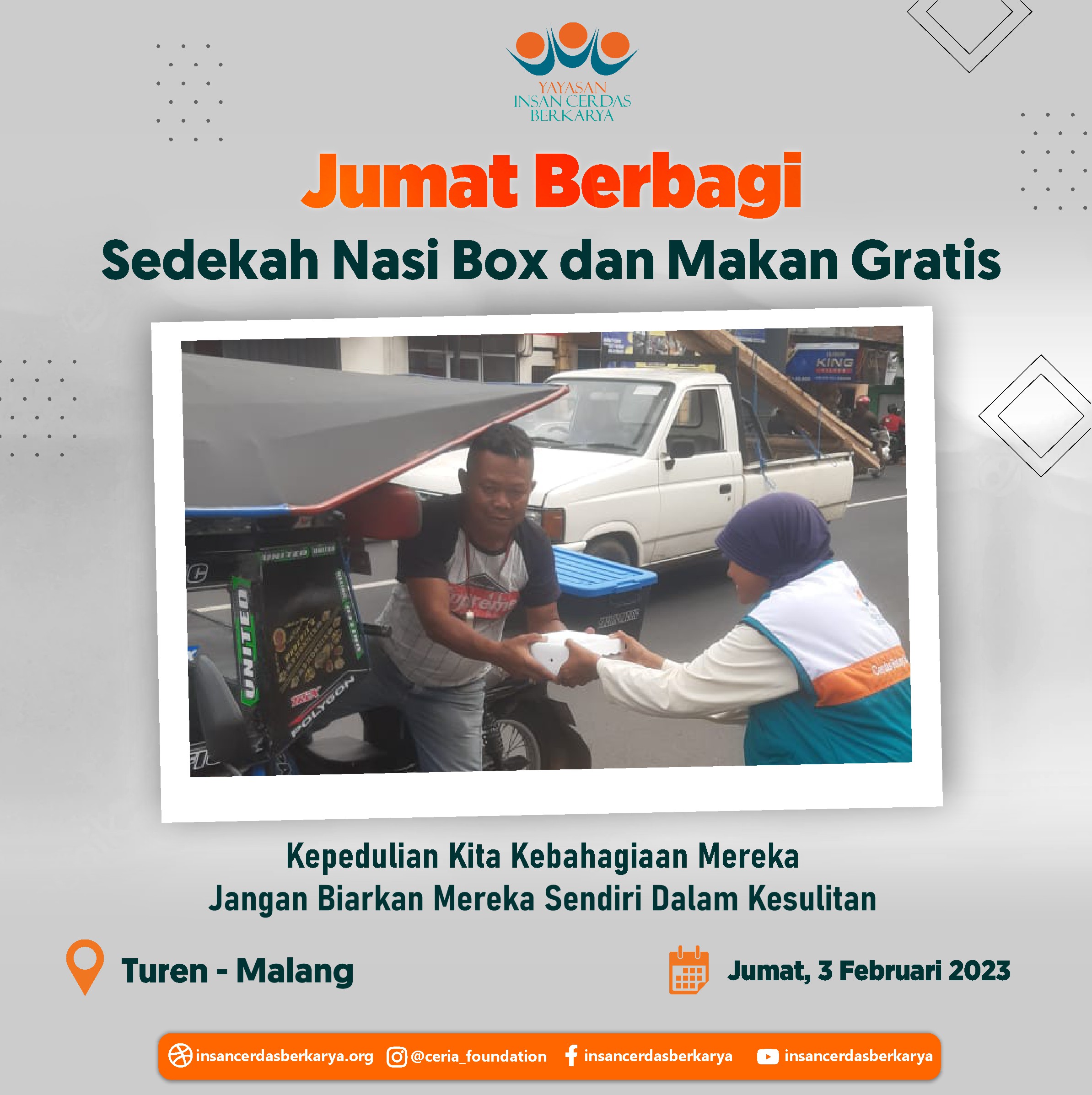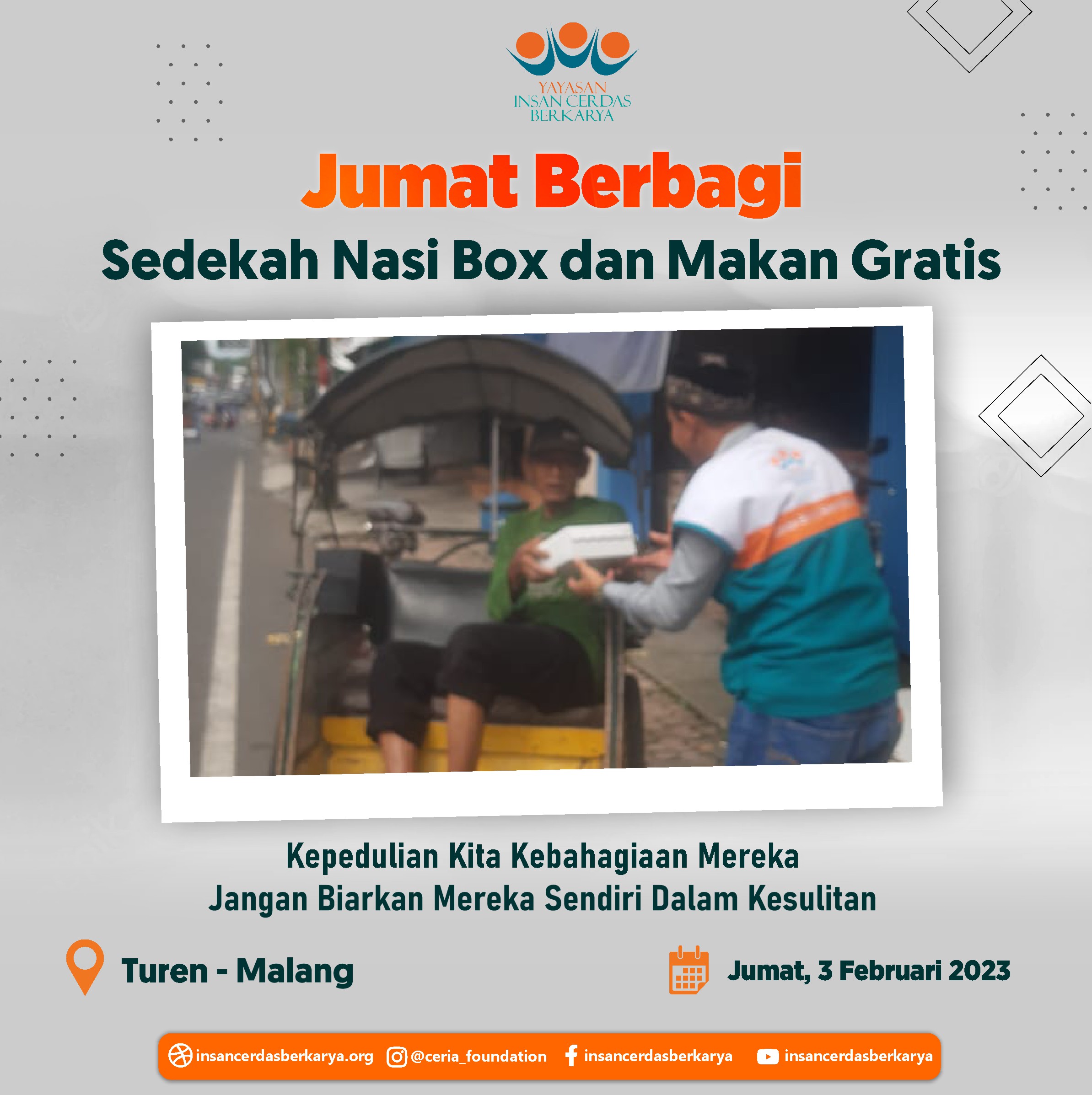 Penuh rasa syukur adik-adik serta pengendara ojek online dapat kembali menikmati santap siang dari program *makan gratis Jumat Berbagi YICB* Jumat, 09 Februari 2023 serta penyaluran nasi box kepada tukang becak, pemulung dan pekerja jalanan lainnya di Kec. Bululawang Kab. Malang Jawa Timur.