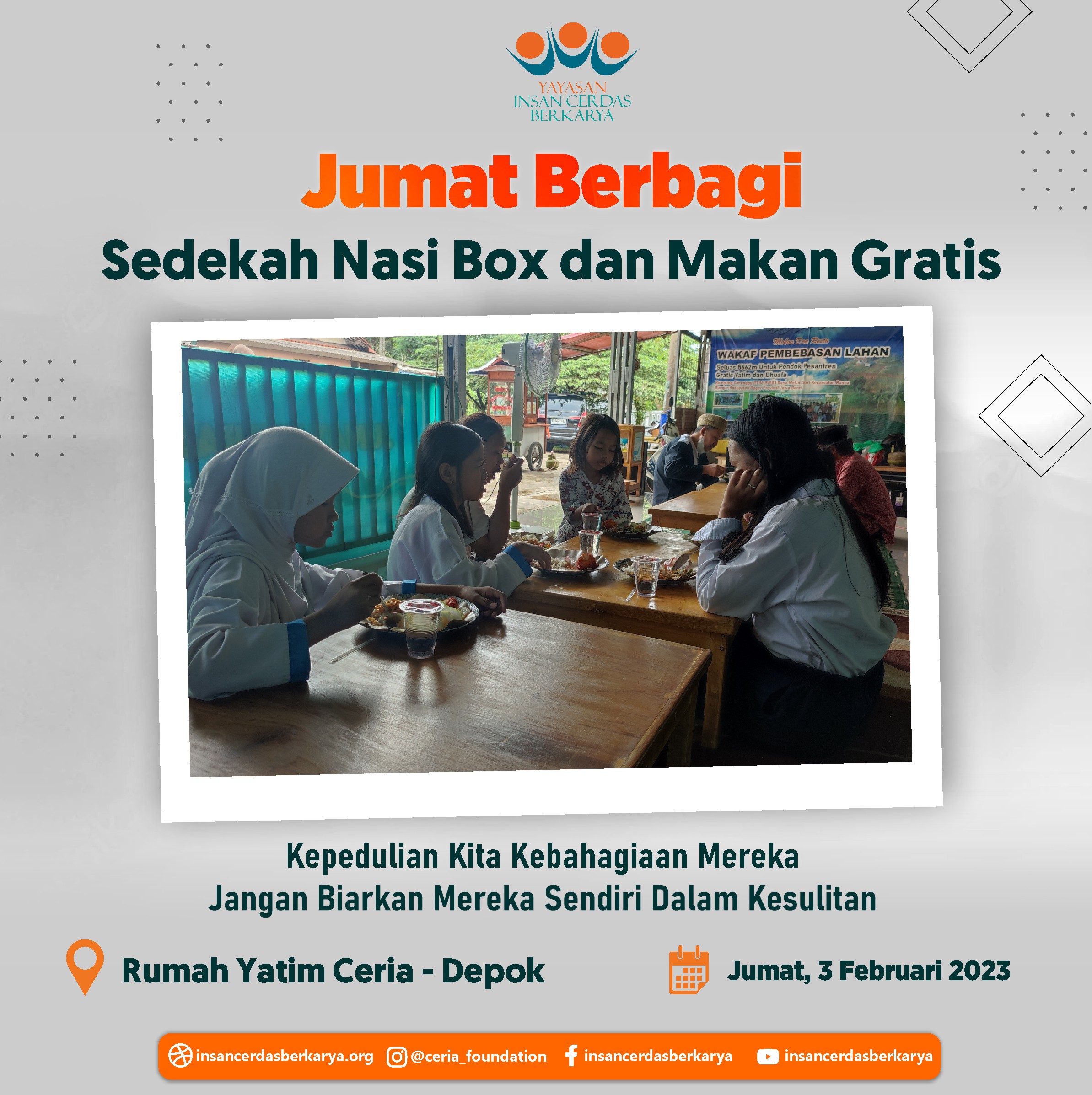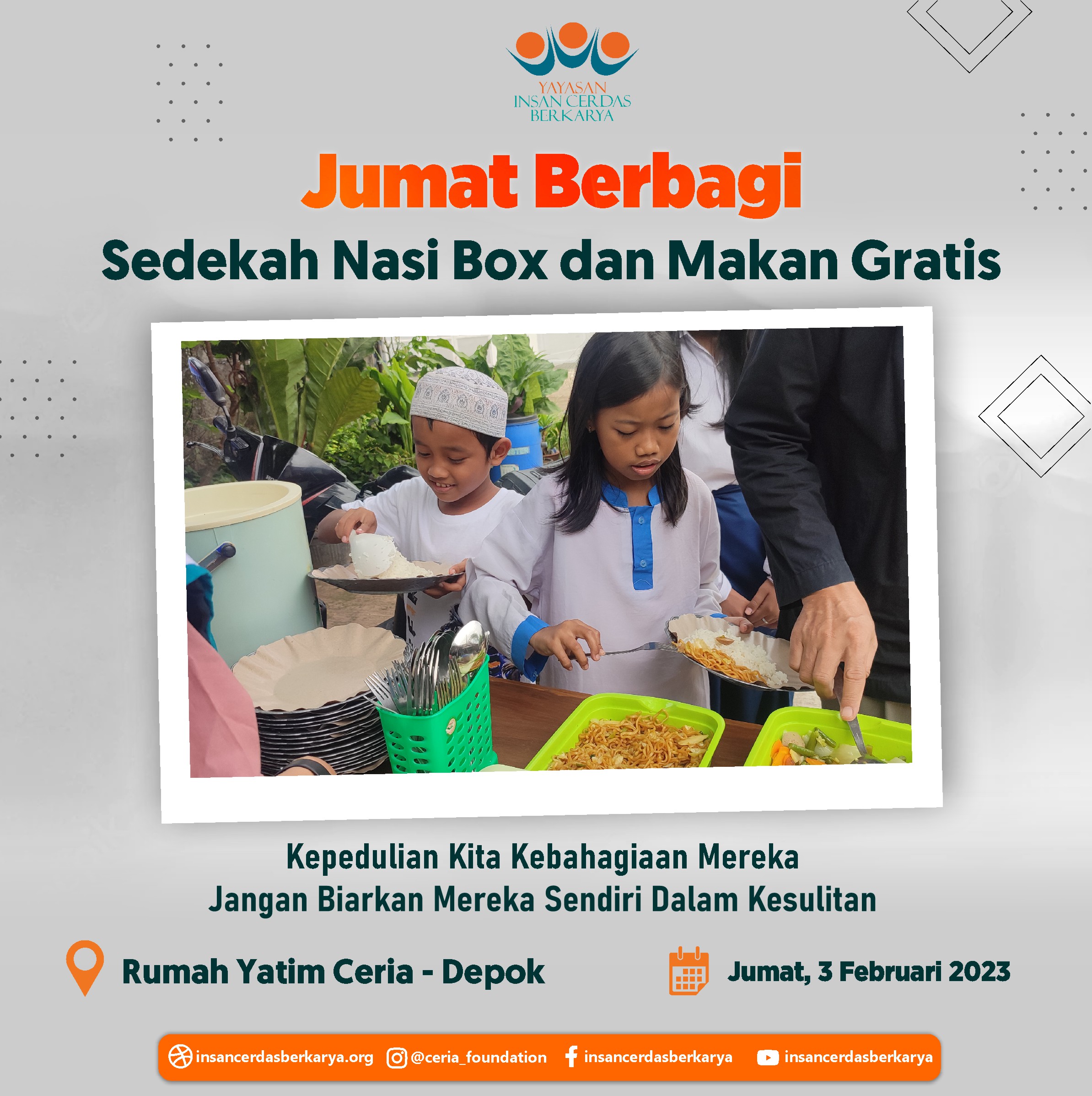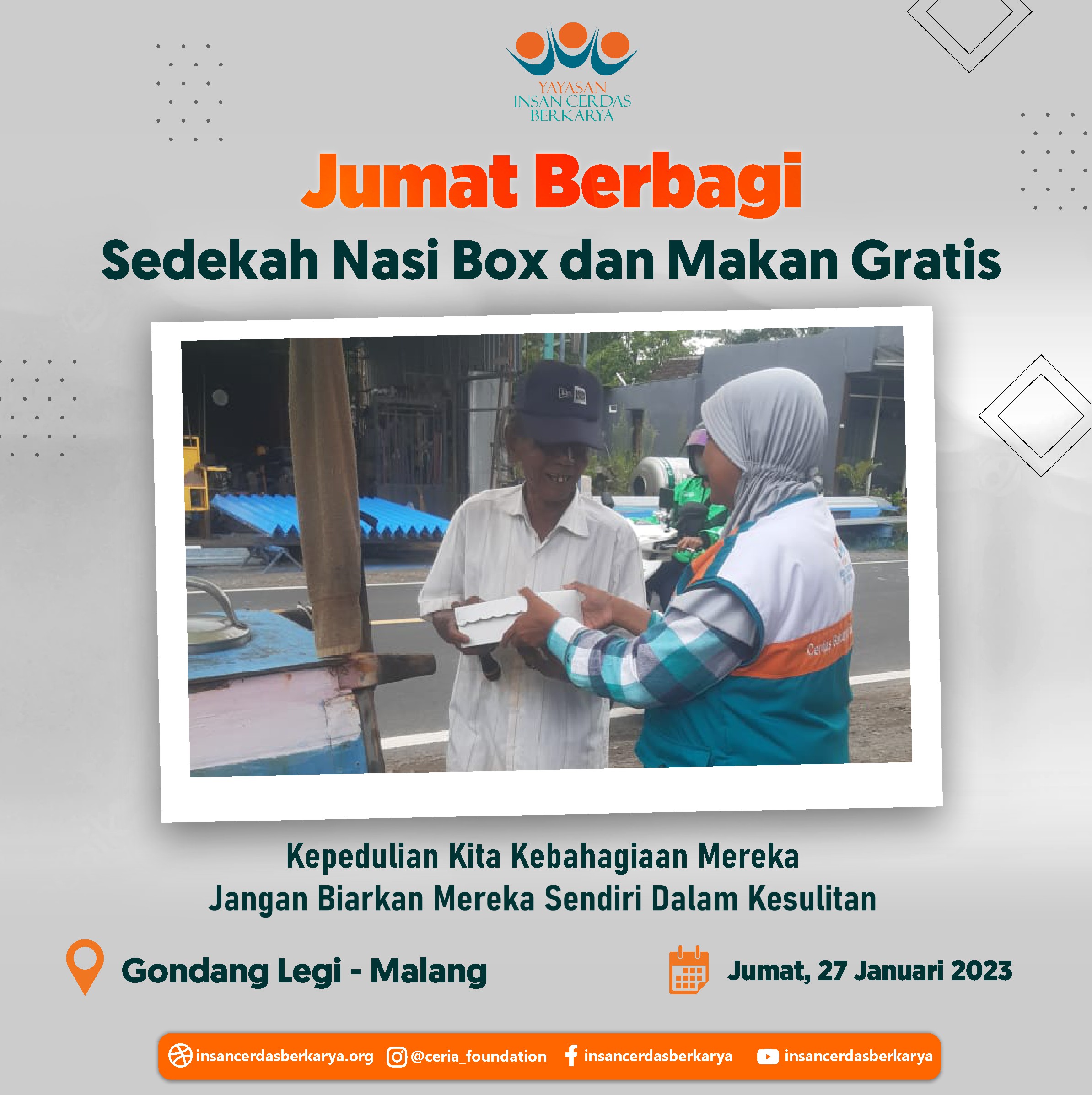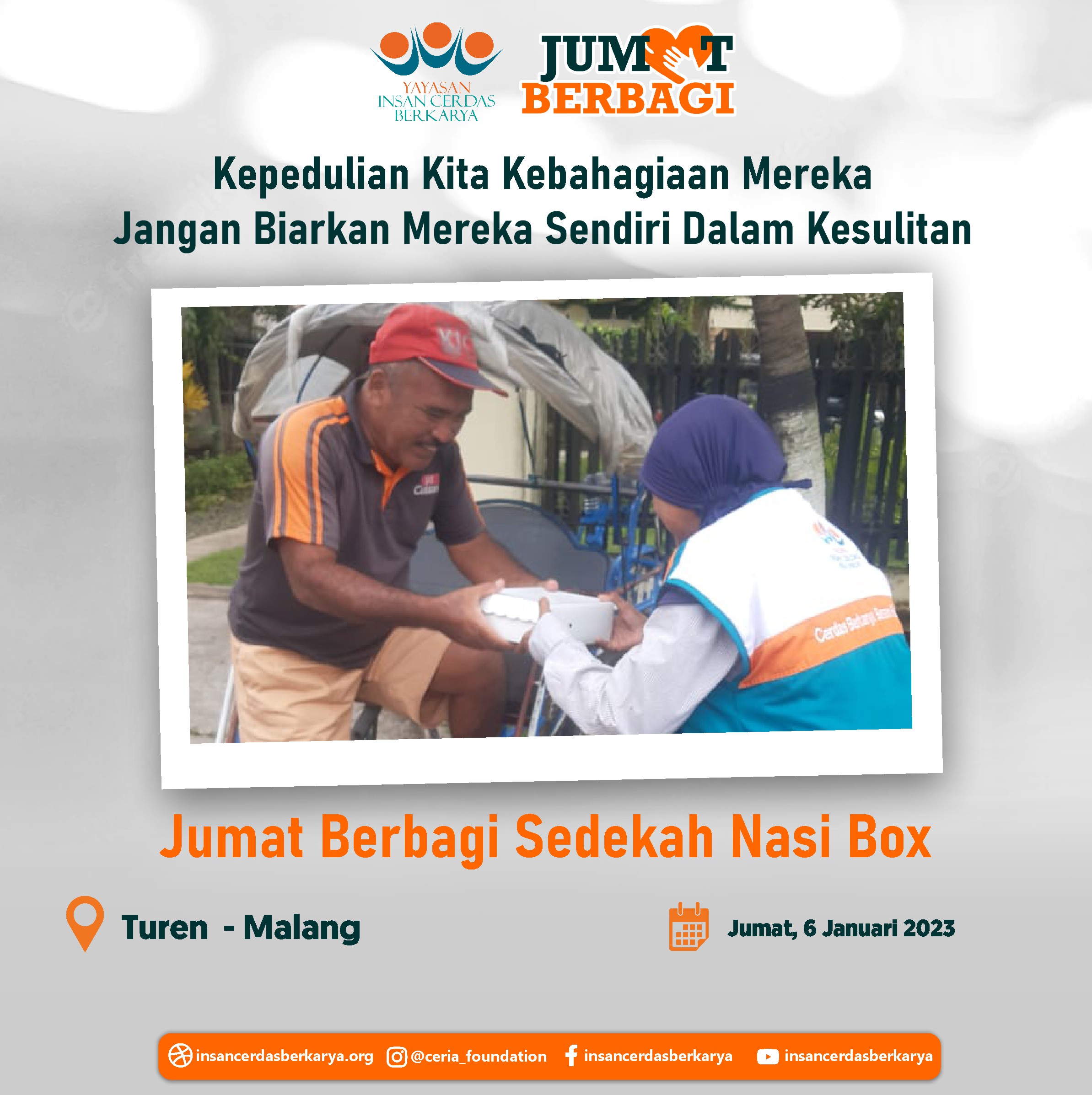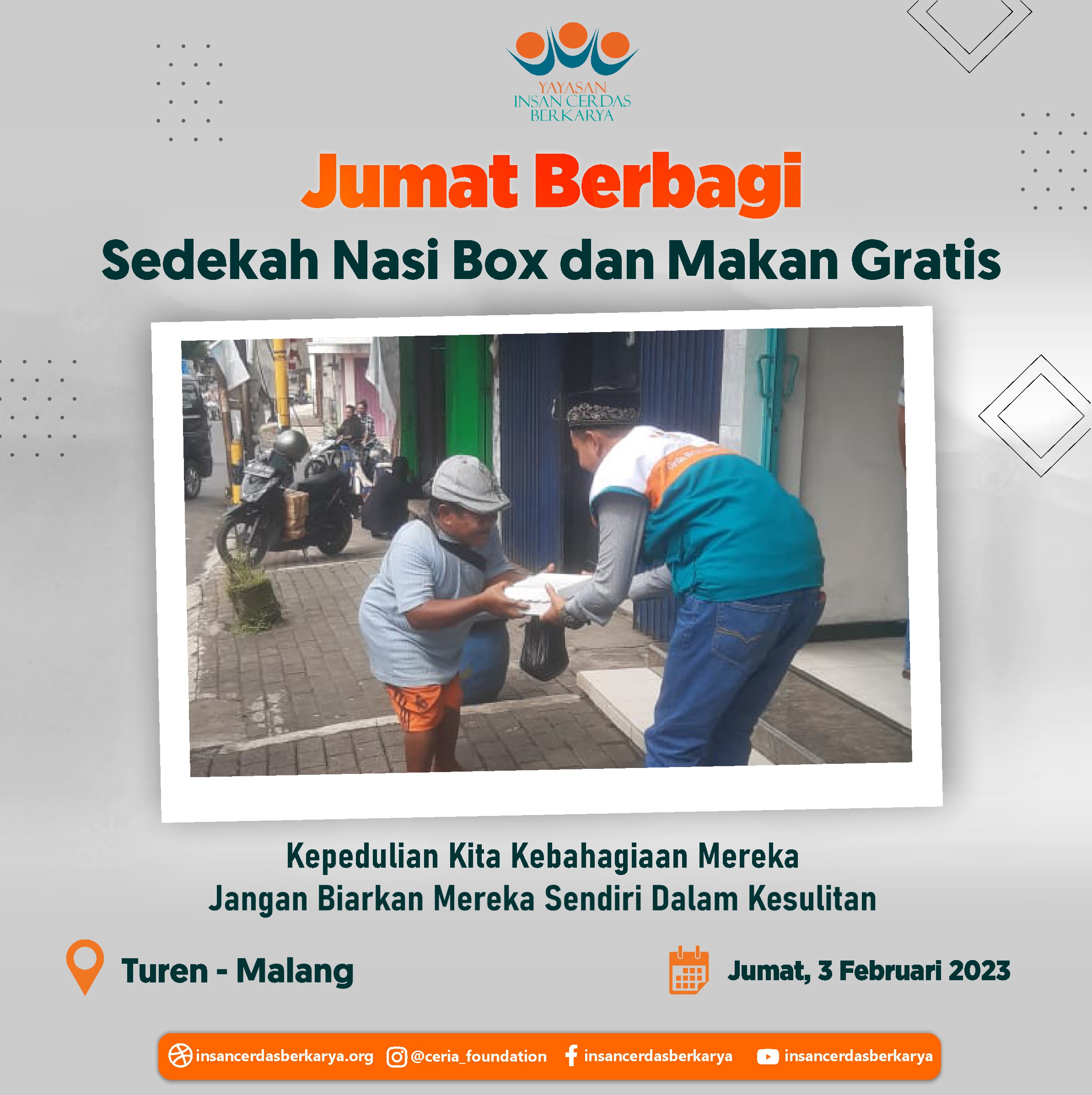Penuh rasa syukur adik-adik serta pengendara ojek online dapat kembali menikmati santap siang dari program *makan gratis Jumat Berbagi YICB* Jumat, 09 Februari 2023 serta penyaluran nasi box kepada tukang becak, pemulung dan pekerja jalanan lainnya di Kec. Bululawang Kab. Malang Jawa Timur.