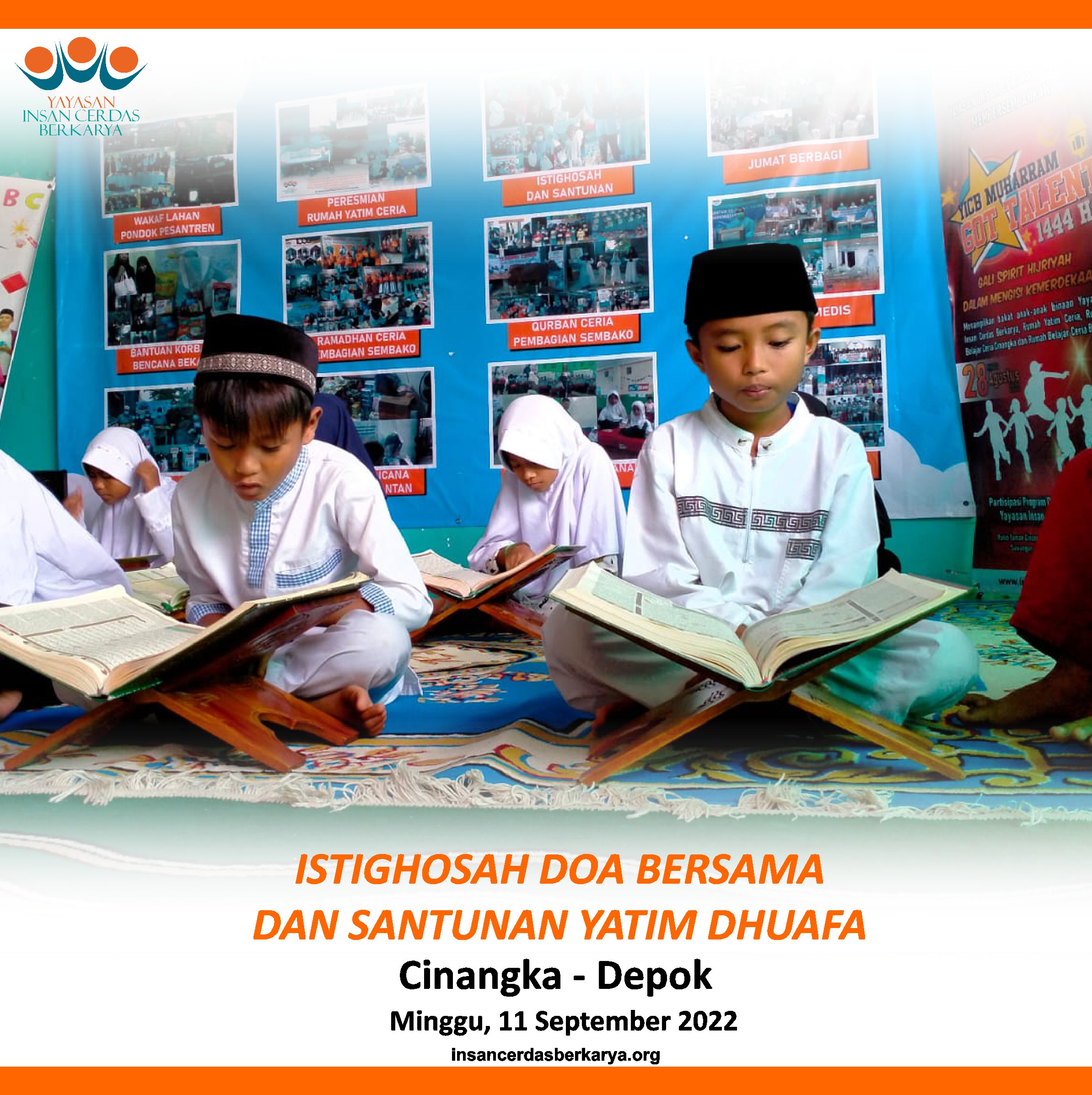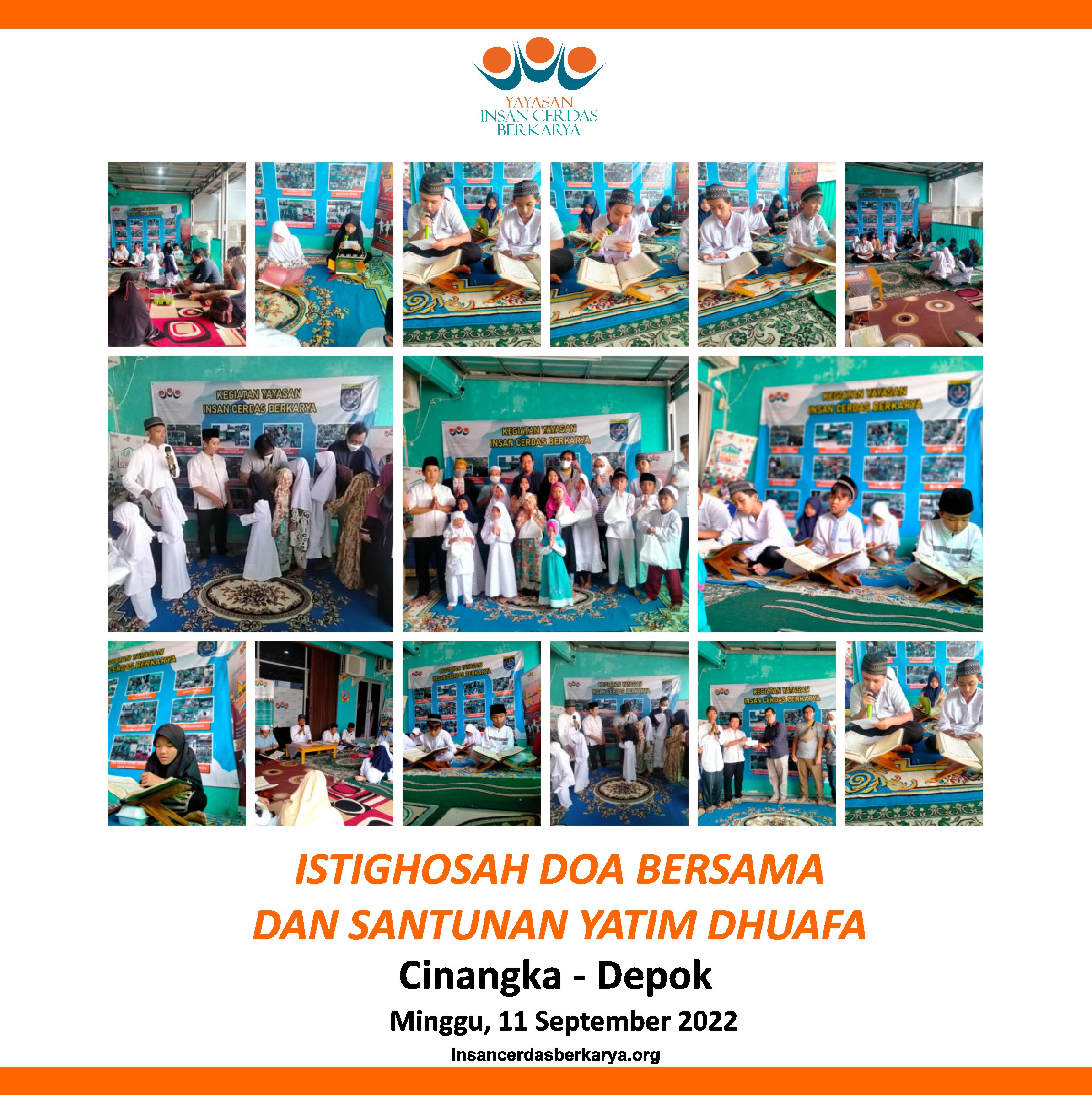 Alhamdulillahirobbiila’lamiin, bersyukur kehadirat Allah SWT karena kegiatan YICB Menebar Cahaya Al Qur’an Tahap 14 pada Sabtu, 01 Oktober 2022 yaitu Penyaluran 50 mushaf Alqur’an, 50 Juz Amma dan santunan kepada anak yatim dhuafa di Masjid At-Taufiq RT 01 RW 05 dusun Pager Sari desa Basuhan Kec.Ermoko kab. Wonogiri Jawa Tengah.