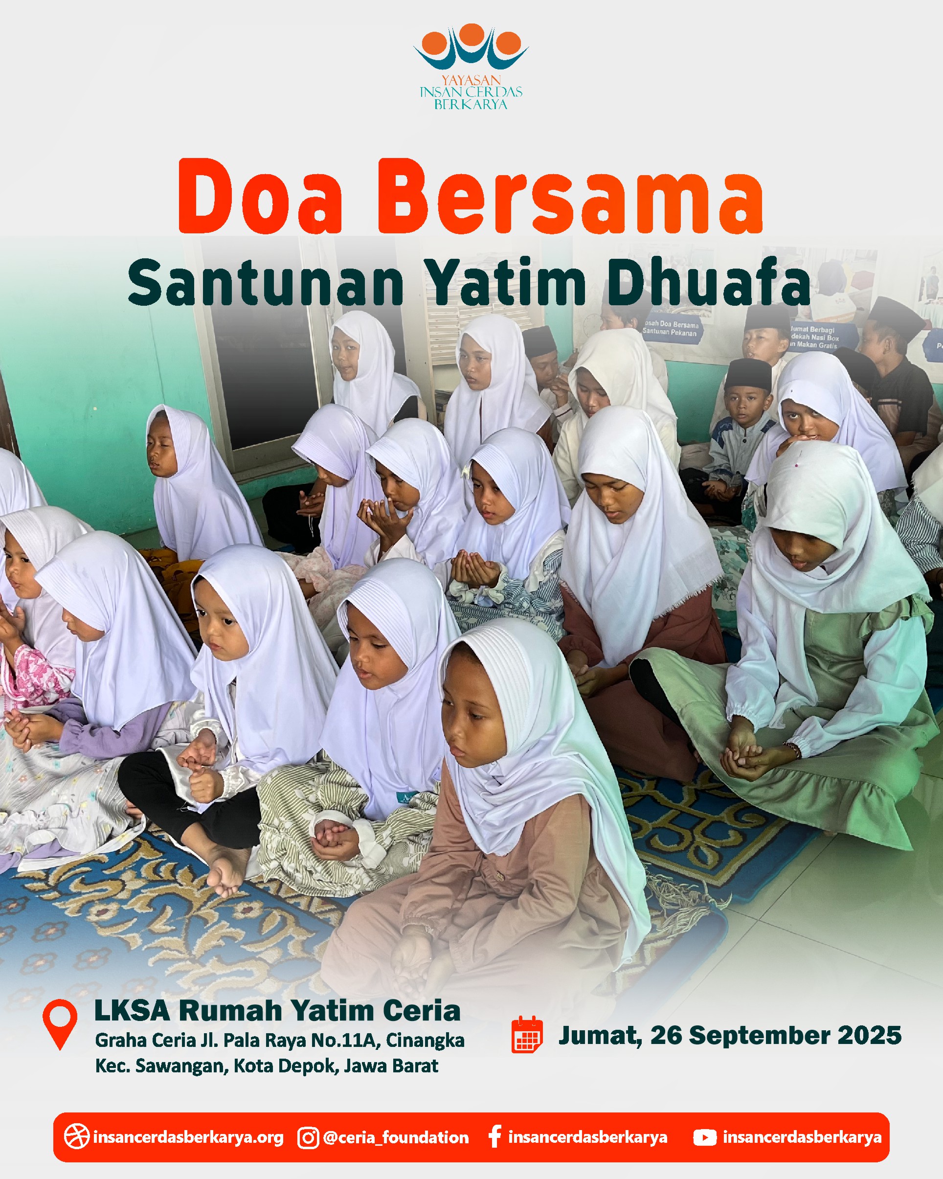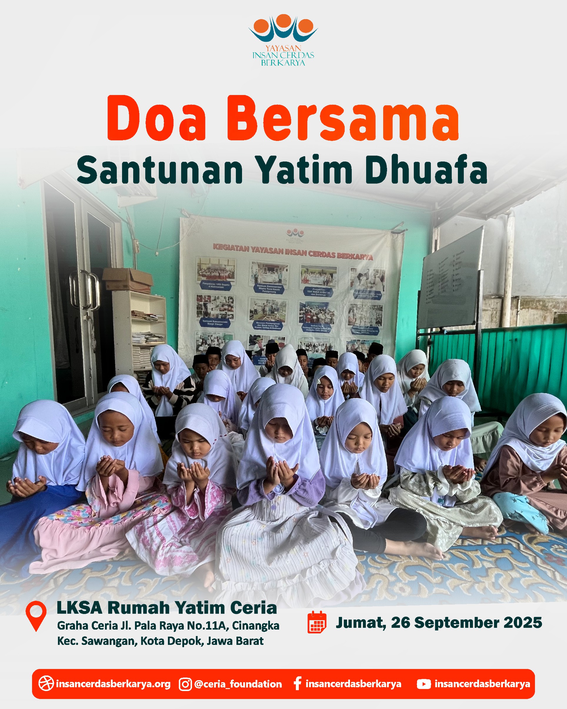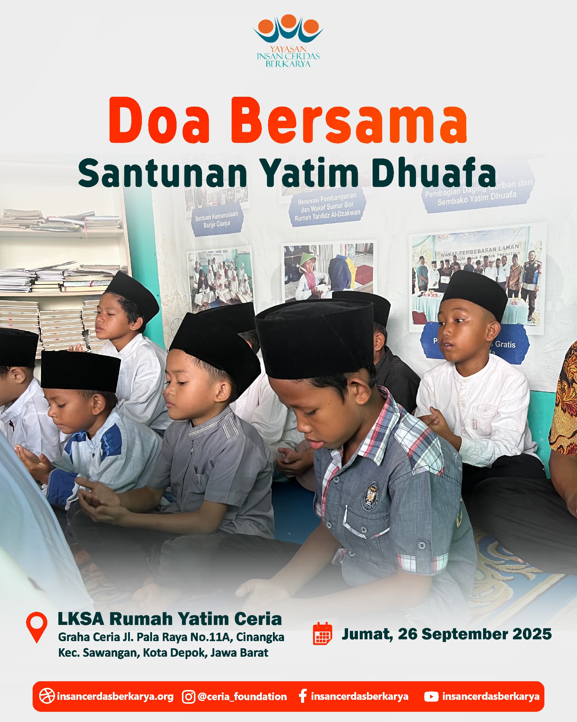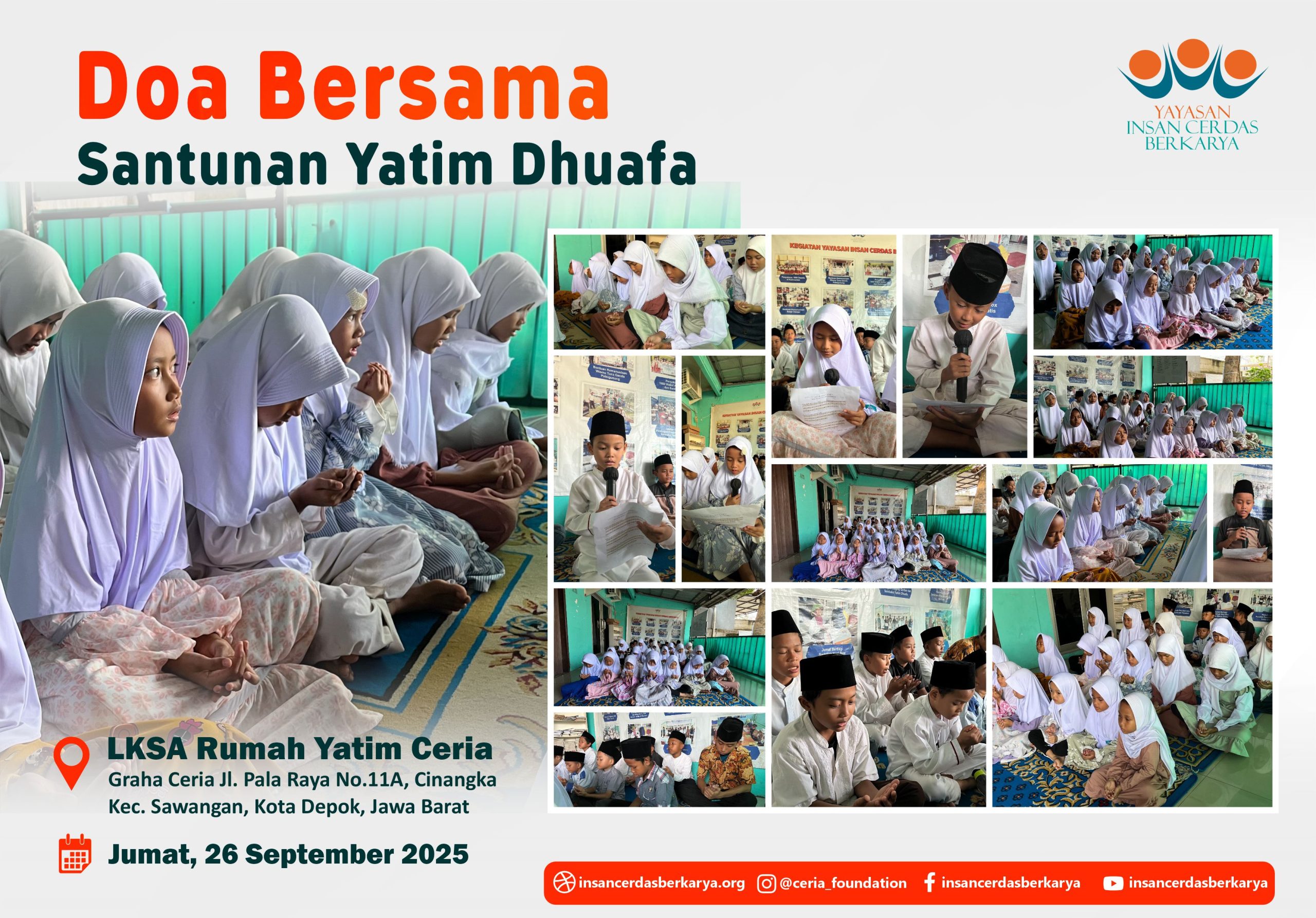 Alhamdulillah, telah terlaksana dengan lancar dan penuh berkah kegiatan Doa Bersama dan Santunan Jum’at Berbagi Makan BerGizi untuk anak-anak yatim dan dhuafa di LKSA Rumah Yatim Ceria YICB di Cinangka, Depok, pada hari Jumat, 26 September 2025. Dalam suasana yang teduh dan penuh kasih, wajah-wajah polos para adik-adik yatim dhuafa menengadahkan tangan, memanjatkan doa-doa tulus untuk setiap titipan doa dan hajat Ayah Bunda. Doa untuk para Almarhum/mah semoga diterima amal ibadahnya, diampuni dosa dosanya, di berikan tempat yang layak di sisiNya Jannatunna’iim Aamiin 🤲.