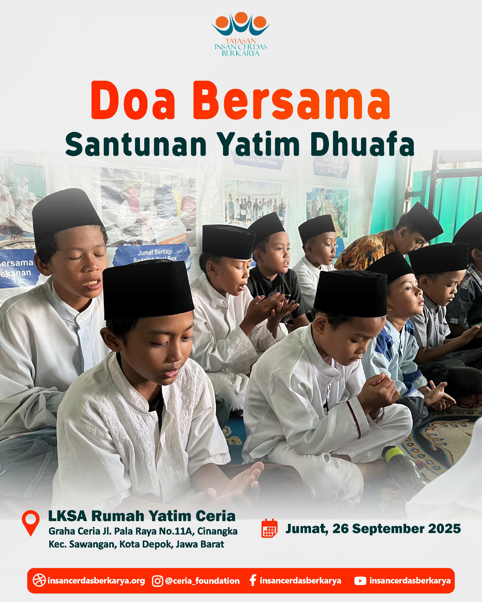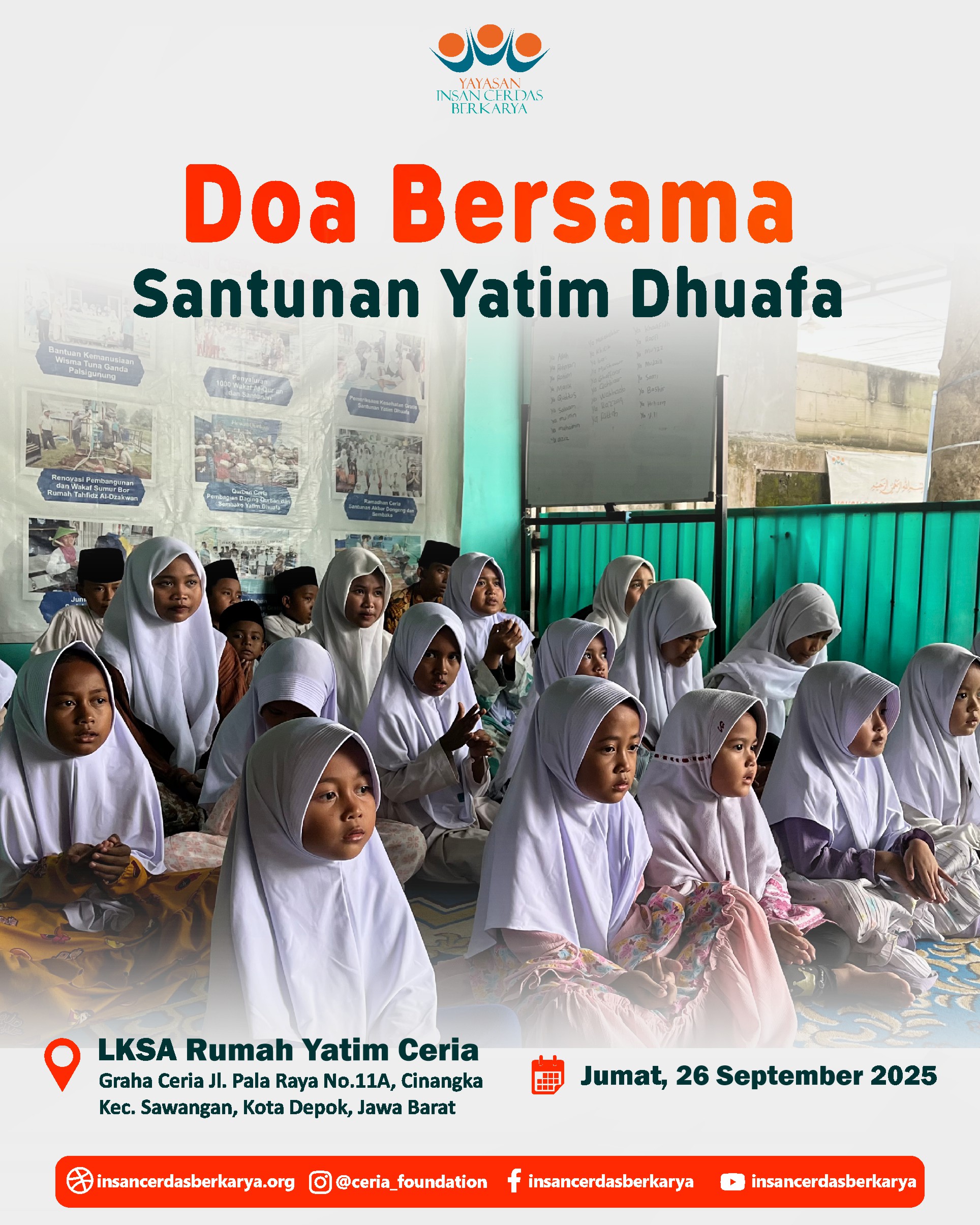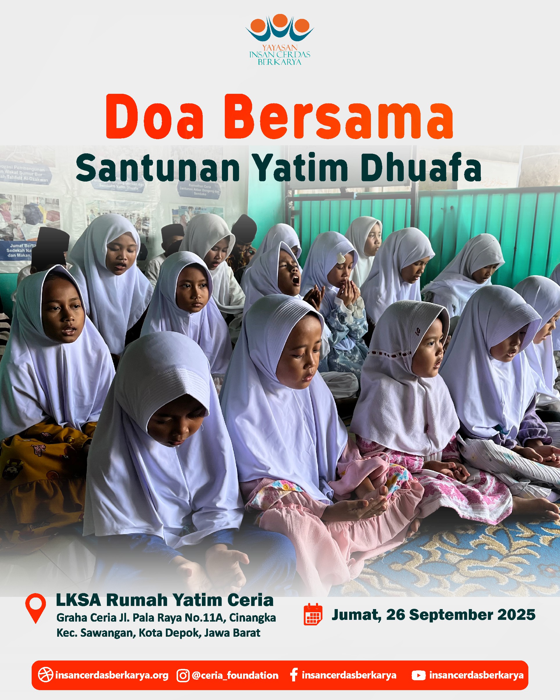 Alhamdulillah, telah terlaksana dengan lancar dan penuh berkah kegiatan Doa Bersama dan Santunan Jum’at Berbagi Makan BerGizi untuk anak-anak yatim dan dhuafa di LKSA Rumah Yatim Ceria YICB di Cinangka, Depok, pada hari Jumat, 26 September 2025. Dalam suasana yang teduh dan penuh kasih, wajah-wajah polos para adik-adik yatim dhuafa menengadahkan tangan, memanjatkan doa-doa tulus untuk setiap titipan doa dan hajat Ayah Bunda. Doa untuk para Almarhum/mah semoga diterima amal ibadahnya, diampuni dosa dosanya, di berikan tempat yang layak di sisiNya Jannatunna’iim Aamiin 🤲.