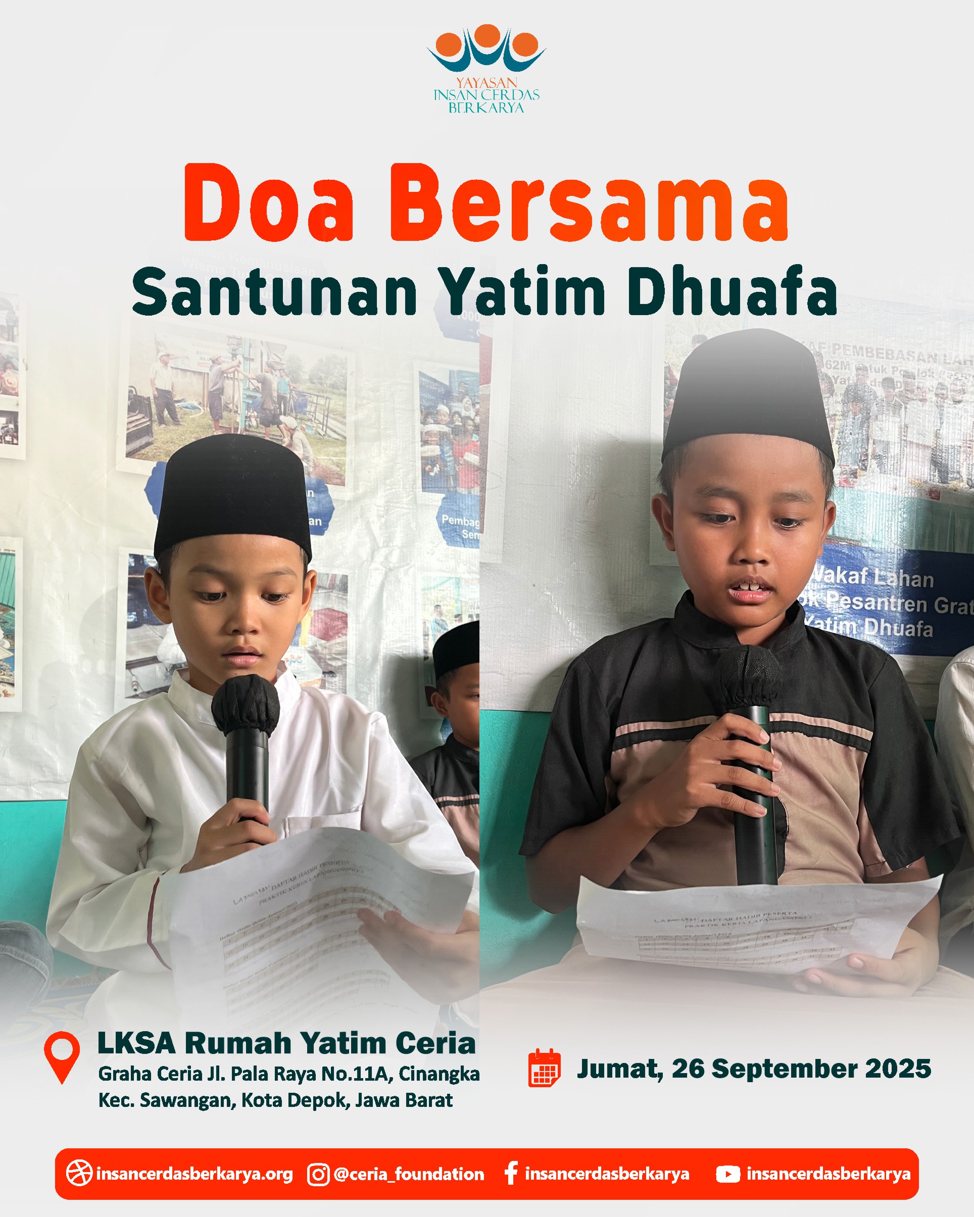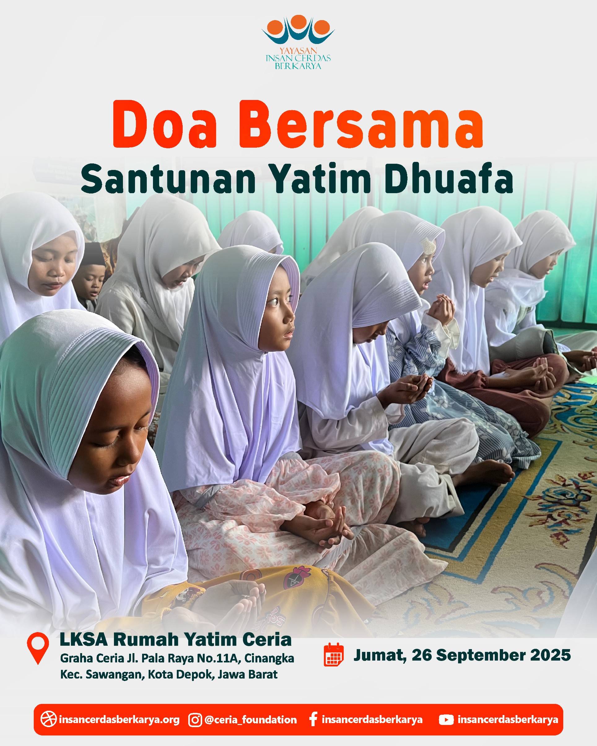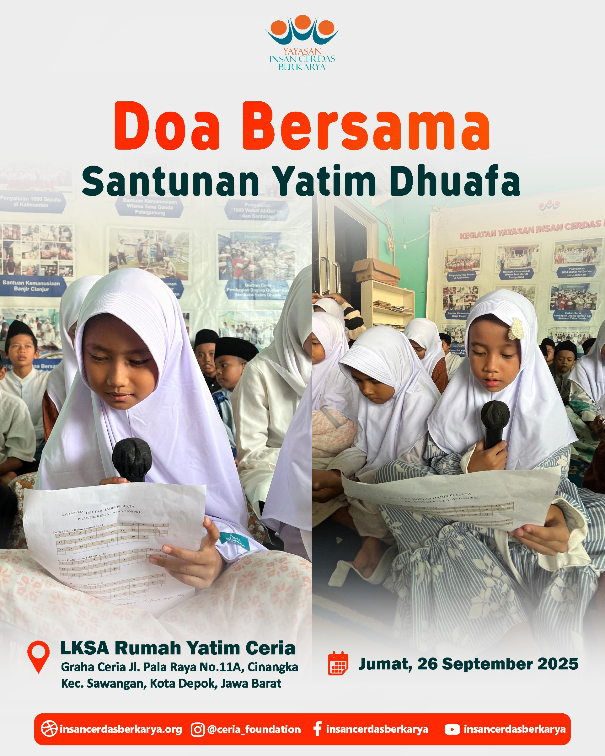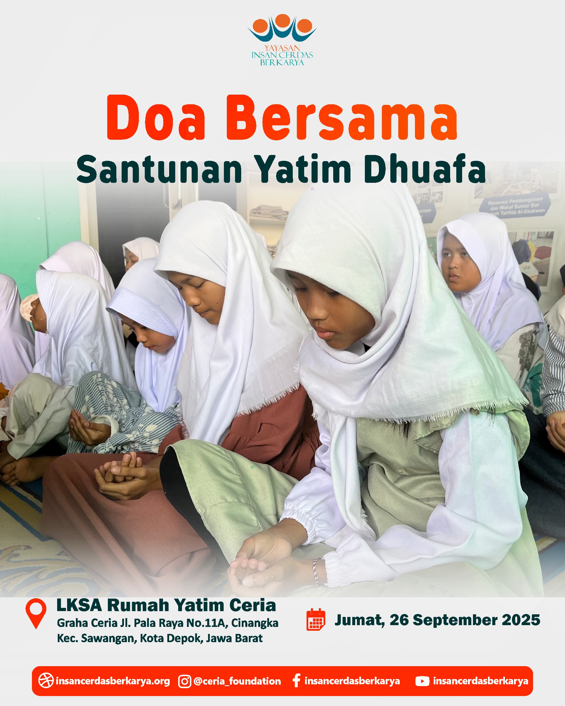 Alhamdulillah, telah terlaksana dengan lancar dan penuh berkah kegiatan Doa Bersama dan Santunan Jum’at Berbagi Makan BerGizi untuk anak-anak yatim dan dhuafa di LKSA Rumah Yatim Ceria YICB di Cinangka, Depok, pada hari Jumat, 26 September 2025. Dalam suasana yang teduh dan penuh kasih, wajah-wajah polos para adik-adik yatim dhuafa menengadahkan tangan, memanjatkan doa-doa tulus untuk setiap titipan doa dan hajat Ayah Bunda. Doa untuk para Almarhum/mah semoga diterima amal ibadahnya, diampuni dosa dosanya, di berikan tempat yang layak di sisiNya Jannatunna’iim Aamiin 🤲.