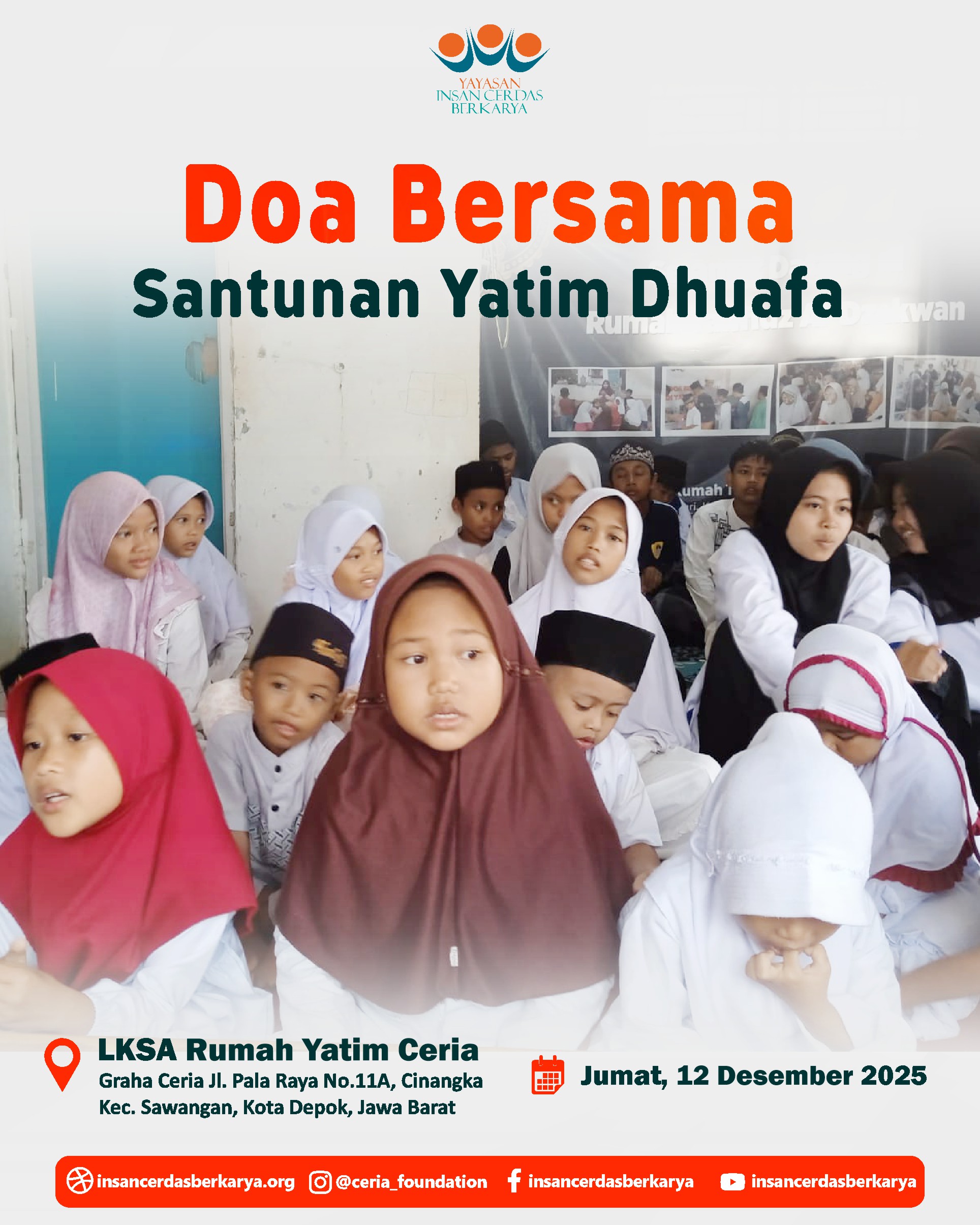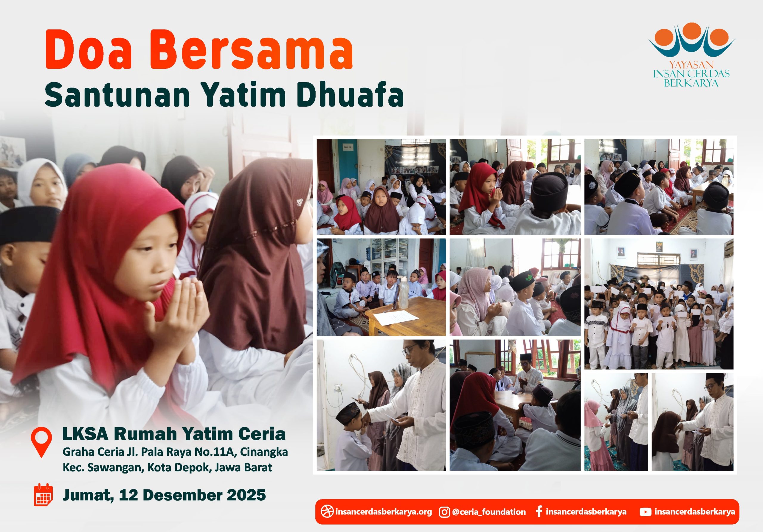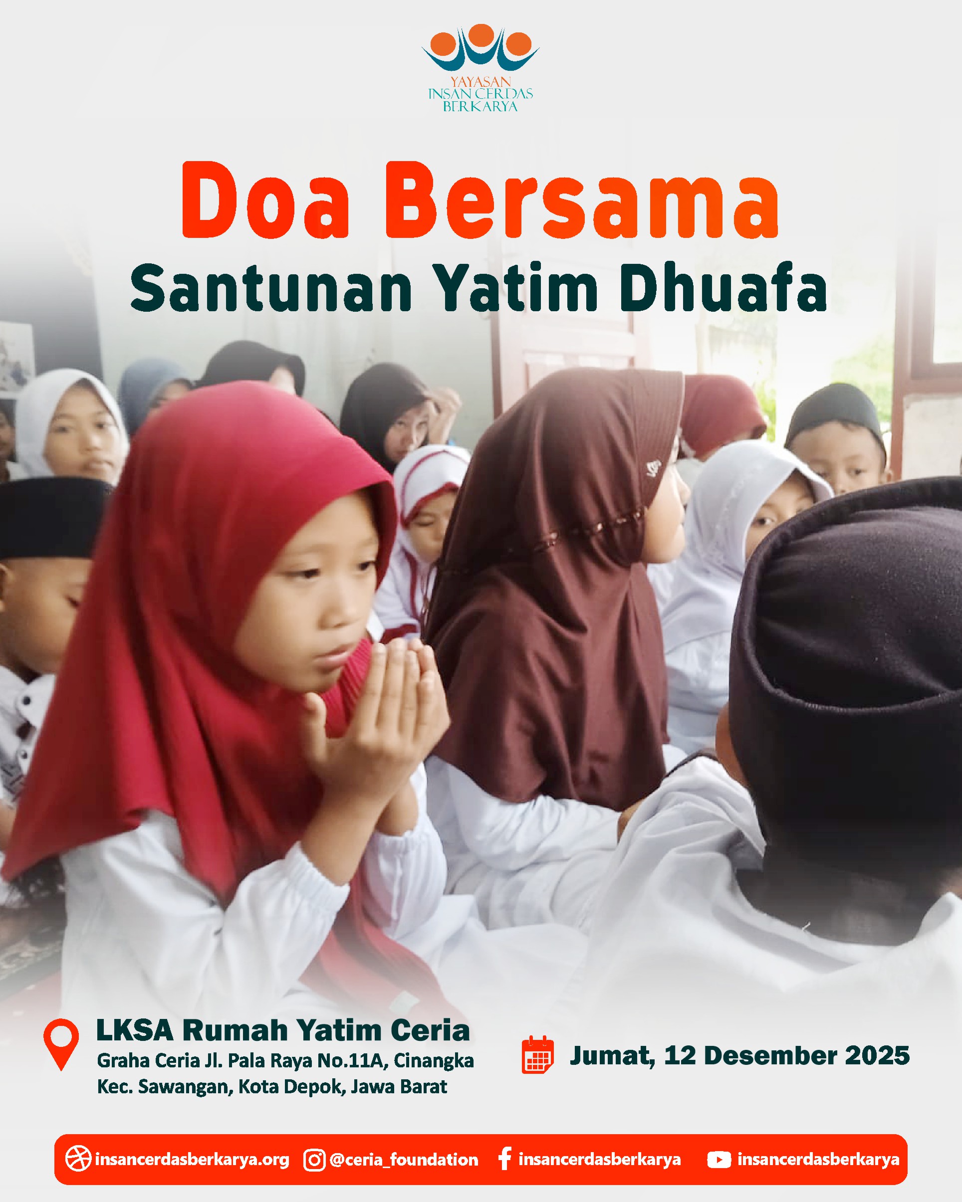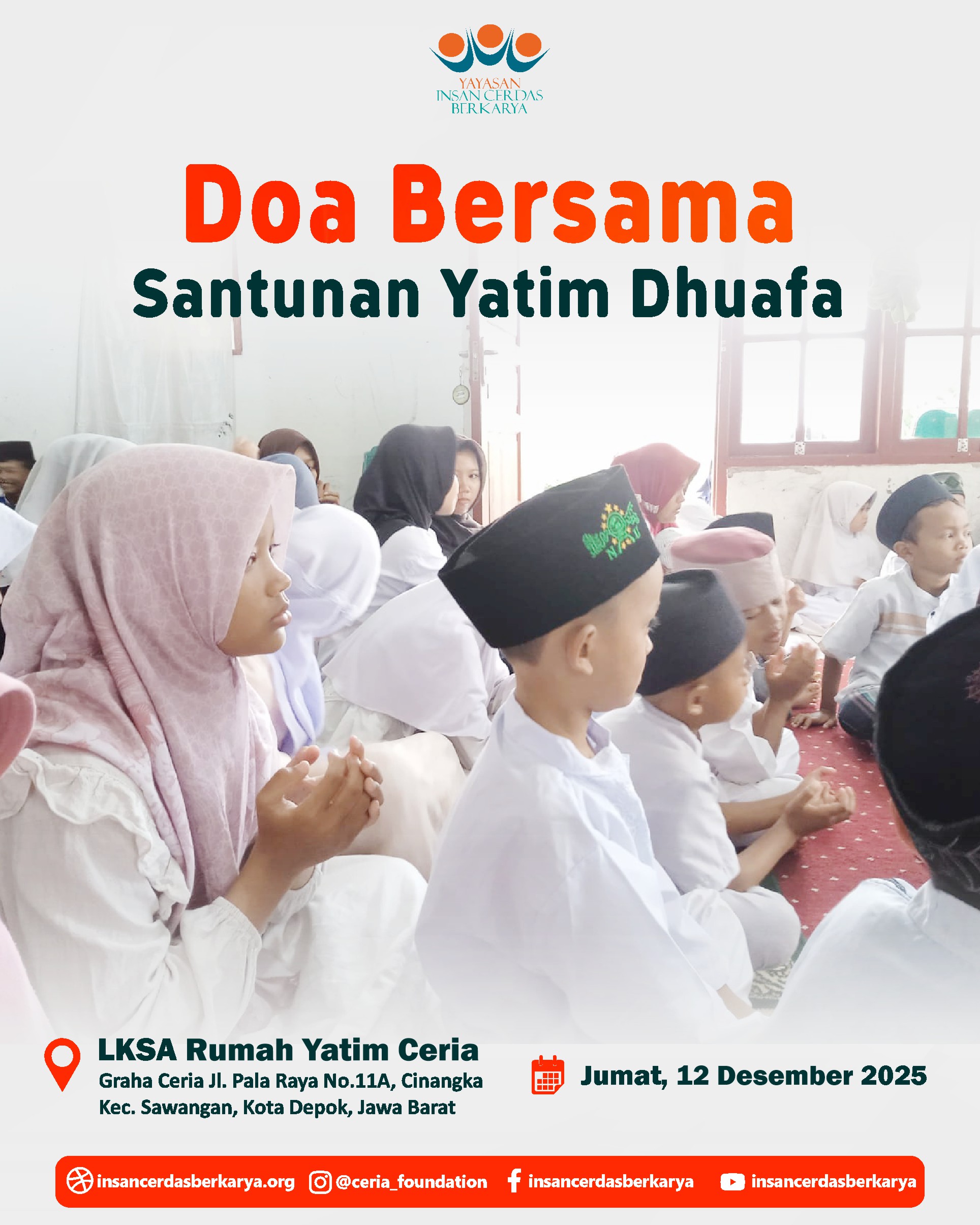 Alhamdulillah bersyukur dengan penuh kehangatan dan kebahagiaan atas terlaksananya kembali kegiatan rutin Doa Bersama dan Santunan “Jum’at Berbagi Makan BerGizi” pada hari Jum’at, 12 Desember 2025 untuk anak-anak binaan LKSA Rumah Yatim Ceria YICB di Cimanggu, Bogor.