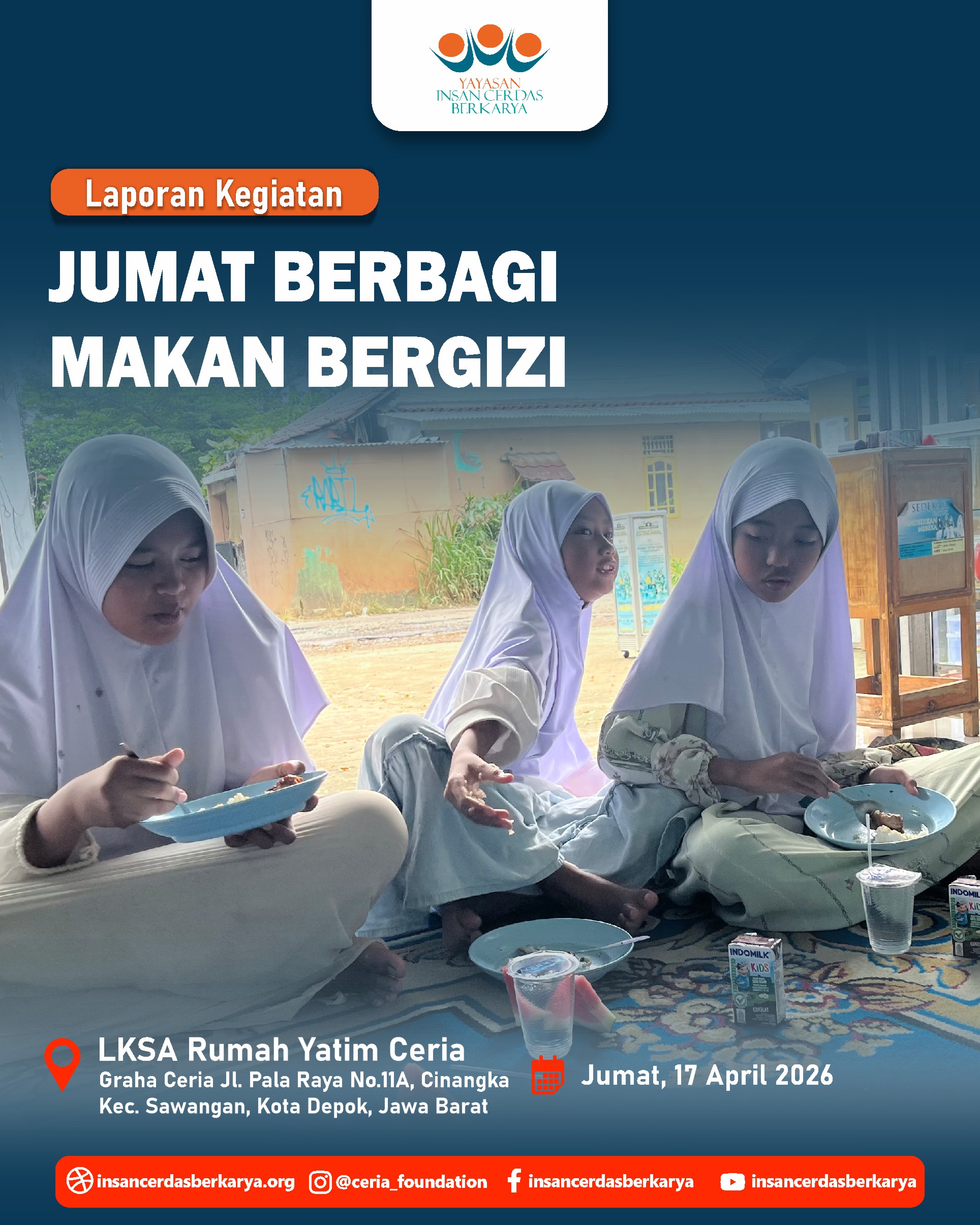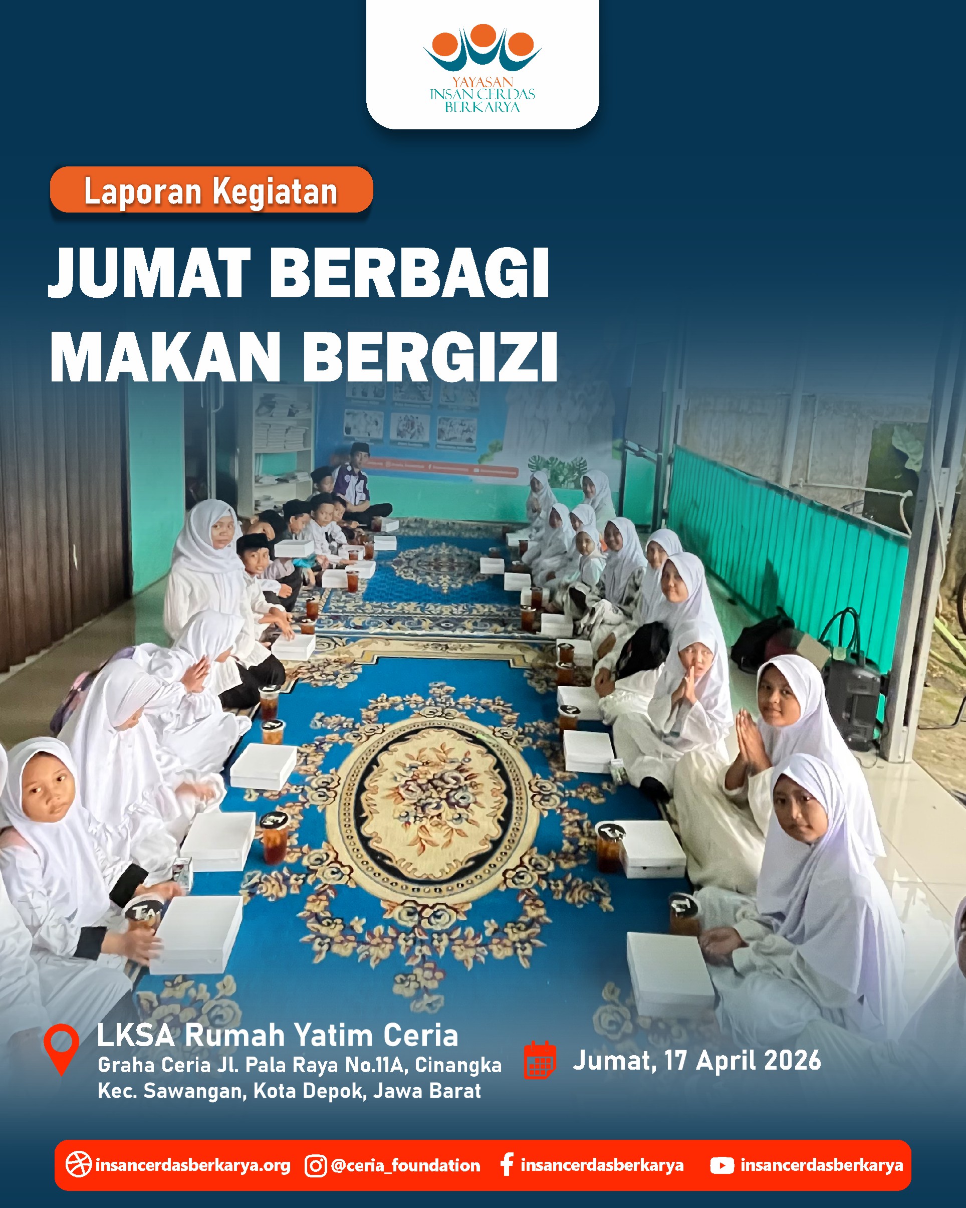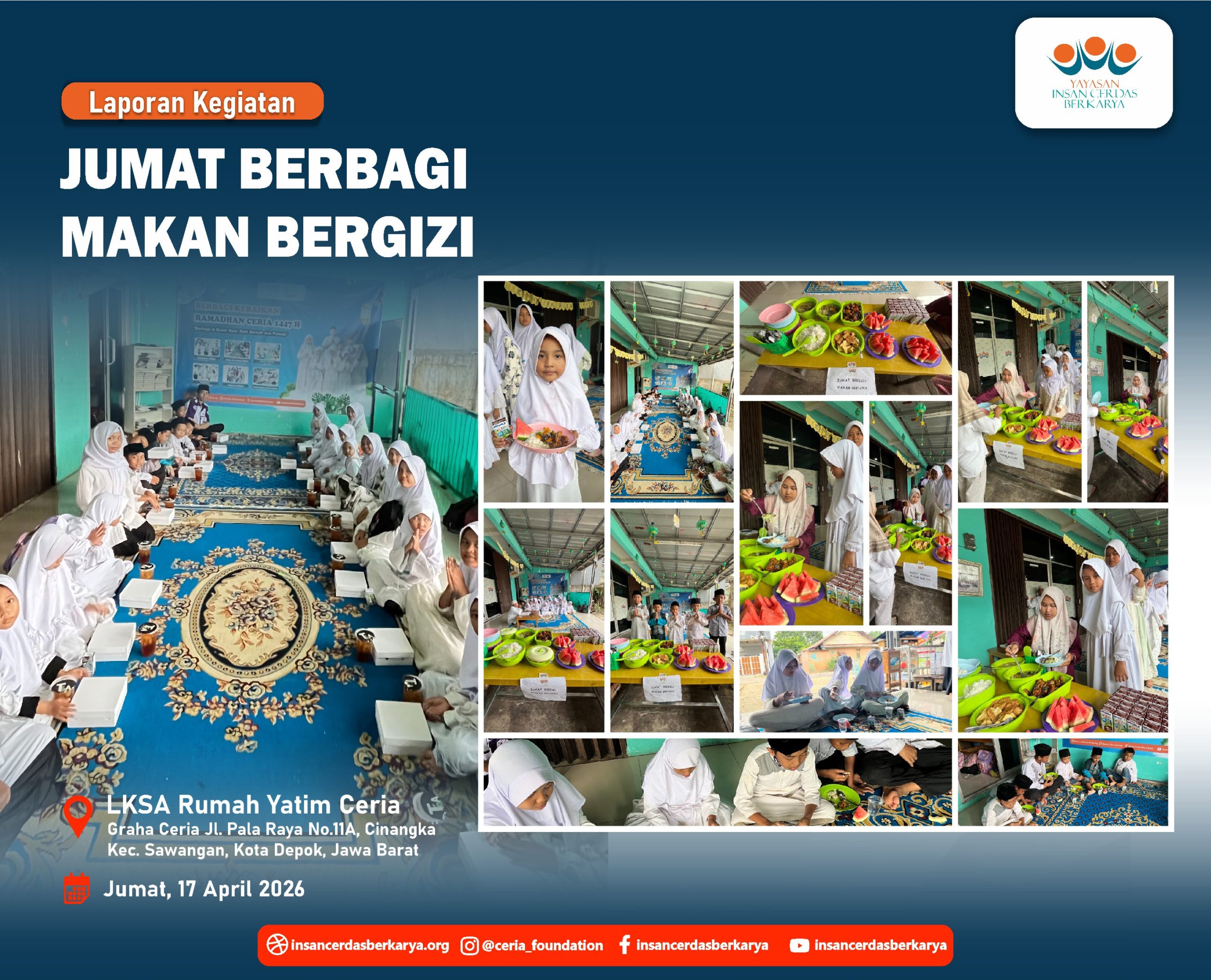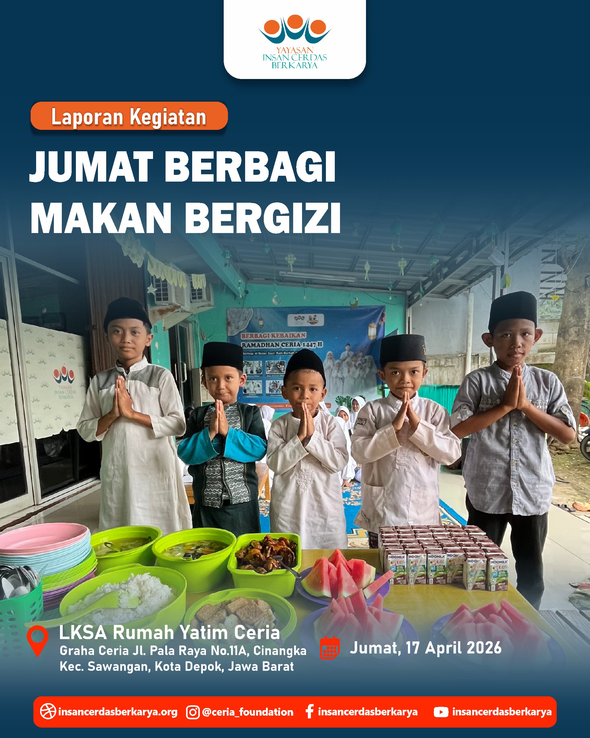 Titipan sedekah Ayah/Bunda melalui kegiatan Doa Bersama dan Santunan Jum’at Berbagi Makan Bergizi pada 17 April 2026 telah kami sampaikan kepada anak-anak yatim dhuafa LKSA Rumah Yatim Ceria YICB. Senyum tulus mereka menjadi saksi atas kedermawanan Ayah/Bunda. Semoga setiap bulir nasi yang mereka makan menjadi pemberat timbangan amal dan pembuka pintu surga bagi keluarga. 🤲