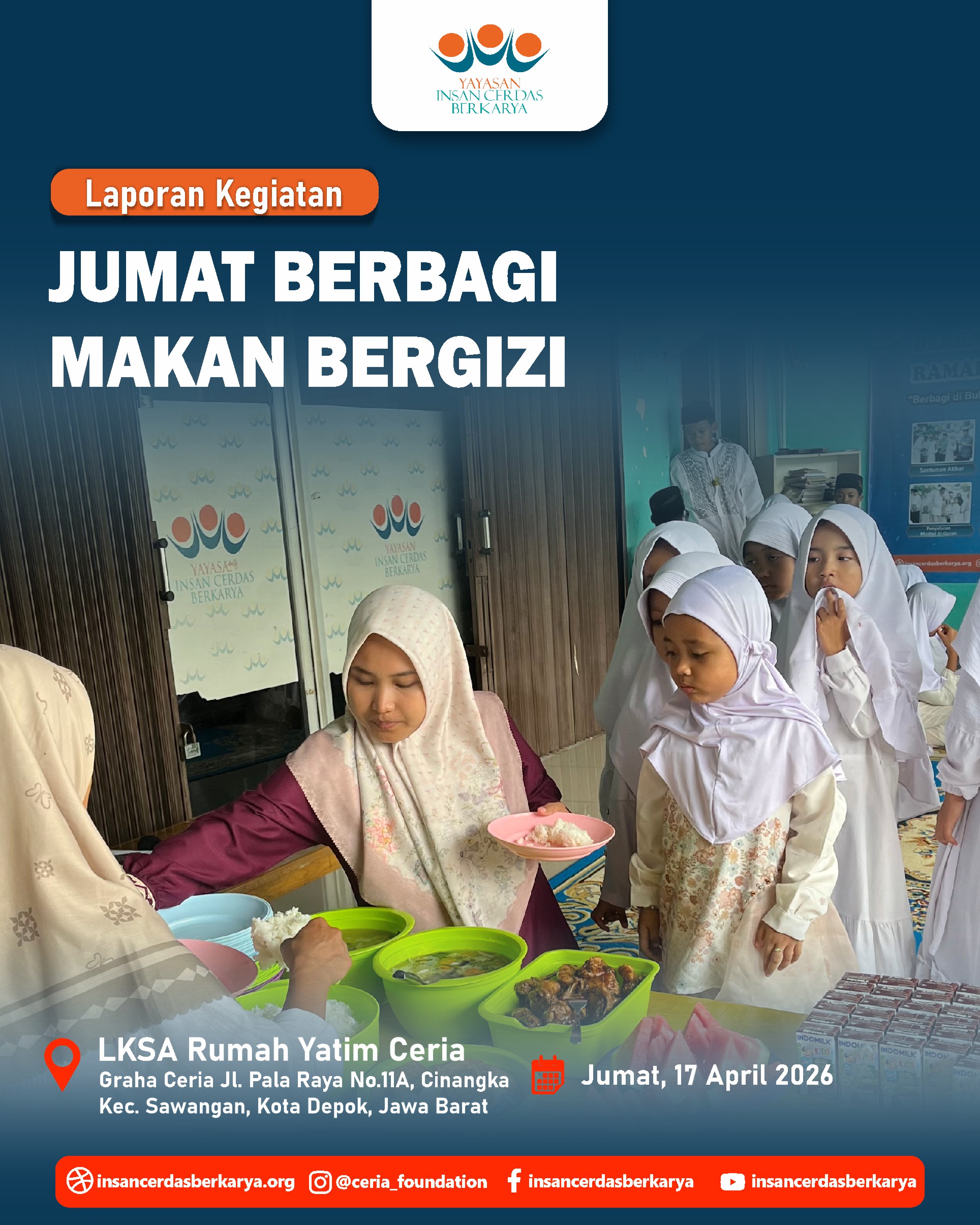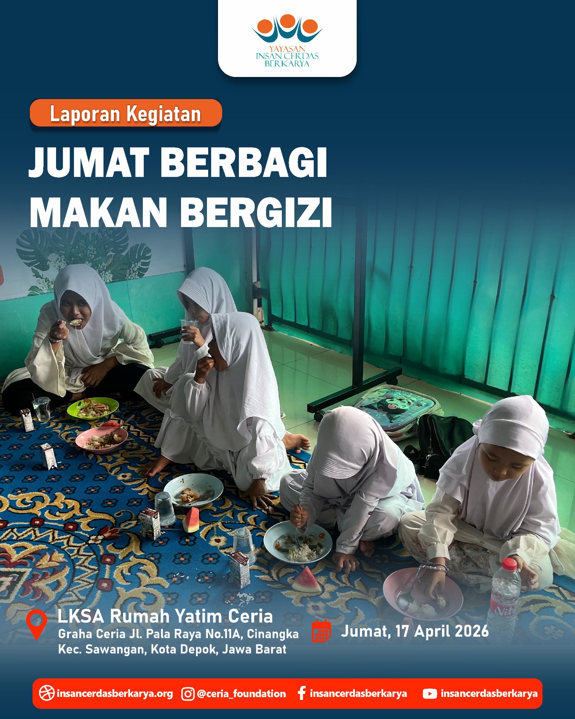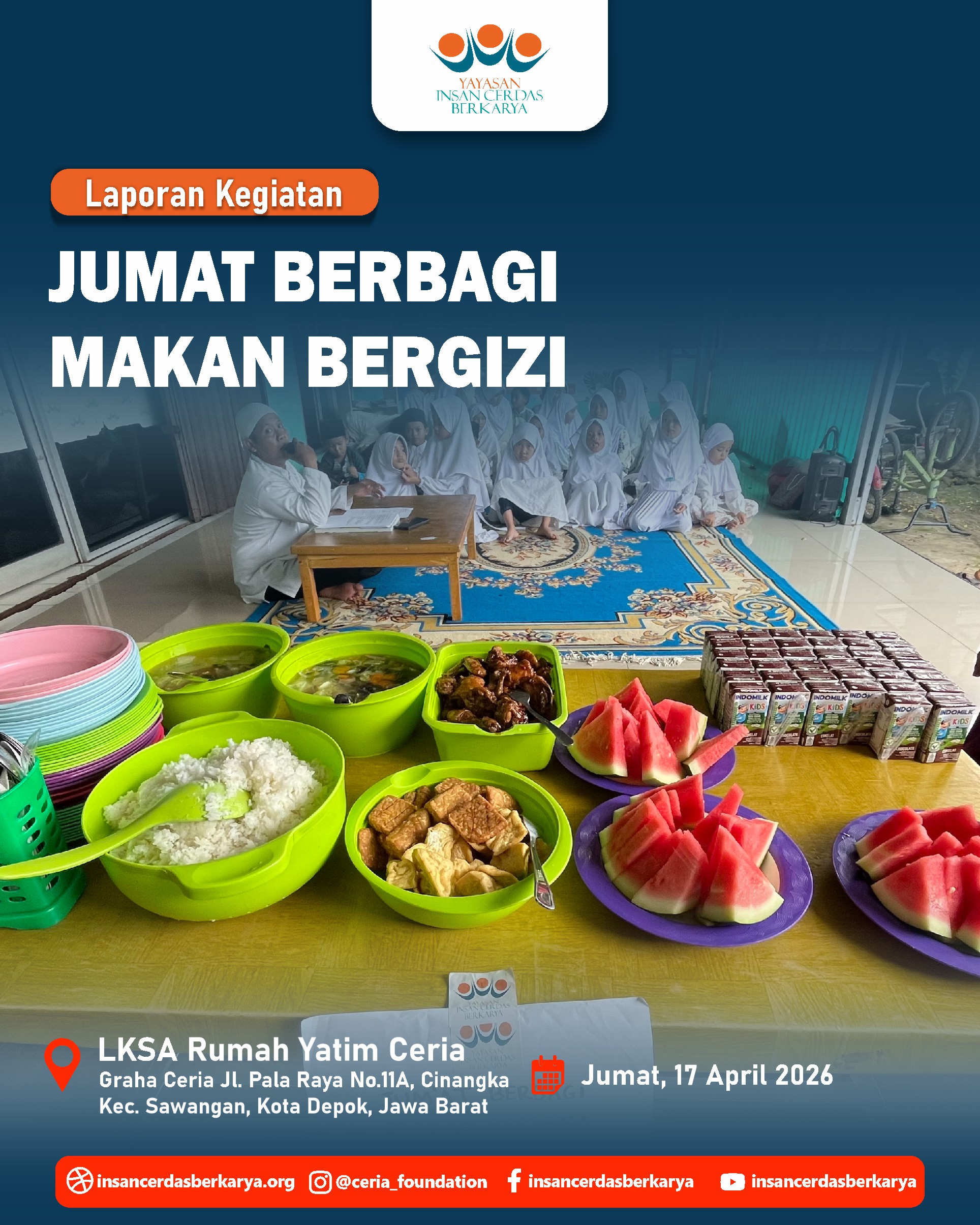 Titipan sedekah Ayah/Bunda melalui kegiatan Doa Bersama dan Santunan Jum’at Berbagi Makan Bergizi pada 17 April 2026 telah kami sampaikan kepada anak-anak yatim dhuafa LKSA Rumah Yatim Ceria YICB. Senyum tulus mereka menjadi saksi atas kedermawanan Ayah/Bunda. Semoga setiap bulir nasi yang mereka makan menjadi pemberat timbangan amal dan pembuka pintu surga bagi keluarga. 🤲