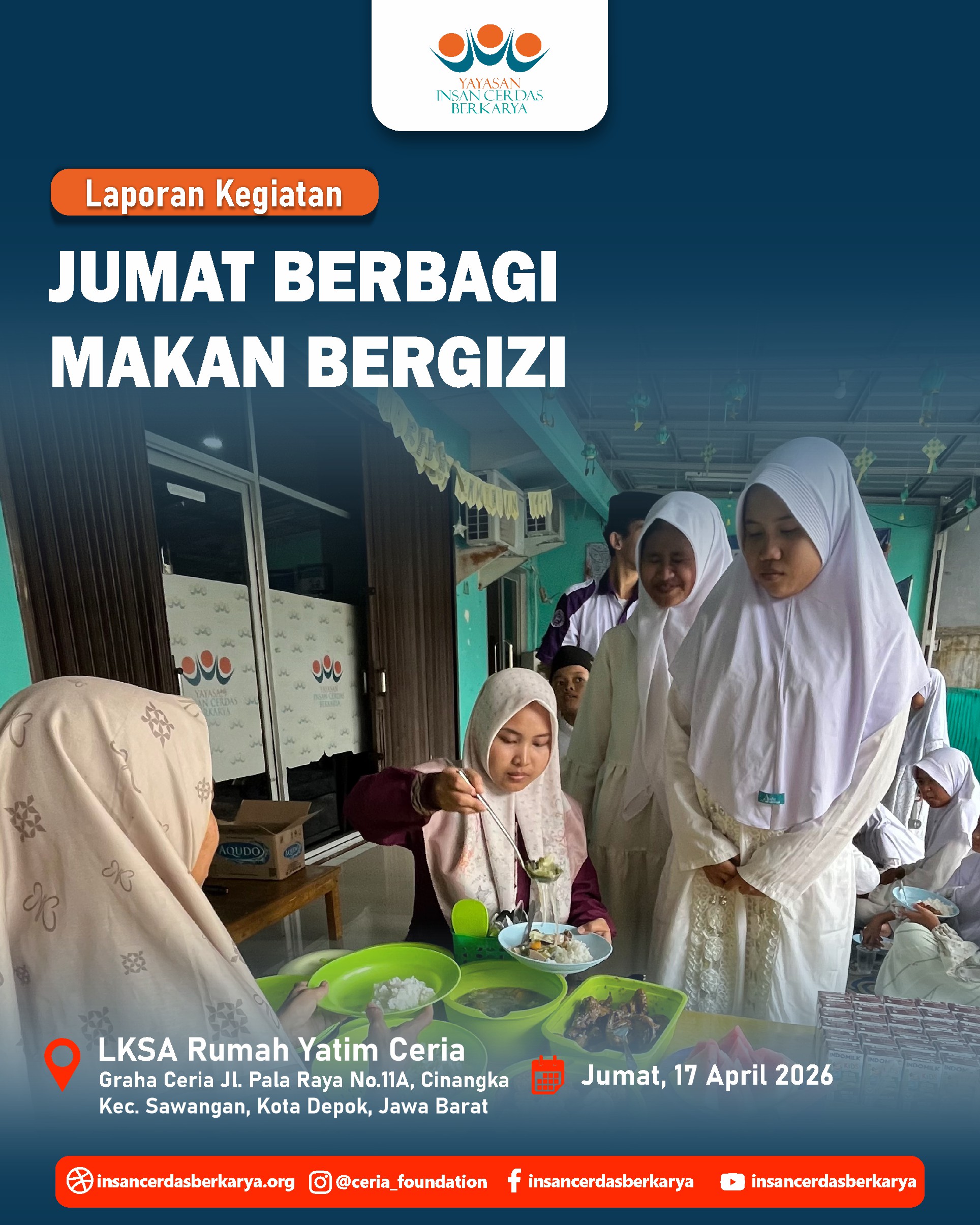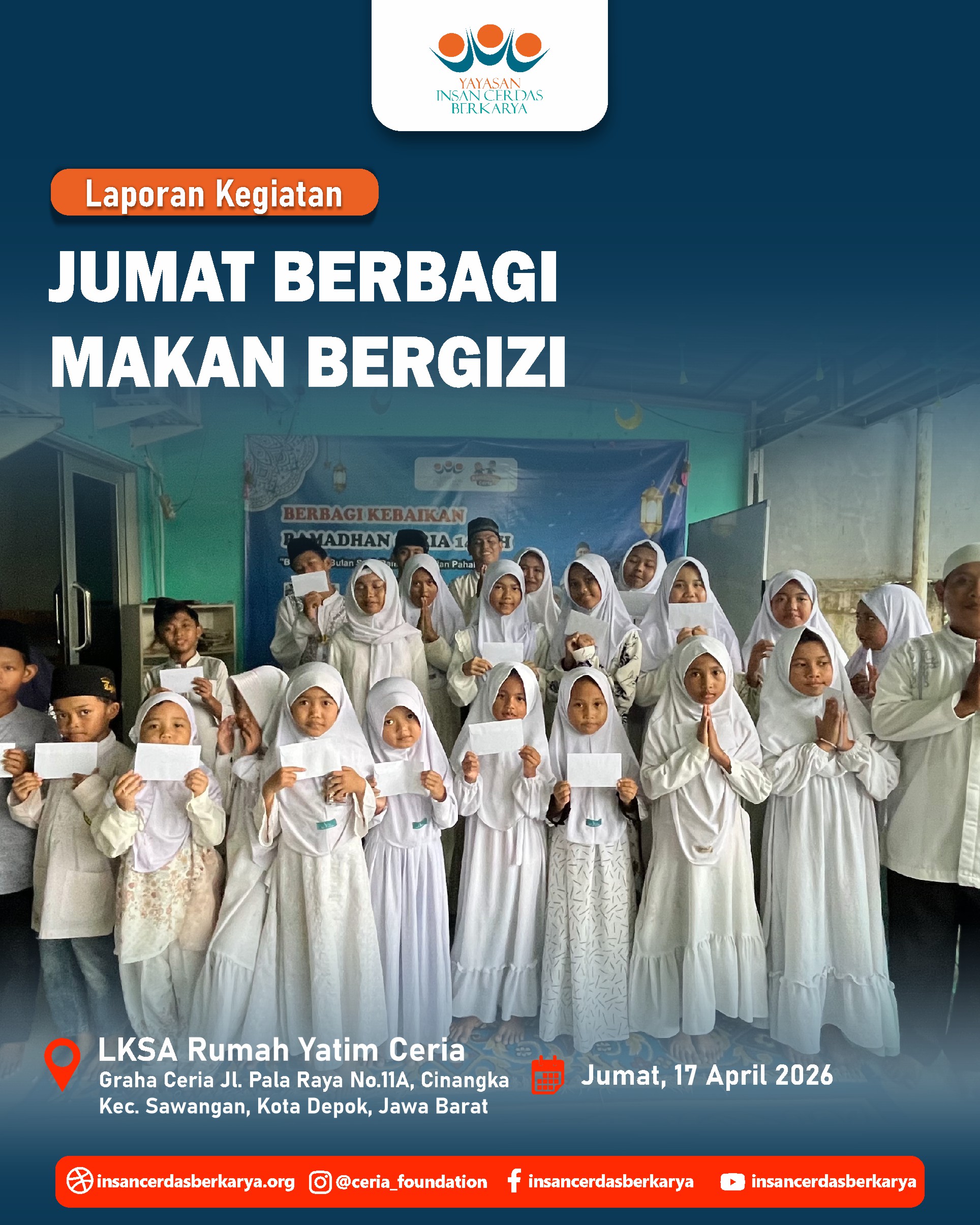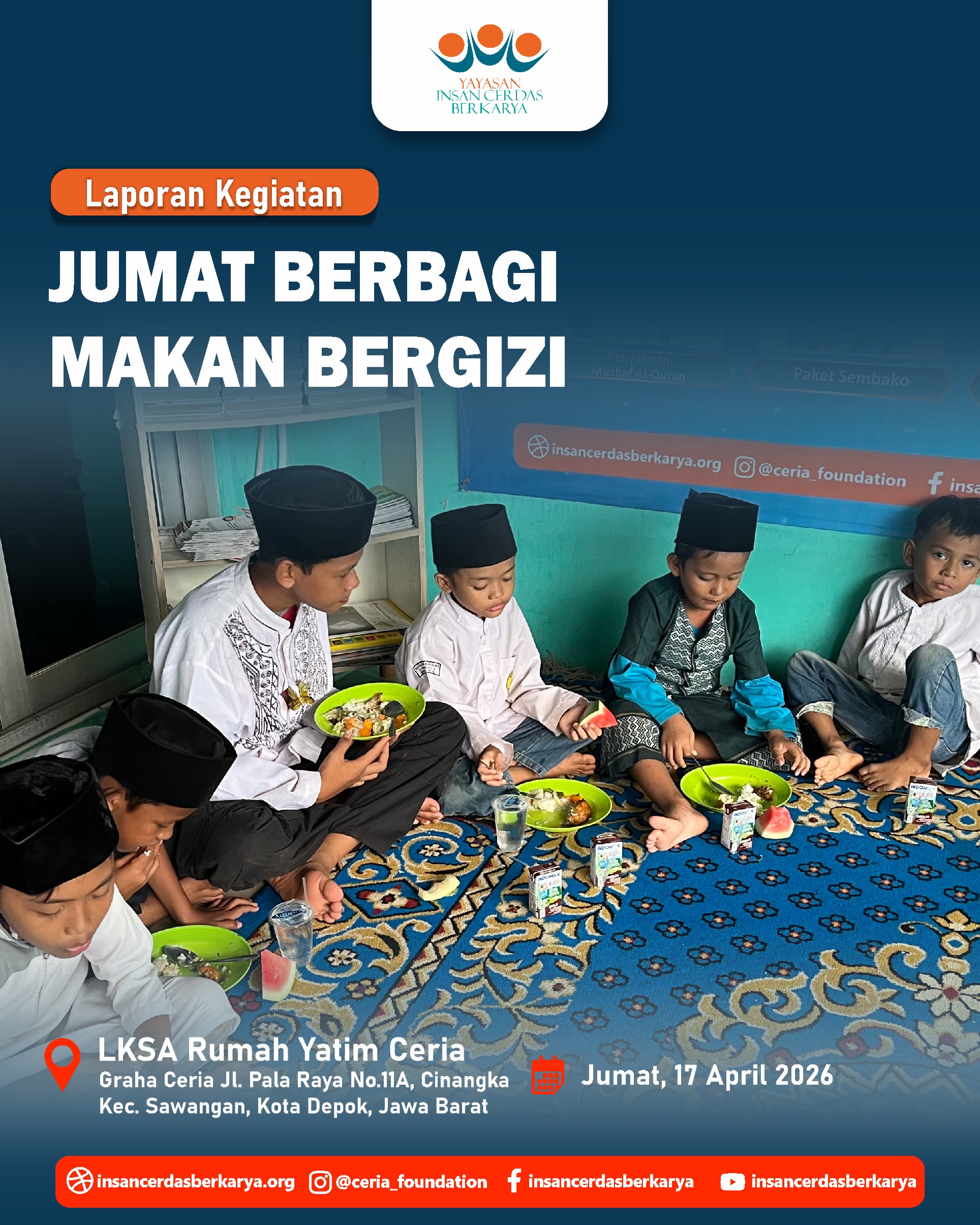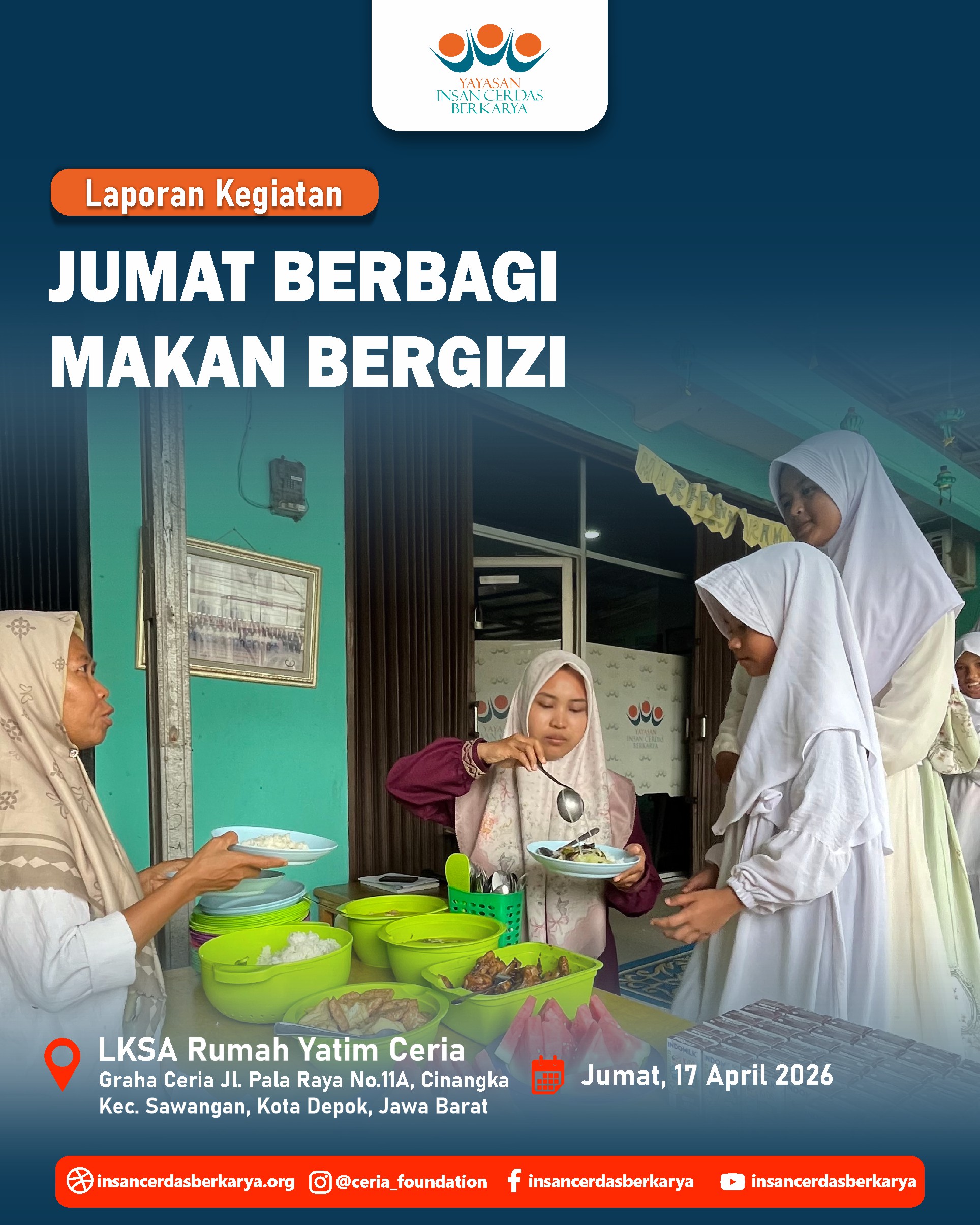 Titipan sedekah Ayah/Bunda melalui kegiatan Doa Bersama dan Santunan Jum’at Berbagi Makan Bergizi pada 17 April 2026 telah kami sampaikan kepada anak-anak yatim dhuafa LKSA Rumah Yatim Ceria YICB. Senyum tulus mereka menjadi saksi atas kedermawanan Ayah/Bunda. Semoga setiap bulir nasi yang mereka makan menjadi pemberat timbangan amal dan pembuka pintu surga bagi keluarga. 🤲