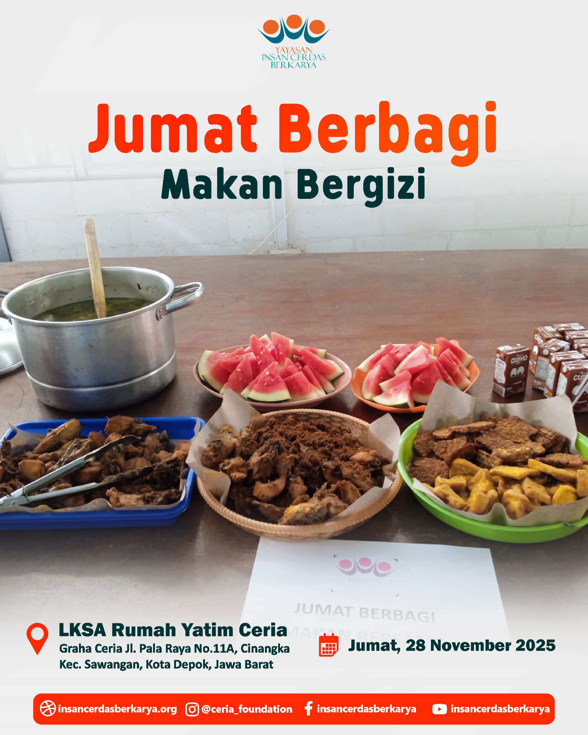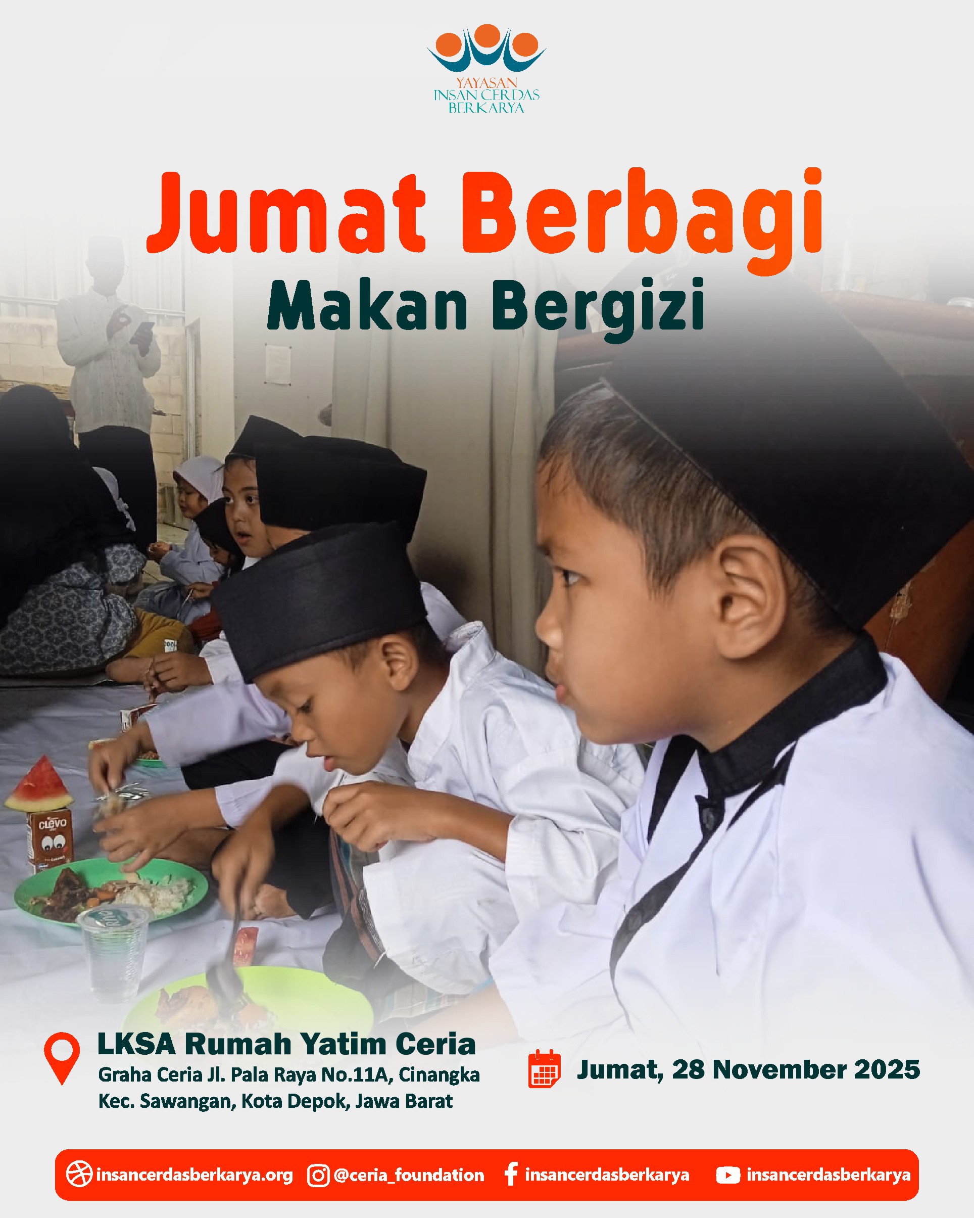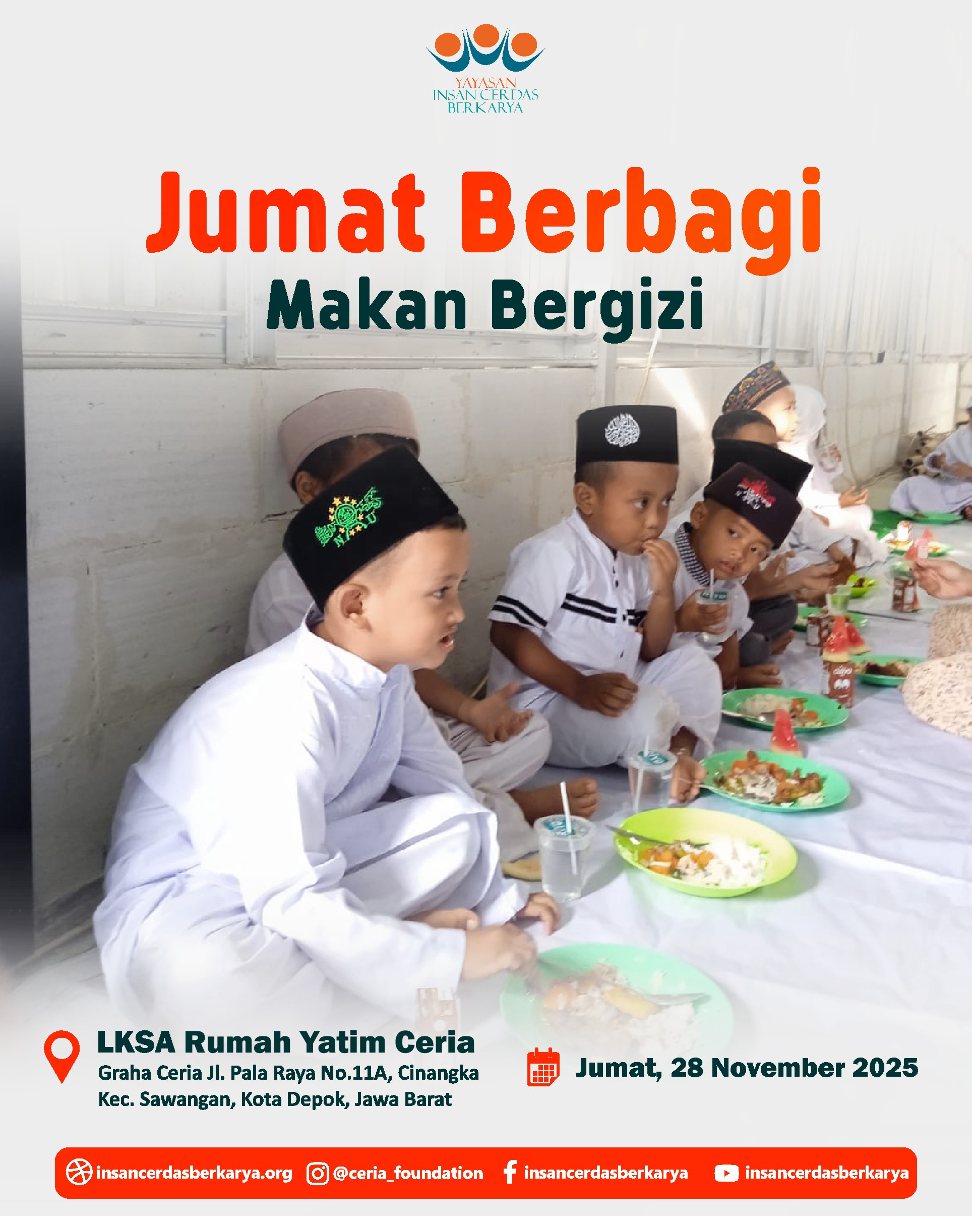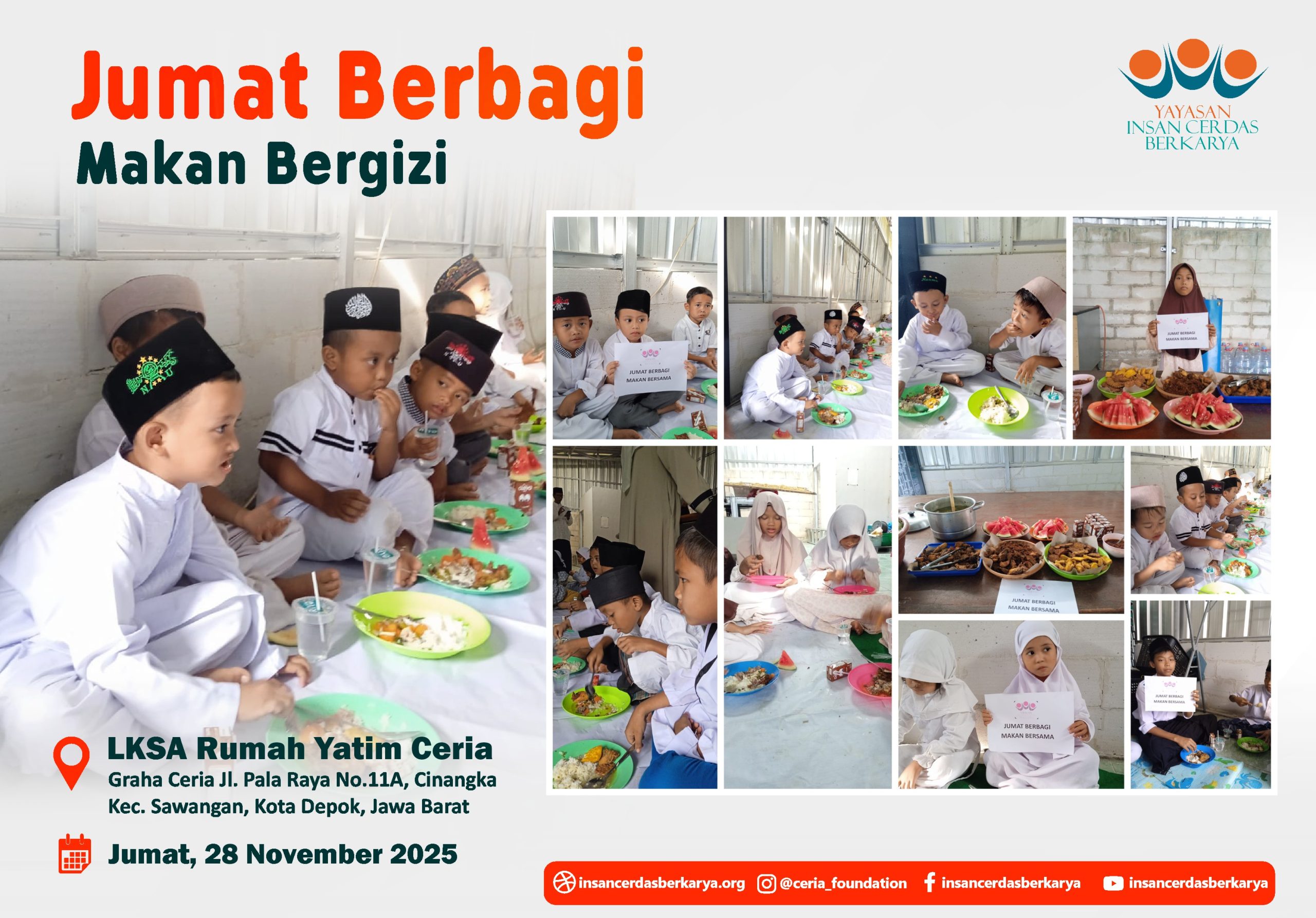 Alhamdulillah, sukacita dan rasa syukur atas terlaksananya kembali kegiatan rutin Doa Bersama dan Santunan “Jum’at Berbagi Makan BerGizi” pada hari Jum’at, 28 November 2025, untuk anak-anak binaan LKSA Rumah Yatim Ceria YICB di Cimanggu, Bogor.