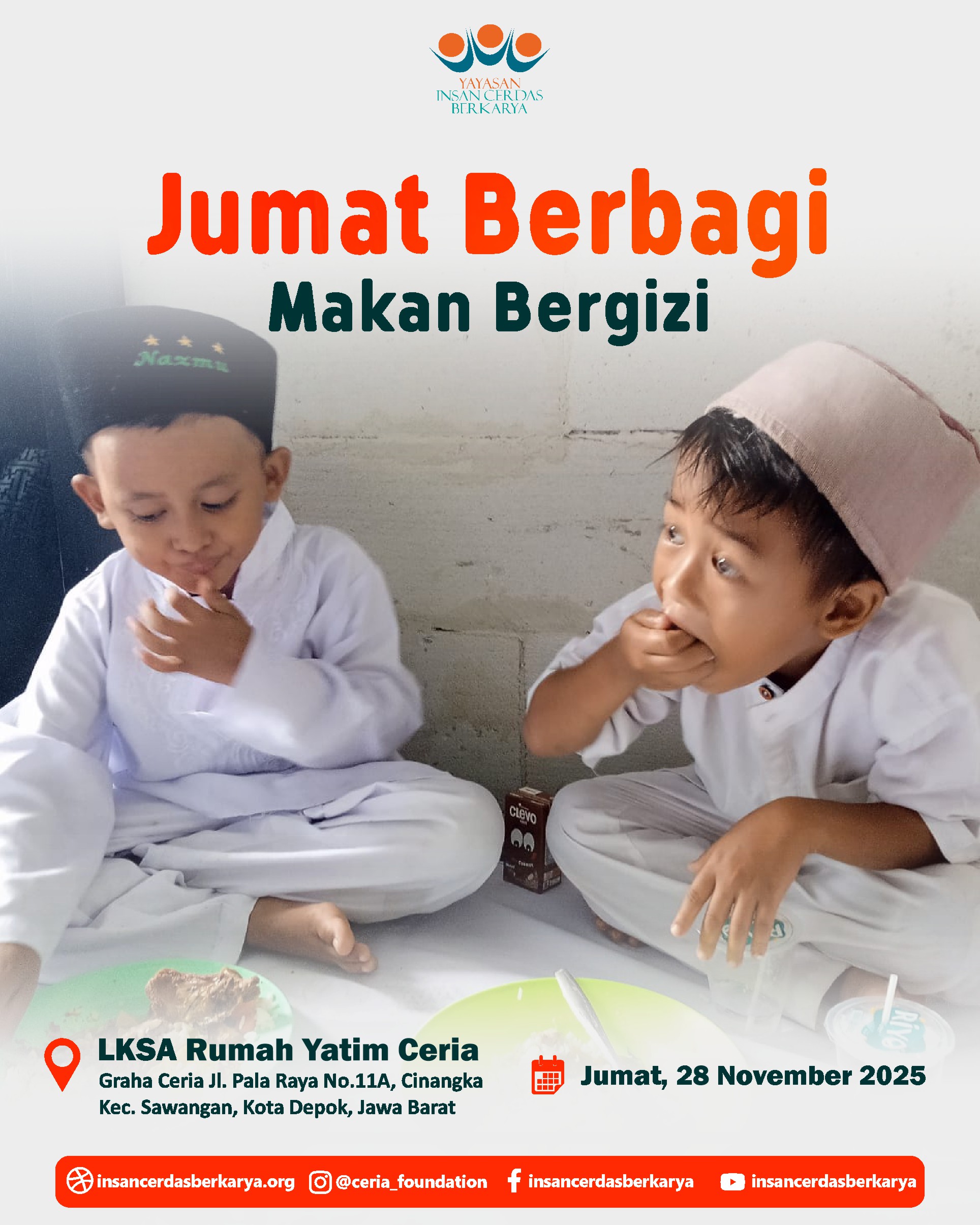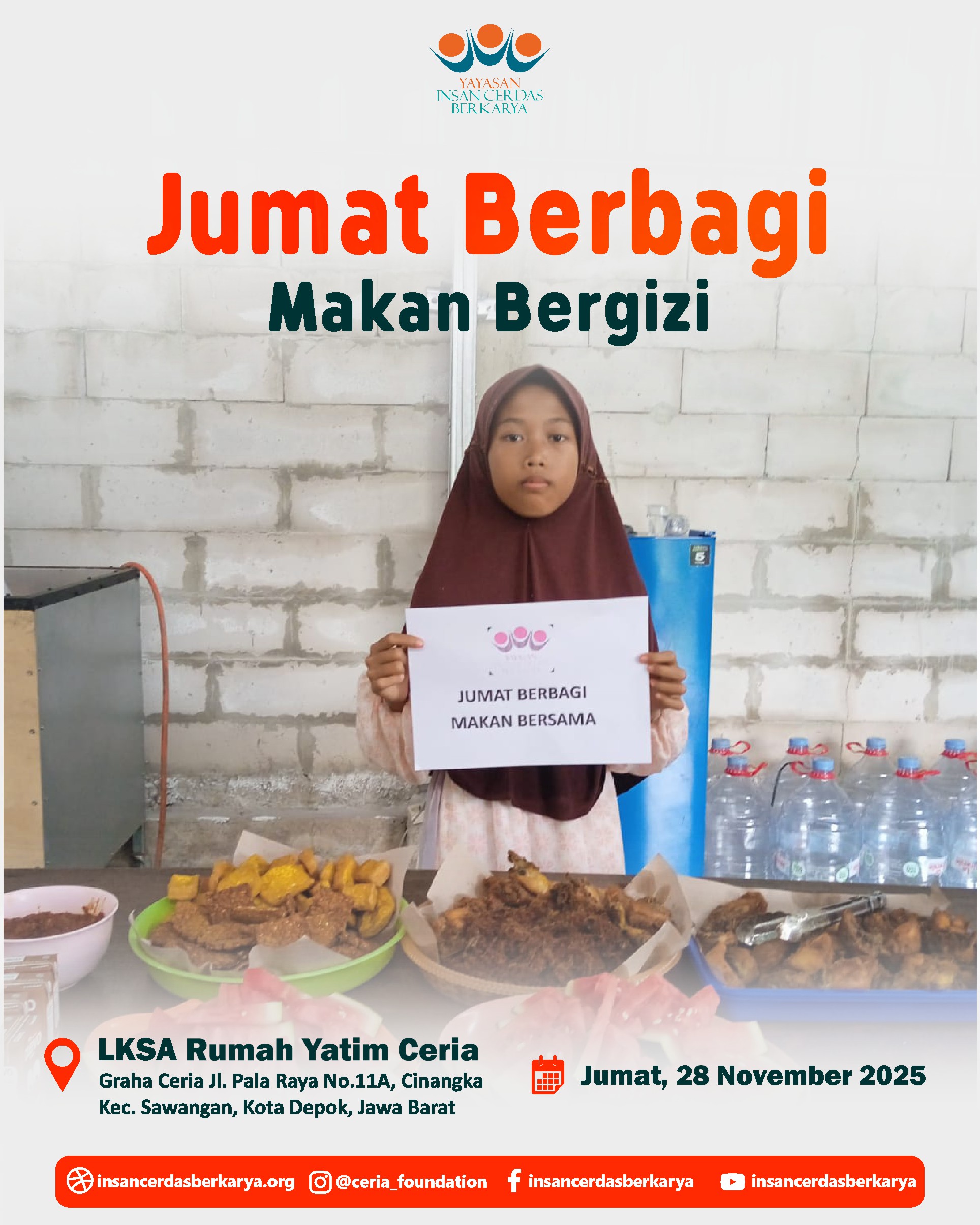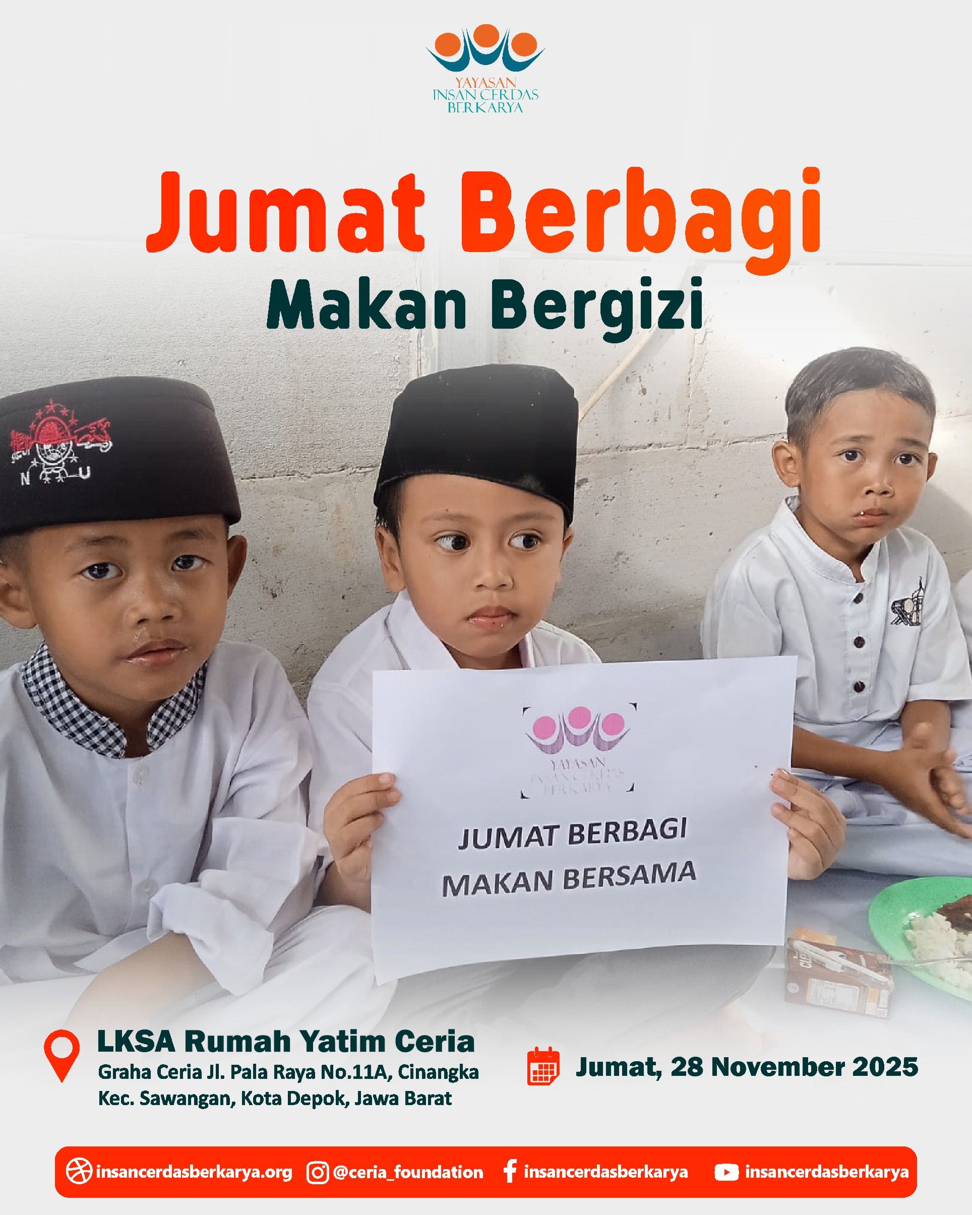 Alhamdulillah, sukacita dan rasa syukur atas terlaksananya kembali kegiatan rutin Doa Bersama dan Santunan “Jum’at Berbagi Makan BerGizi” pada hari Jum’at, 28 November 2025, untuk anak-anak binaan LKSA Rumah Yatim Ceria YICB di Cimanggu, Bogor.