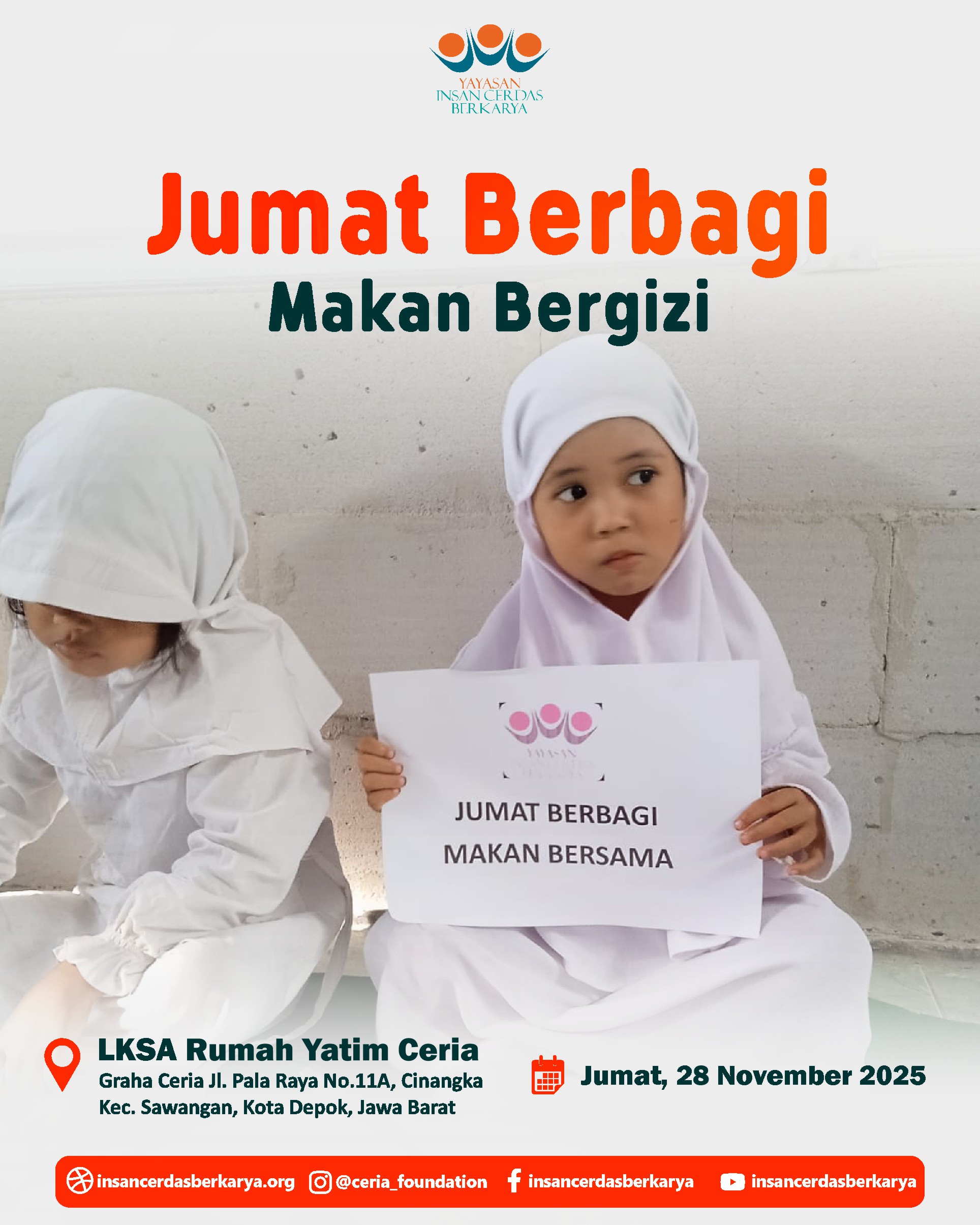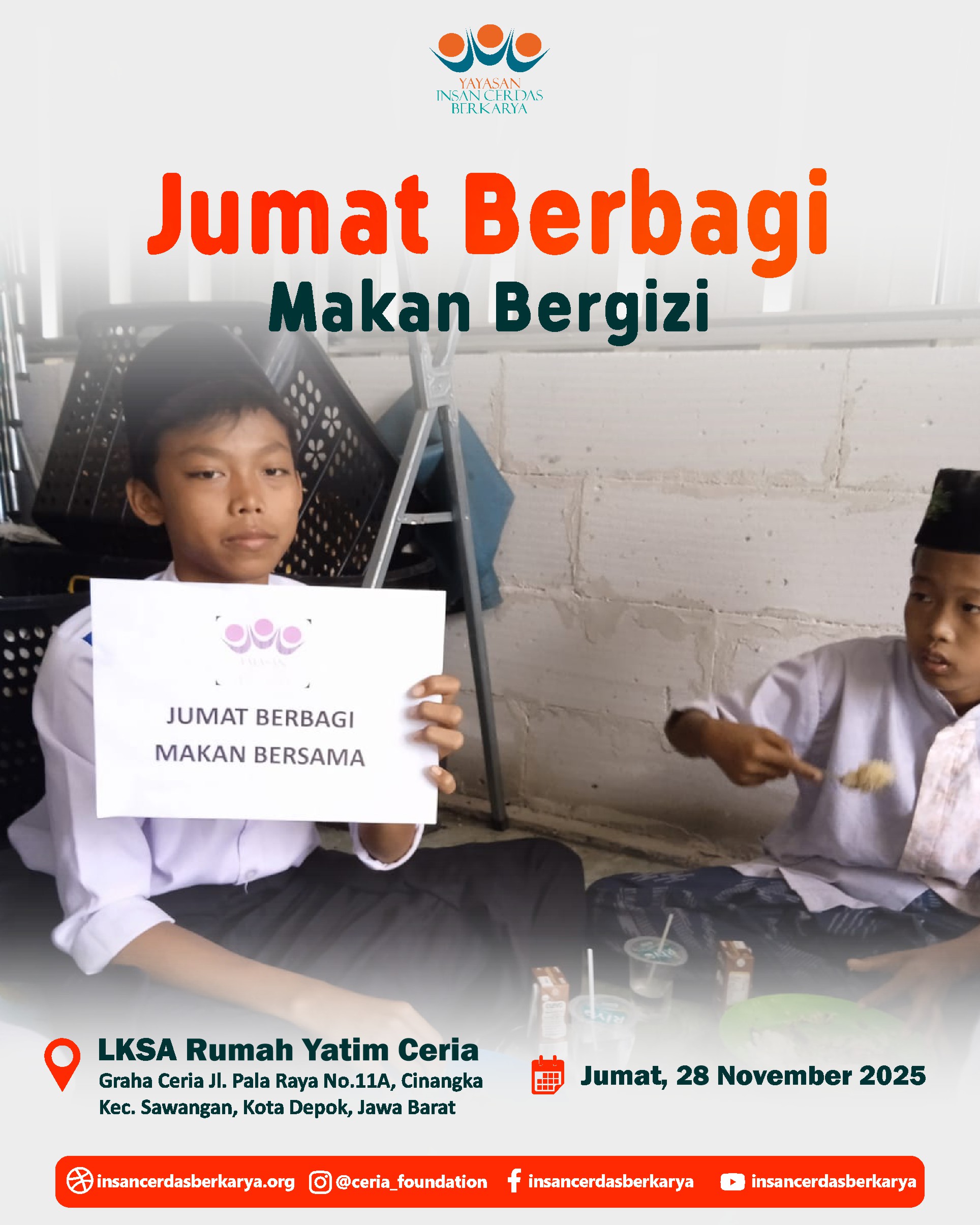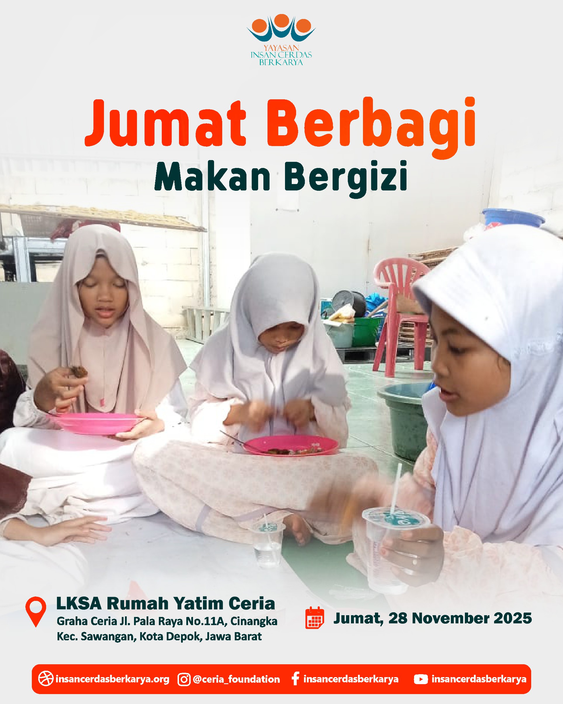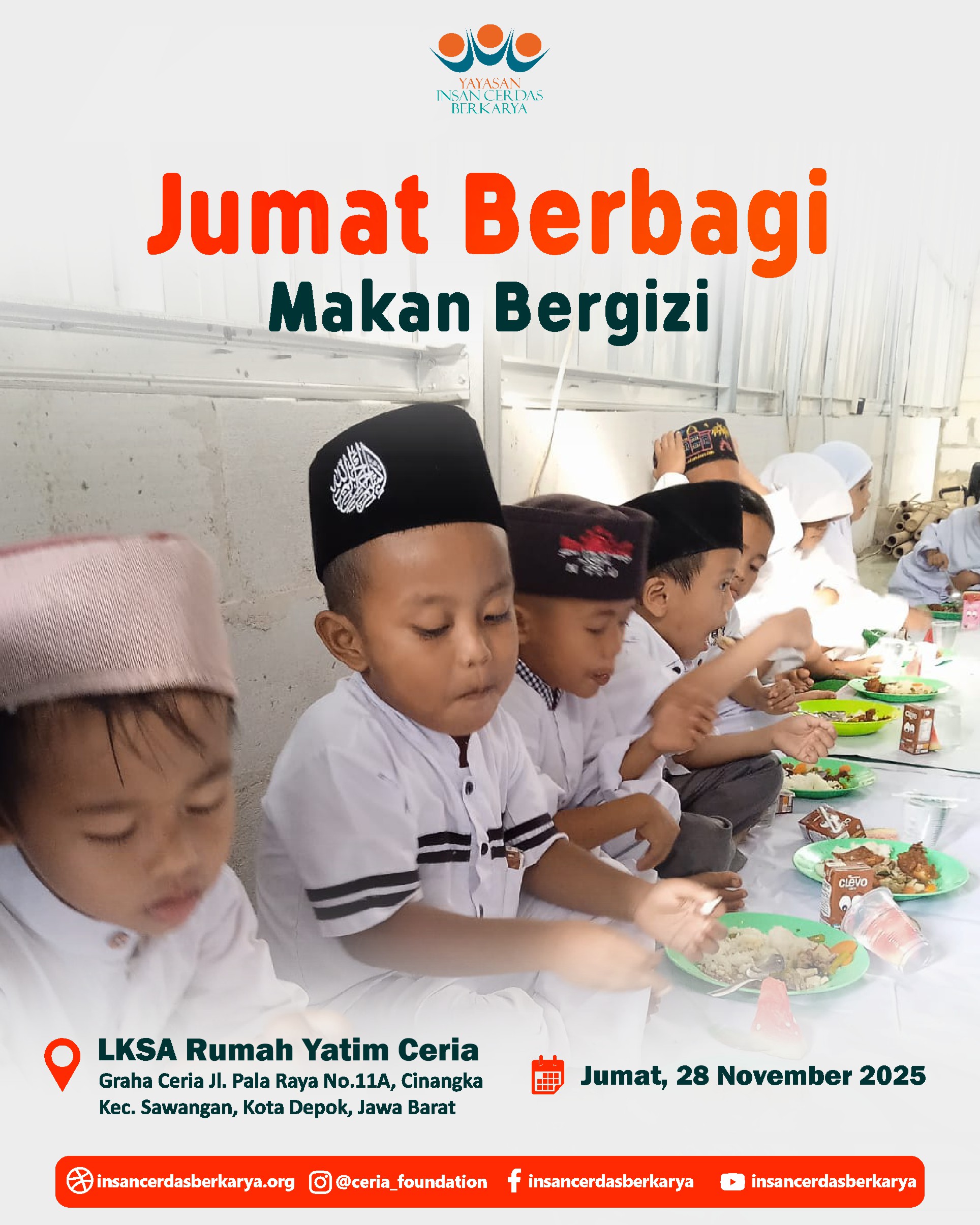 Alhamdulillah, sukacita dan rasa syukur atas terlaksananya kembali kegiatan rutin Doa Bersama dan Santunan “Jum’at Berbagi Makan BerGizi” pada hari Jum’at, 28 November 2025, untuk anak-anak binaan LKSA Rumah Yatim Ceria YICB di Cimanggu, Bogor.