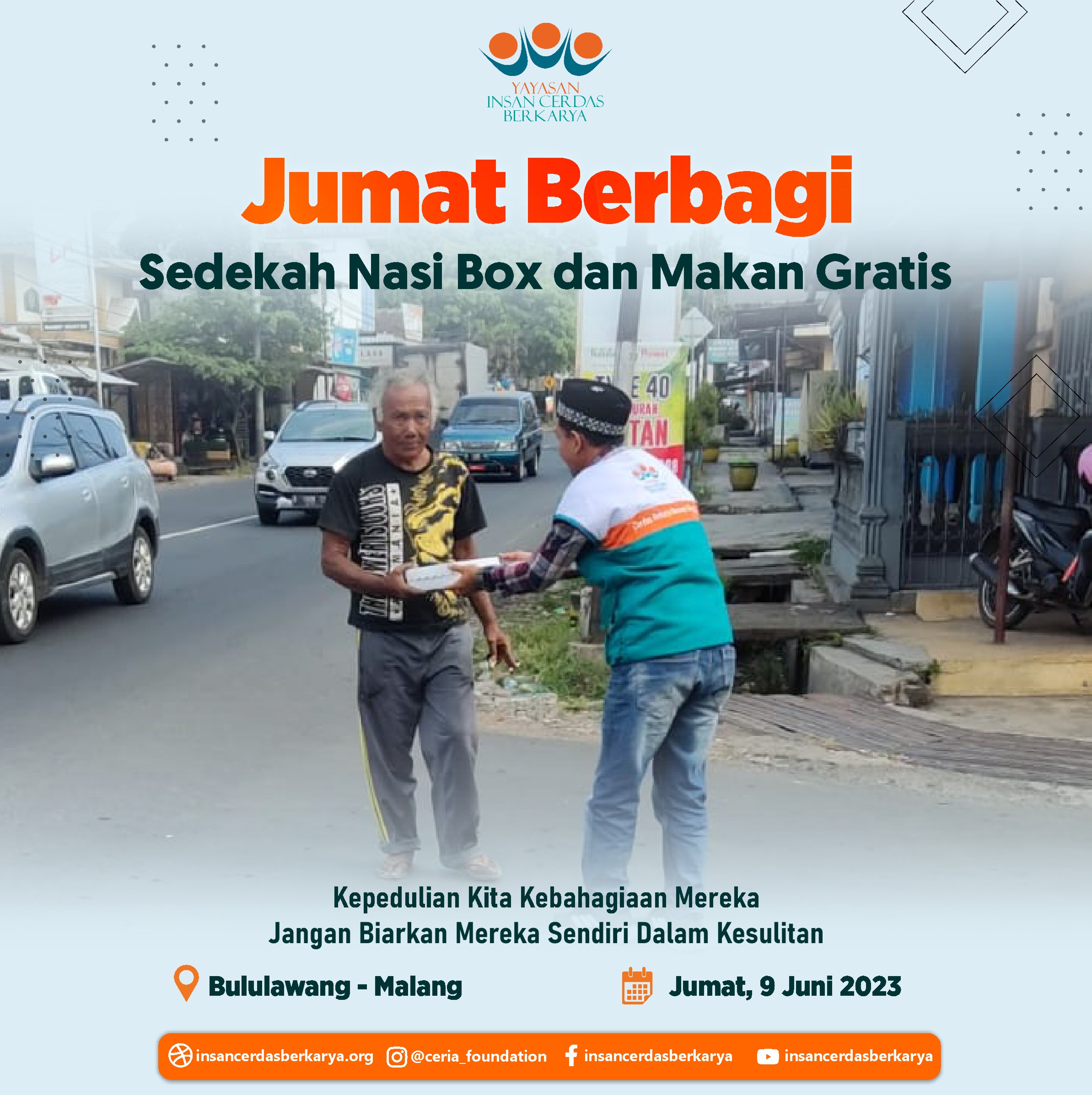 Alhamdulillah dengan rasa syukur atas segala karuniaNya telah terlaksana dengan lancar program makan gratis Jumat Berbagi YICB untuk adik-adik yatim dhuafa serta pengendara ojek online pada hari Jumat, 09 Juni 2023. Serta penyaluran nasi box kepada tukang becak, pemulung dan pekerja jalanan lainnya di Kec. Bululawang Kab. Malang, Jawa Timur.