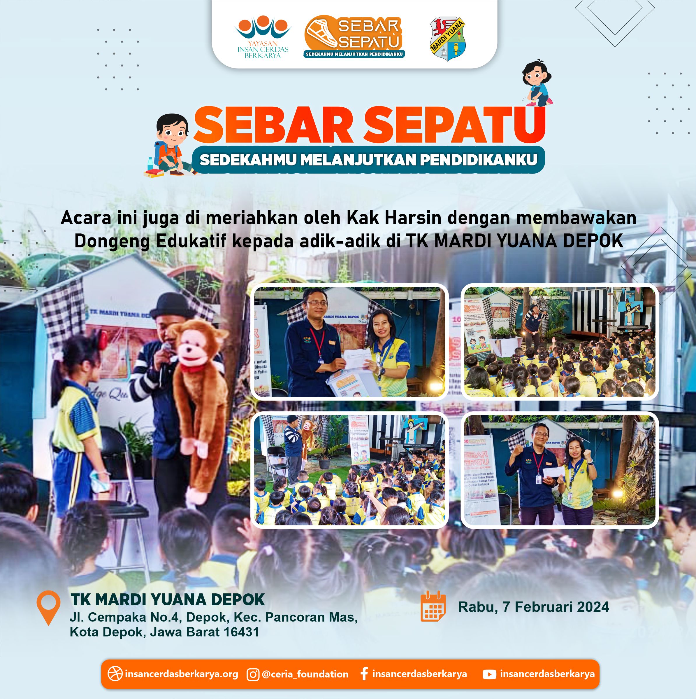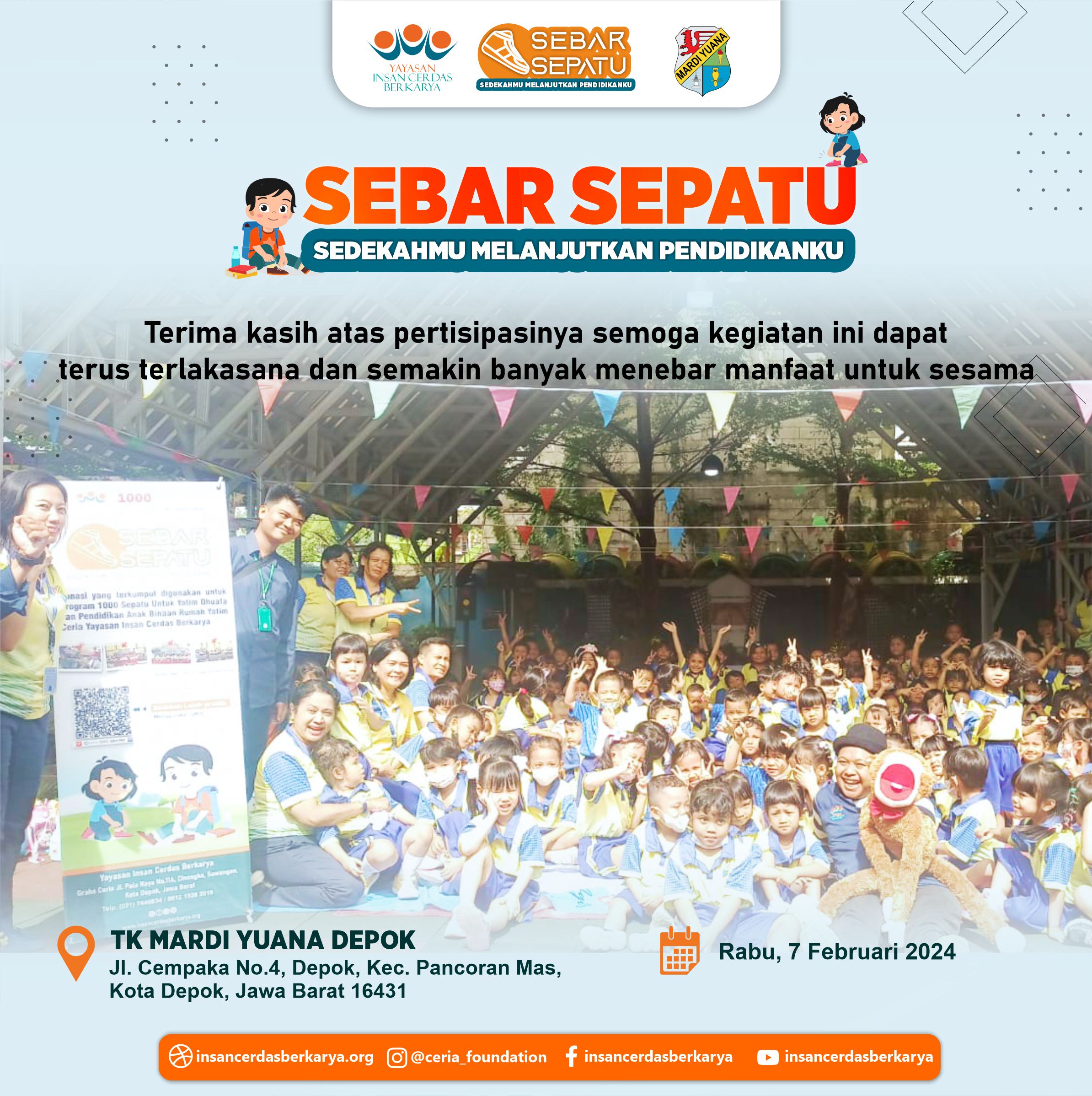 Terima kasih kepada adik-adik, orang tua dan para guru TK MARDI YUANA DEPOK atas partisipasi dan kepeduliannya kepada Program Sebar Sepatu Donasimu Melanjutkan Pendidikanku Semoga donasi nya bermanfaat dan dibalas kebaikannya oleh Tuhan YME Amin
