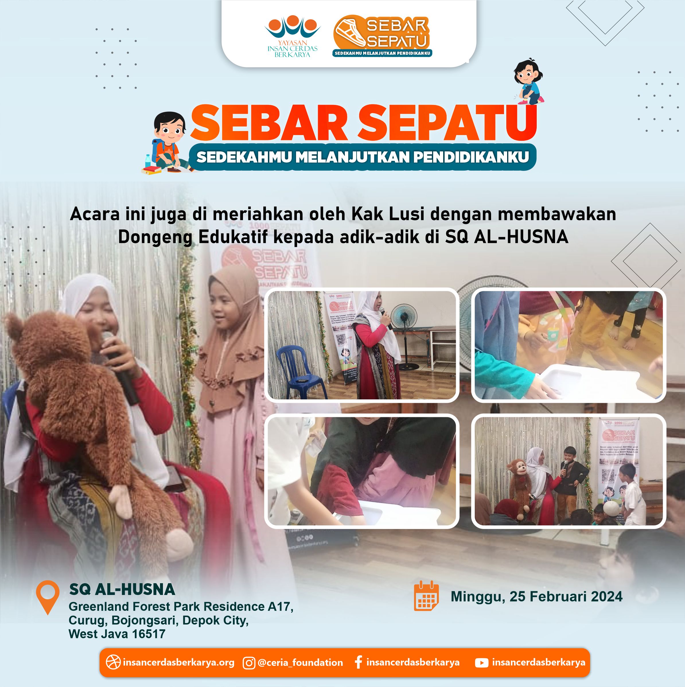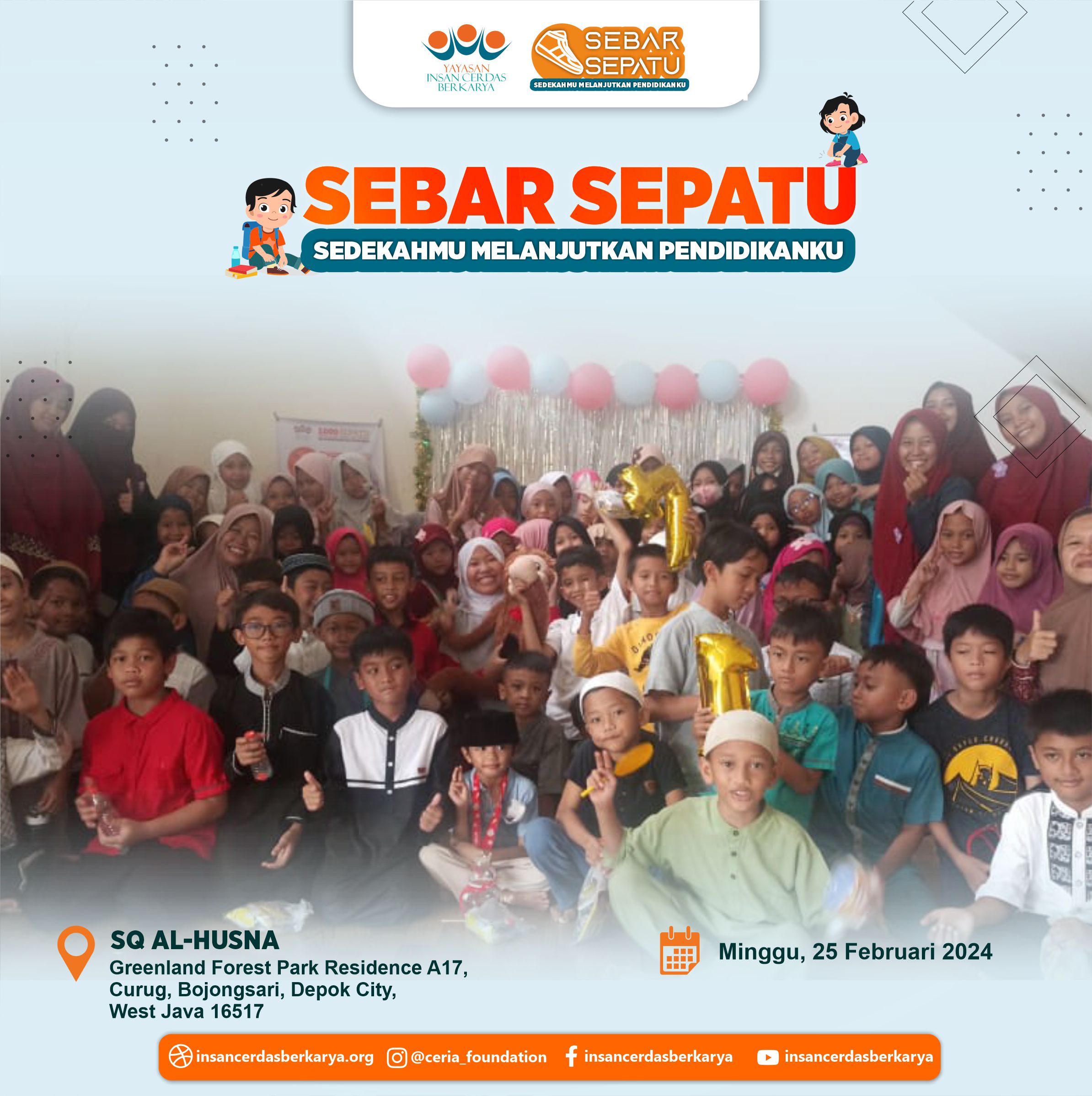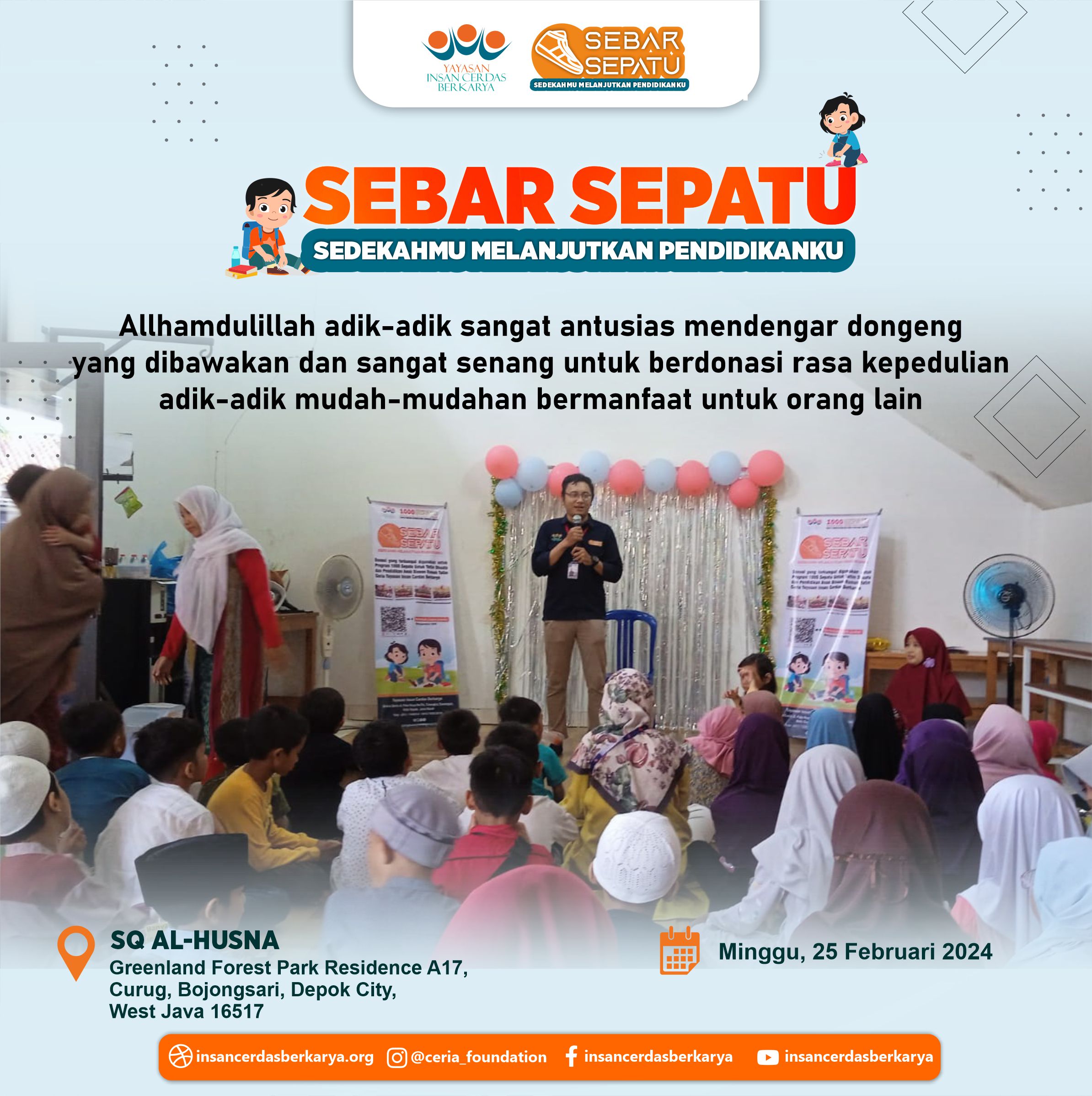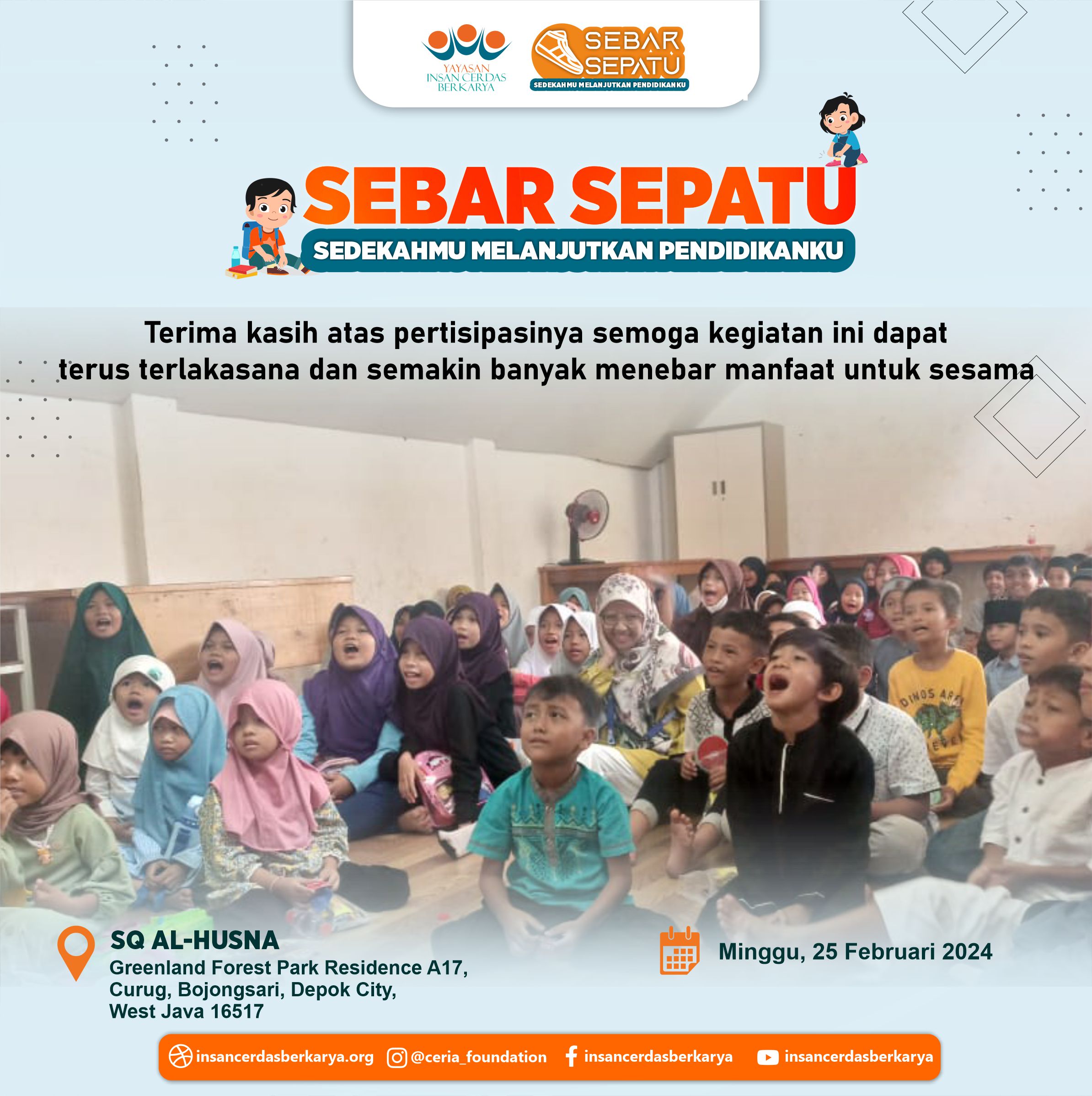 Terima kasih kepada adik-adik, orang tua dan para guru SQ AL HUSNA atas partisipasi dan kepeduliannya kepada Program Sebar Sepatu Sedekahmu Melanjutkan Pendidikanku Semoga donasi nya bermanfaat dan dibalas kebaikannya oleh Allah SWT Amin #sebarsepatu #yicb #pedulisesama #1000sepatu #insancerdasberkarya #donasi #sedekah #yatimdhuafa